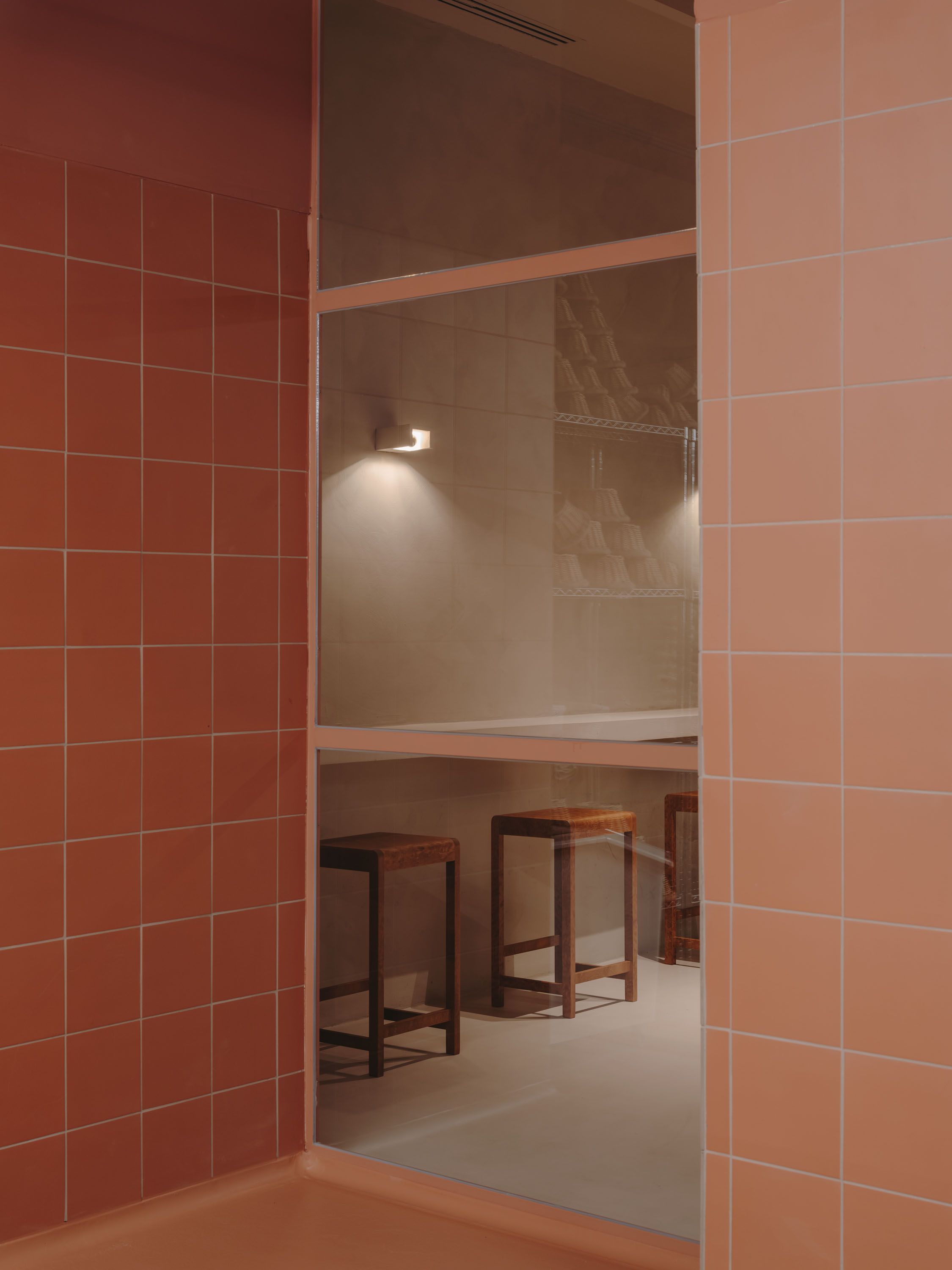 The goal was to make visitors feel part of the bakery. This space stands out for its terracotta tiled walls and a terracotta resin floor, full of ovens, mixers and work tables, all of them in stainless steel that stand out in that monochrome terracotta stain.