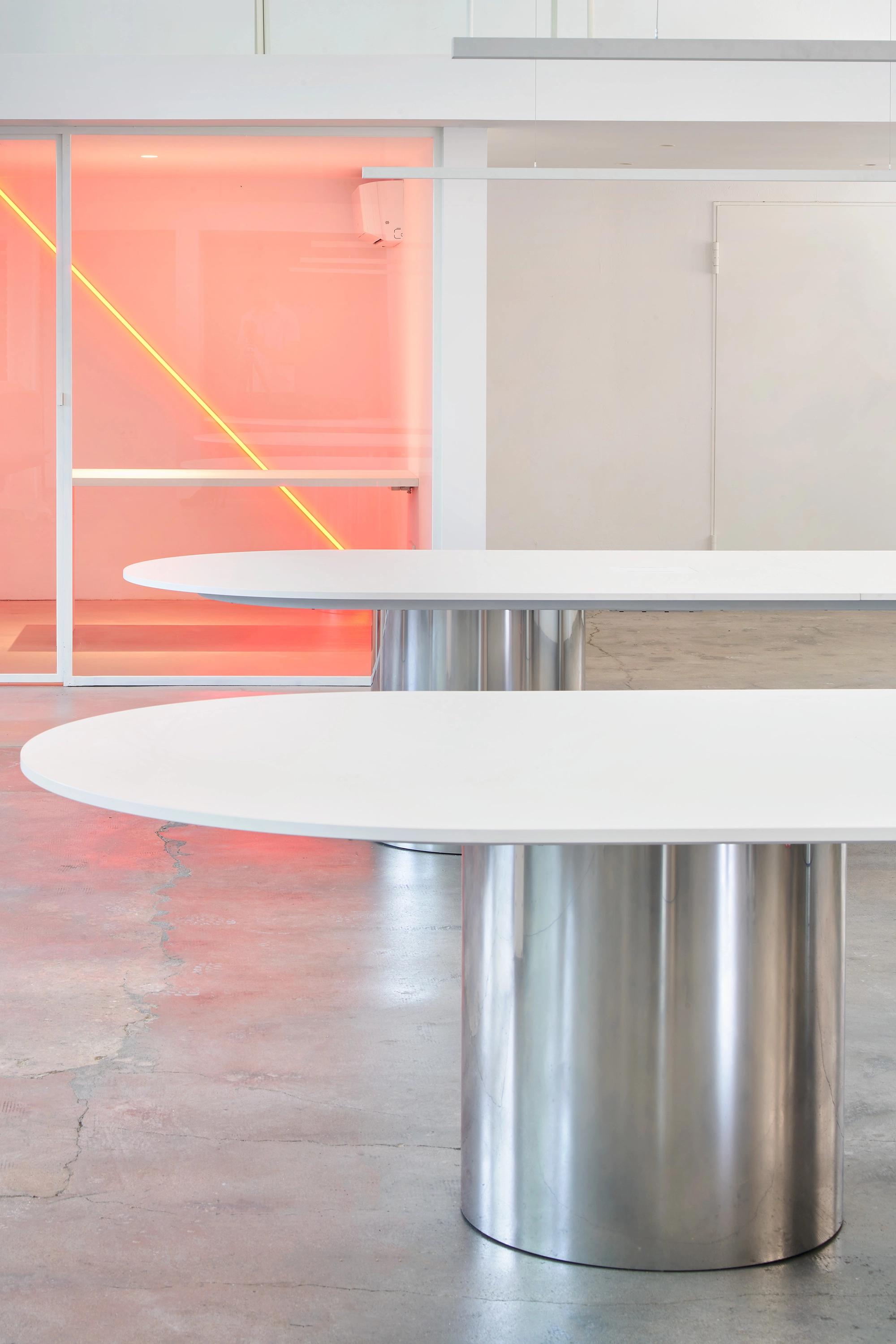 The concrete floor is polished and varnished to maintain the industrial atmosphere. The custom-designed tables consist of circular stainless steel legs and a large white top with a circular finish. The lamps are from Difusiona as is the entire lighting project. The windows were painted black to emphasize their rhythm. The lower floor has a large kitchen with 10x10 centimeters glossy terracotta ceramic tiles and poplar doors. Tables on wheels make up the dining area. Large central pillars separate the leisure area from the meeting rooms. All the original terracotta flooring is maintained original, only polished and varnished.
