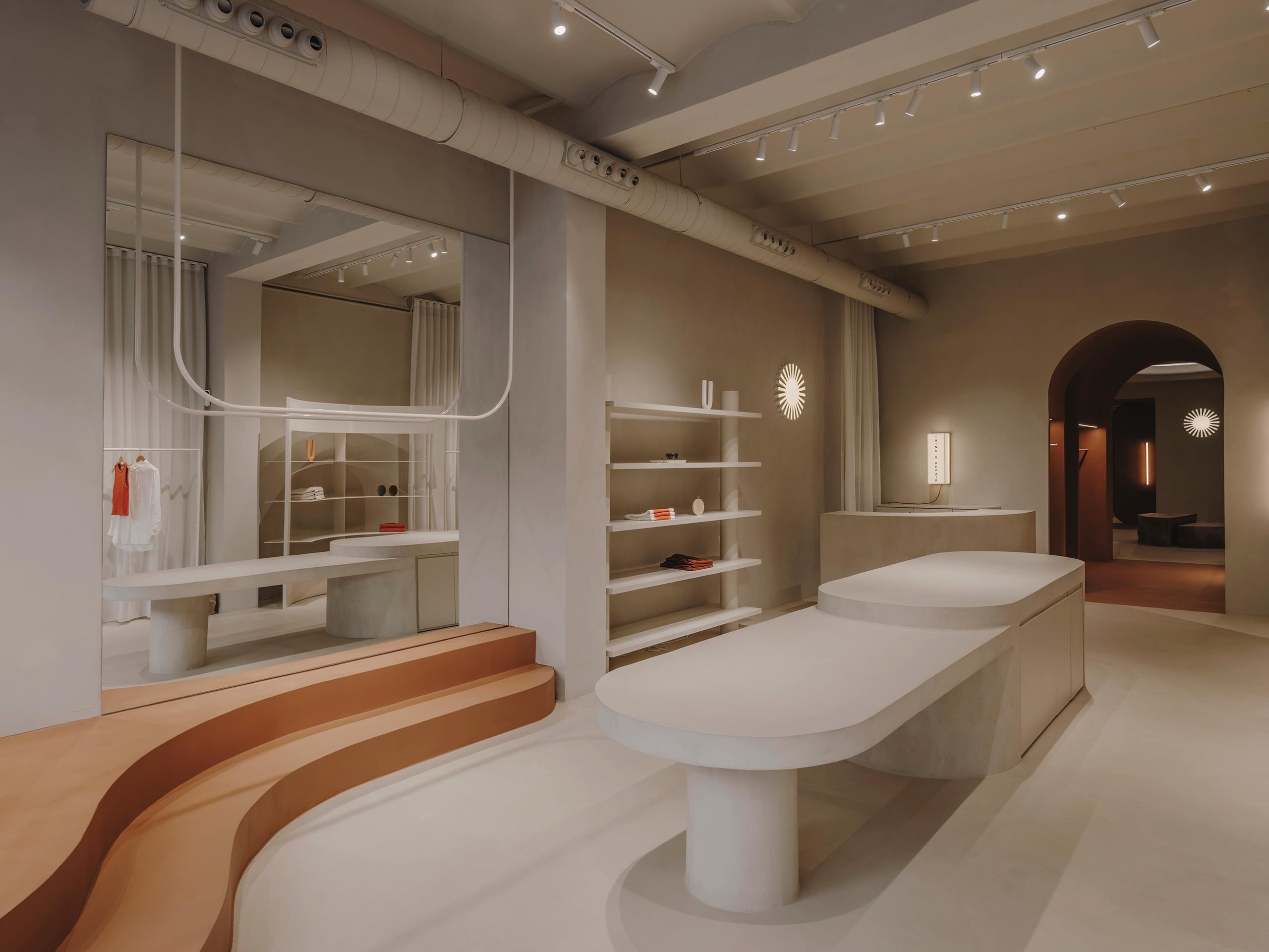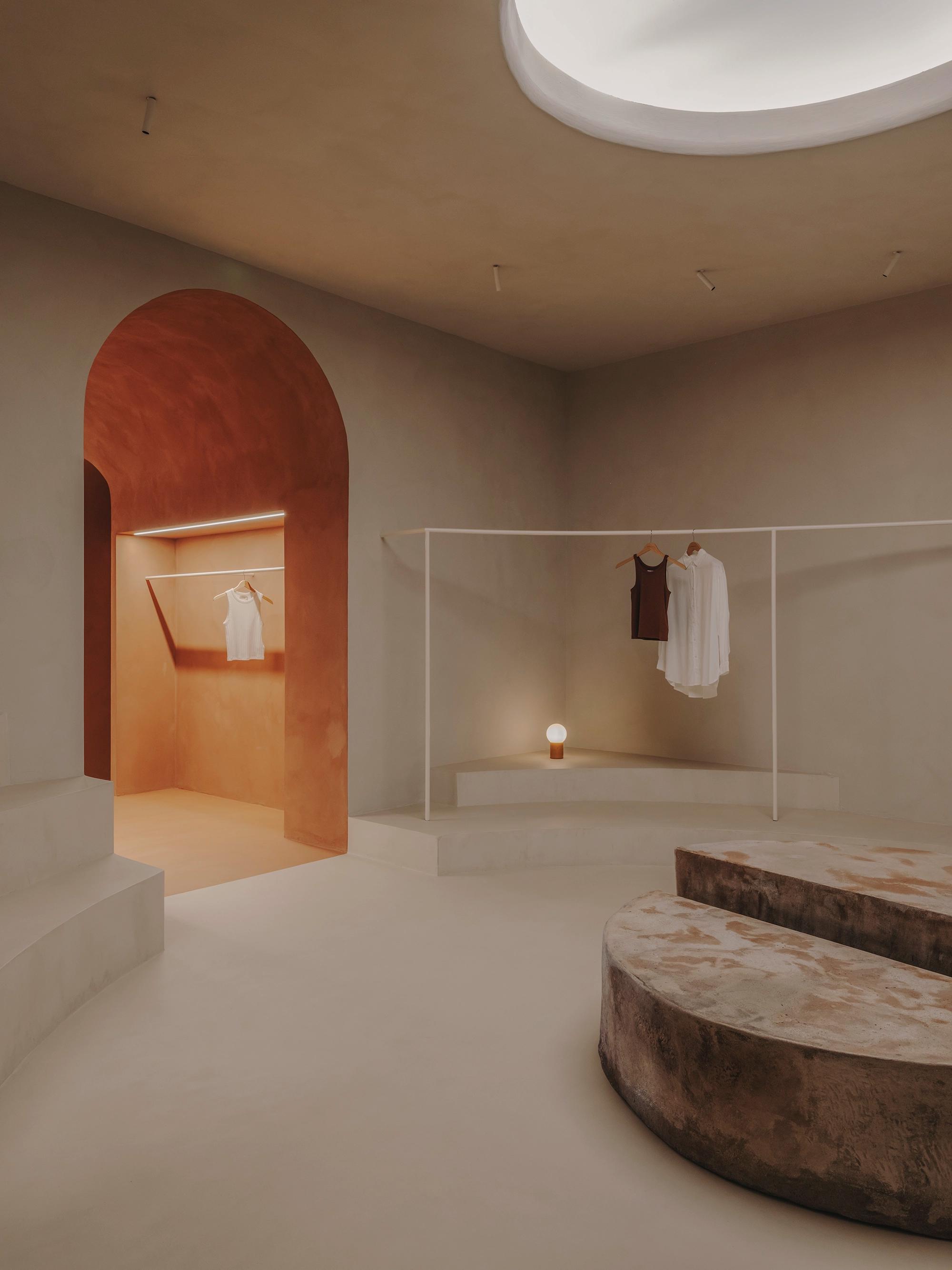 As you move towards the main area of the store, you can see custom-designed display elements. Like the products sold by the brand, all the furniture in the store is conceived as a work of art, elements that not only serve a practical function but are also sculptural pieces. As you pass through the main area of the store, you can see an enveloping tunnel that transitions to the next space. This tunnel stands out for its terracotta finish, a color that will be repeated in various elements of the space to generate continuity.
