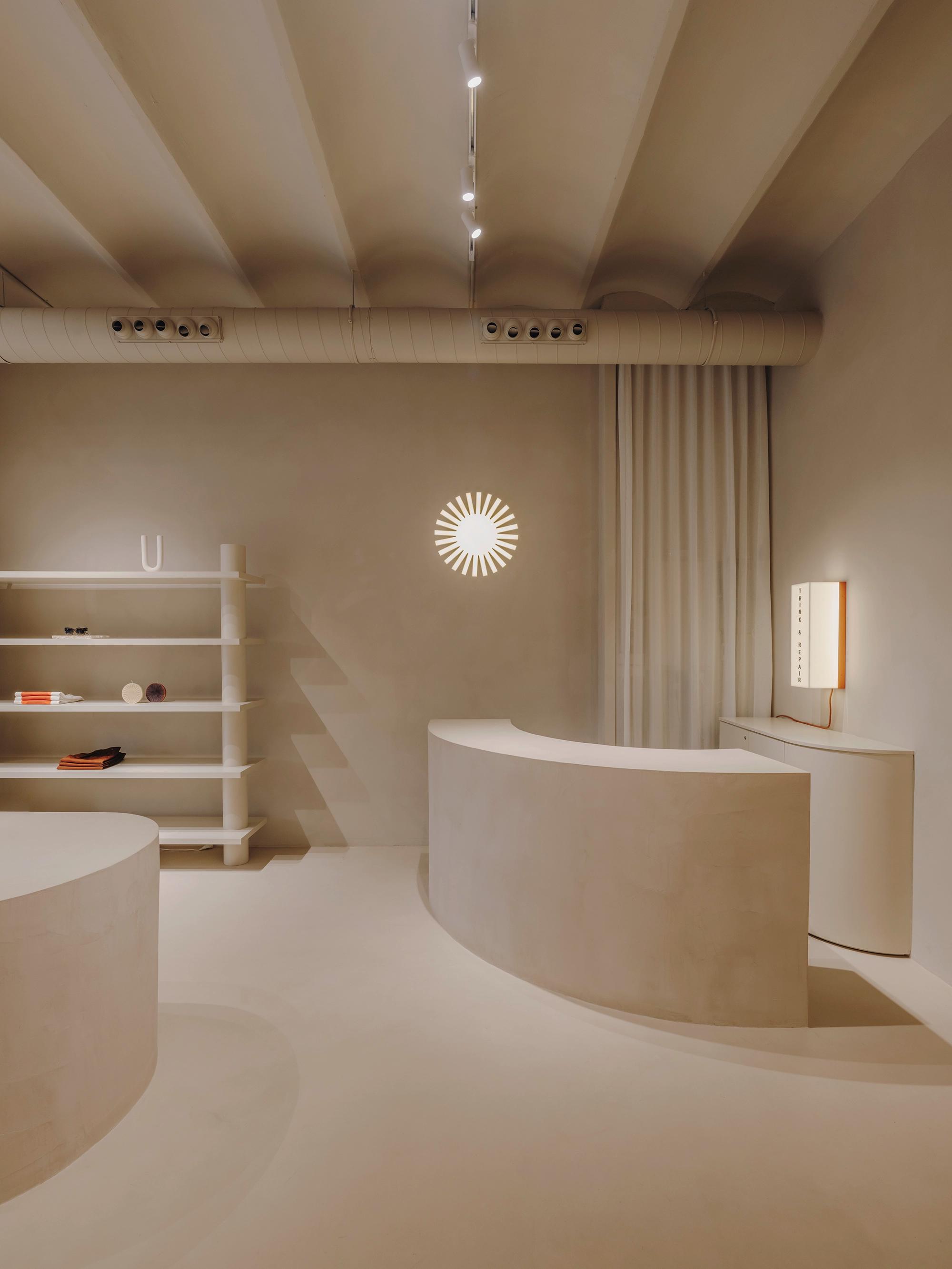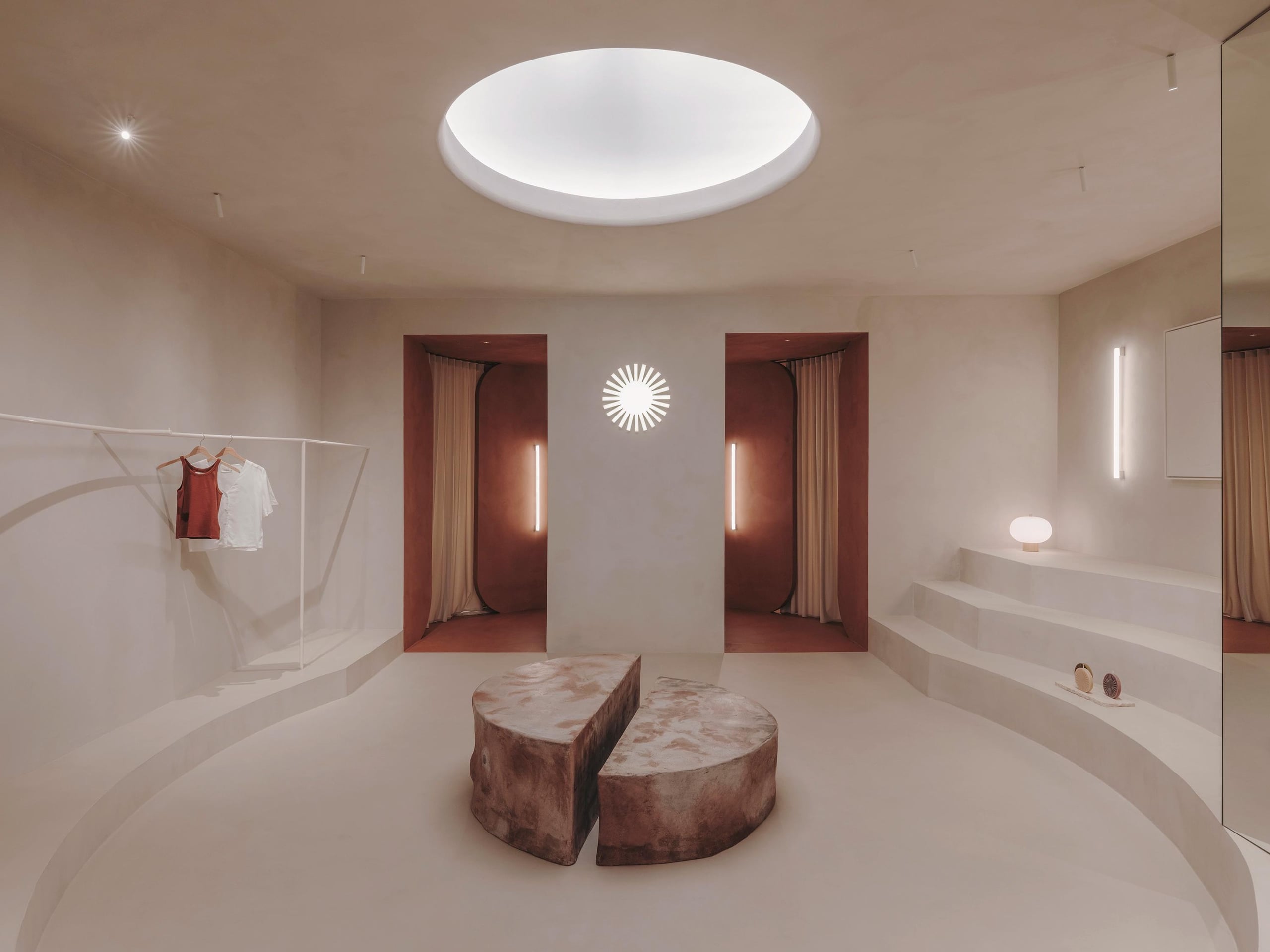 After crossing the tunnel, the user enters a space of the store whose main aesthetic is that of a dreamlike place, outside of what one is accustomed to seeing in the real world. Located in Barcelona, a city of constant movement and exchange, the store includes an area for events and presentations. Curved stands are designed that resemble those of an amphitheatre. A large circular opening in the ceiling radiates a subtle light using a backlit fabric, contributing to this idea of creating a dream space. Underneath this zenital light is a sculpture by Sara Regal that functions as an exhibition coffee table. This piece was created from the rubble generated after the renovation, once again emphasizing the principles of sustainability that represent the brand.