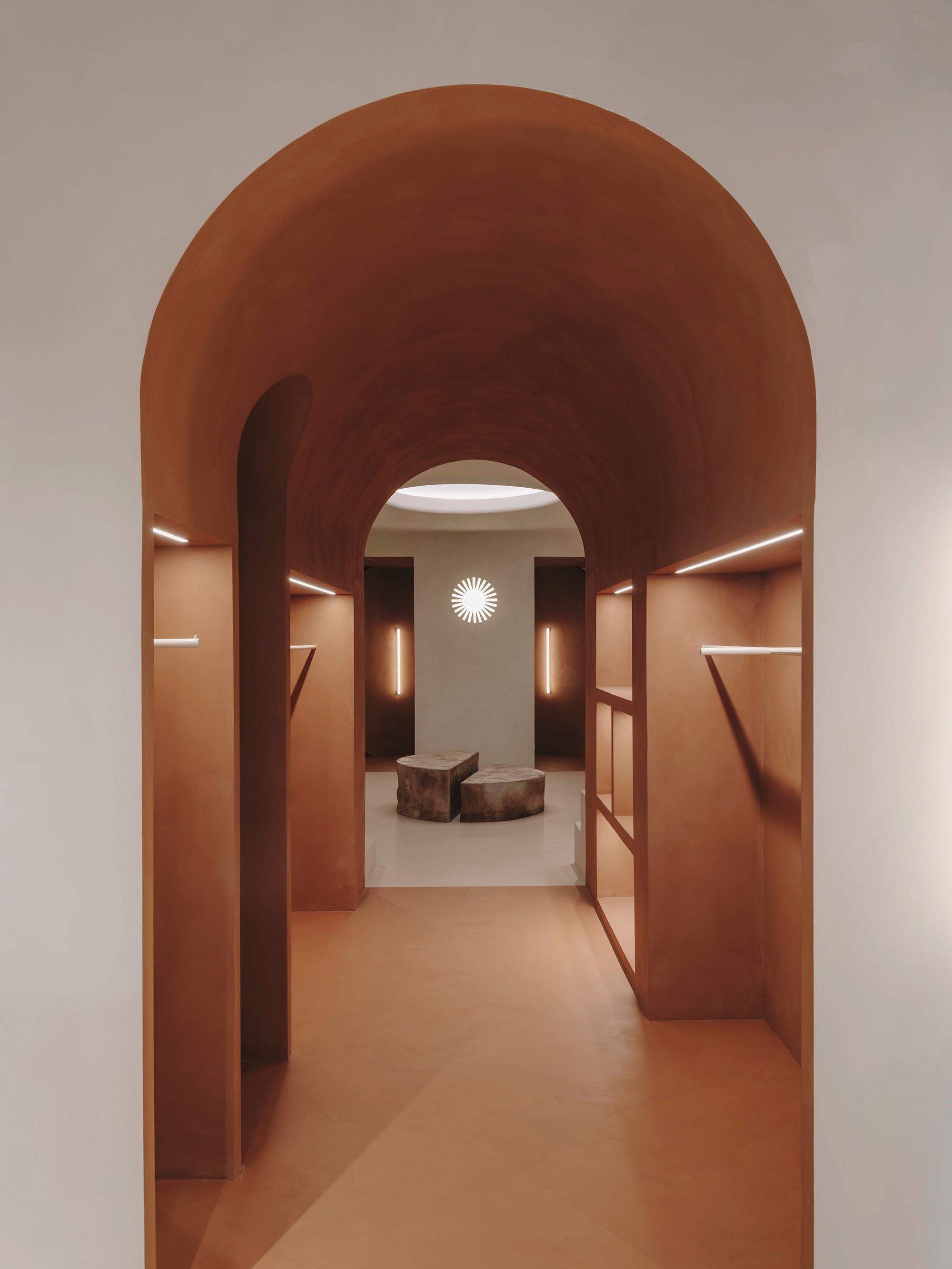 In this case, the terracotta finish is achieved using a clay mortar paint, it is a sustainable product with much less environmental impact than conventional paint. From the other side of the tunnel, you can see a mirror that seems to replicate the tunnel through its reflection, thus bringing infinity to the space. It is the combination of colour along with the dreamlike shape that the tunnel offers us the details that manage to make the space not only serve to display a product but also generate a sensory experience for those who visit it. A space that allows exploration, the play of perception and imagination.