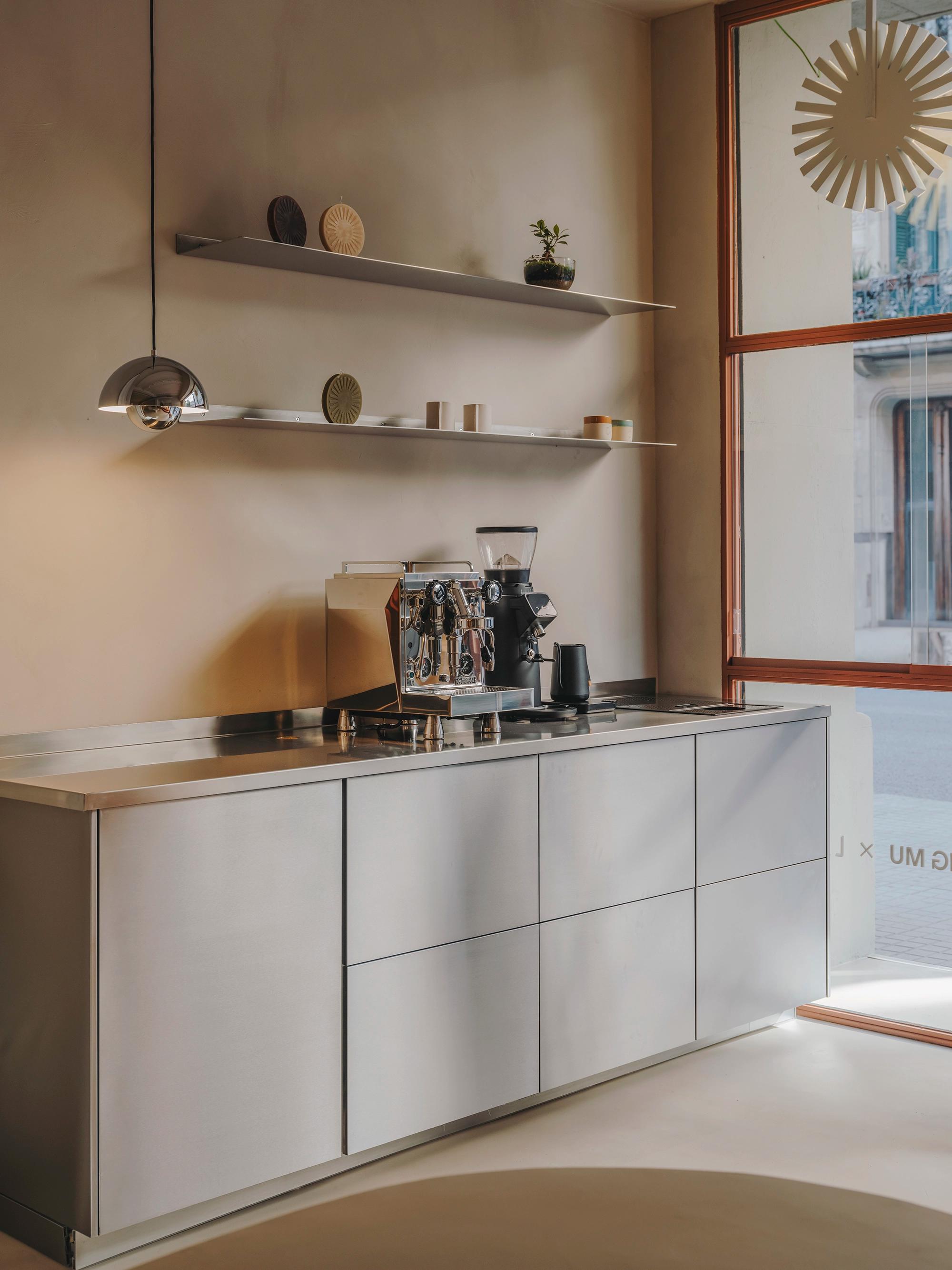 The glass facade represents the concept of openness to the city, inviting visitors to enter and explore. From the outside you can see the products of the brand that act as pieces of art that capture the attention of those who walk through the area. The use of terracotta color in some of the facade elements makes the store stand out in the urban context.From the entrance stands a sign illuminated with a sun representing the brand logo. It is also possible to generate an atmosphere of community and interaction through the practical closure that allows to serve coffee that is sold in the shop directly to those circulating in the area