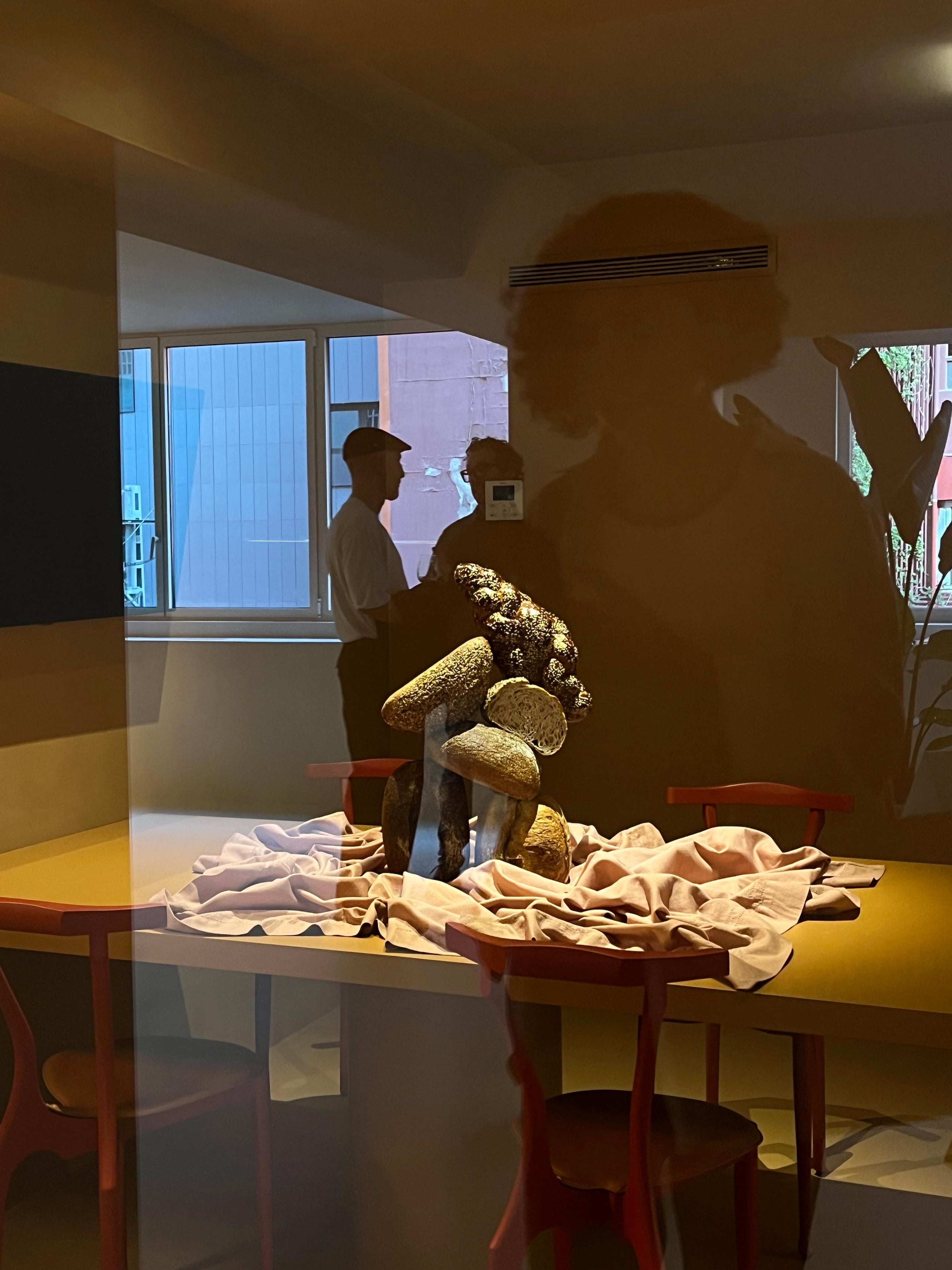 Dada la naturaleza de la empresa, la cocina se erige como el núcleo central de este proyecto, destacando su importancia fundamental. Para subrayar este rol crucial, la cocina se ha diseñado como una verdadera escultura, con un enfoque especial en su imponente isla central. El material elegido para la base de la isla, el mármol rojo Alicante, genera un contraste impactante con el resto del espacio, el cual está teñido en tonos lino, realzando así este elemento clave. Gracias a esta isla central, la cocina no solo se convierte en un espacio altamente funcional, permitiendo una circulación fluida, sino que también se transforma en un punto de encuentro que fomenta la interacción social. Este diseño no solo resuelve necesidades prácticas, sino que también crea un ambiente acogedor y social, pareciendo a su vez una pieza de arte. Uniendo practicidad y belleza en una única pieza. A partir de este núcleo, el proyecto fluye de manera orgánica, integrando sutiles referencias de la cocina en todo el espacio, manteniendo una cohesión estética y temática.
