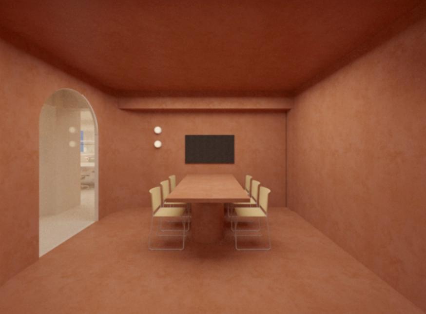 La sala de reuniones se distingue por la forma única de su entrada y su paleta de colores. Las dos puertas en forma de arco no solo aportan un sentido escultórico, recordando a una obra de arte, sino que también ofrecen la privacidad necesaria para las reuniones. Desde el exterior, estos arcos permiten vislumbrar el color terracota del interior, haciendo referencia una vez más al elemento central de la cocina. Este color terracota no solo conecta visualmente con el núcleo del diseño, sino que también crea un ambiente íntimo y cálido, ideal para reuniones productivas y cómodas.