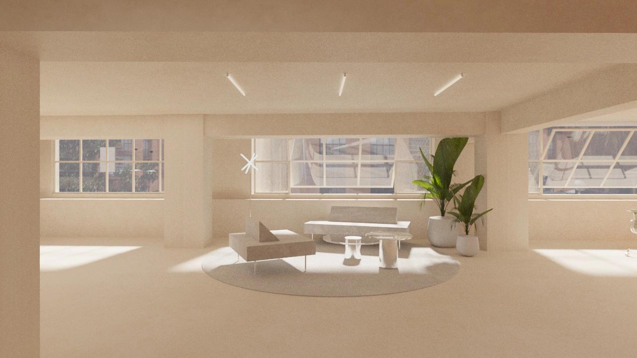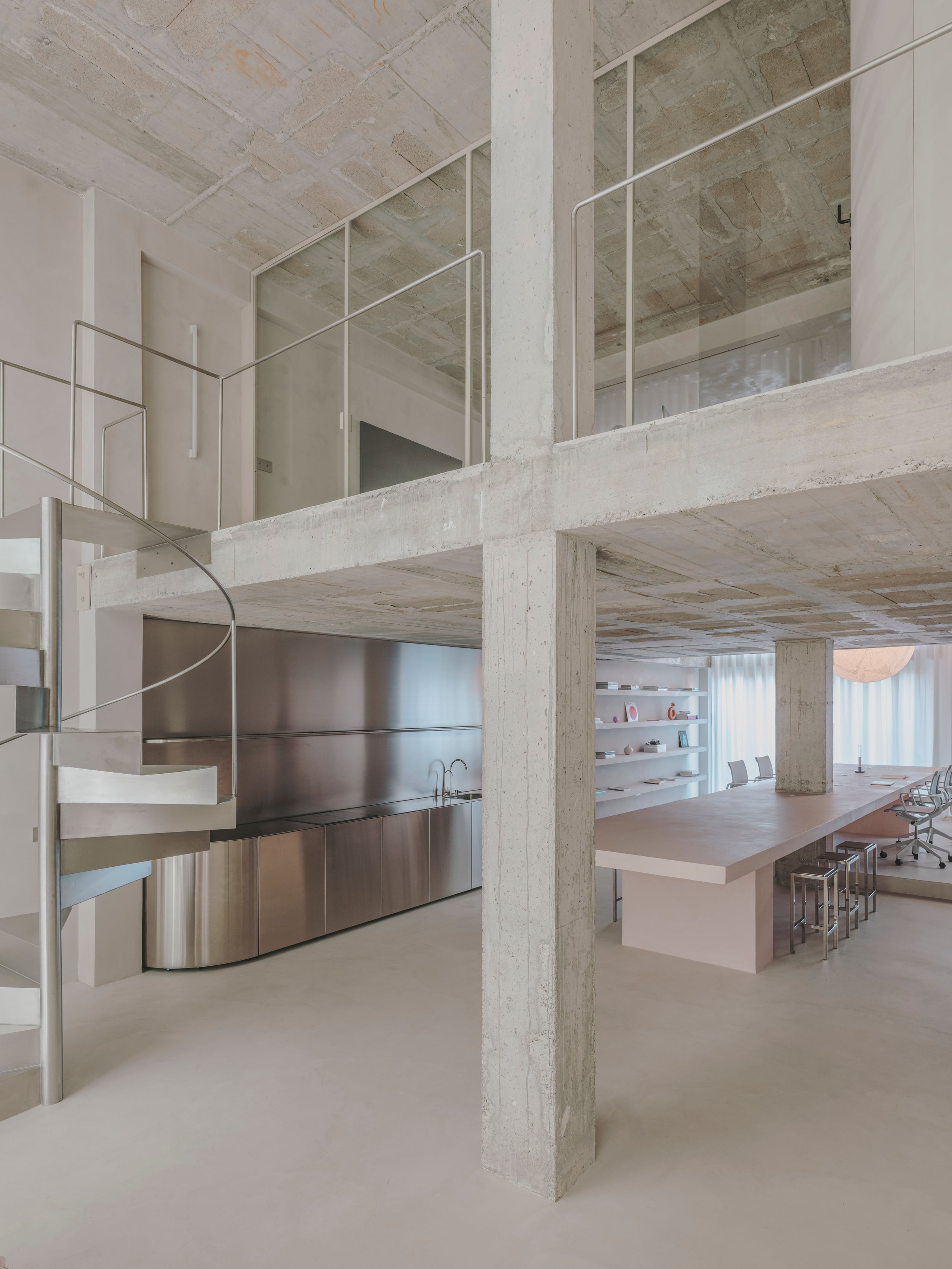 Este proyecto coloca la cocina en el centro, desde donde se conectan todos los espacios. A través de este espacio, se busca reflejar el crecimiento y la madurez que la empresa ha logrado en estos diez años. Además, el diseño se ha pensado para ser funcional y para el bienestar de los trabajadores. Este punto de color, innovación, elegancia y artesanía que nos aporta el bloque de mármol invade el resto del espacio convirtiéndose en diferentes elementos. Una mancha de color y textura en el interior de la sala de reuniones y de los baños, generando un contraste respecto al resto del espacio. Y unas columnas de mármol macizas a modo de pata para las mesas de trabajo. Podríamos decir que estas son las piezas que destacan y se mezclan en un espacio que es neutro, sereno y muy arquitectónico.