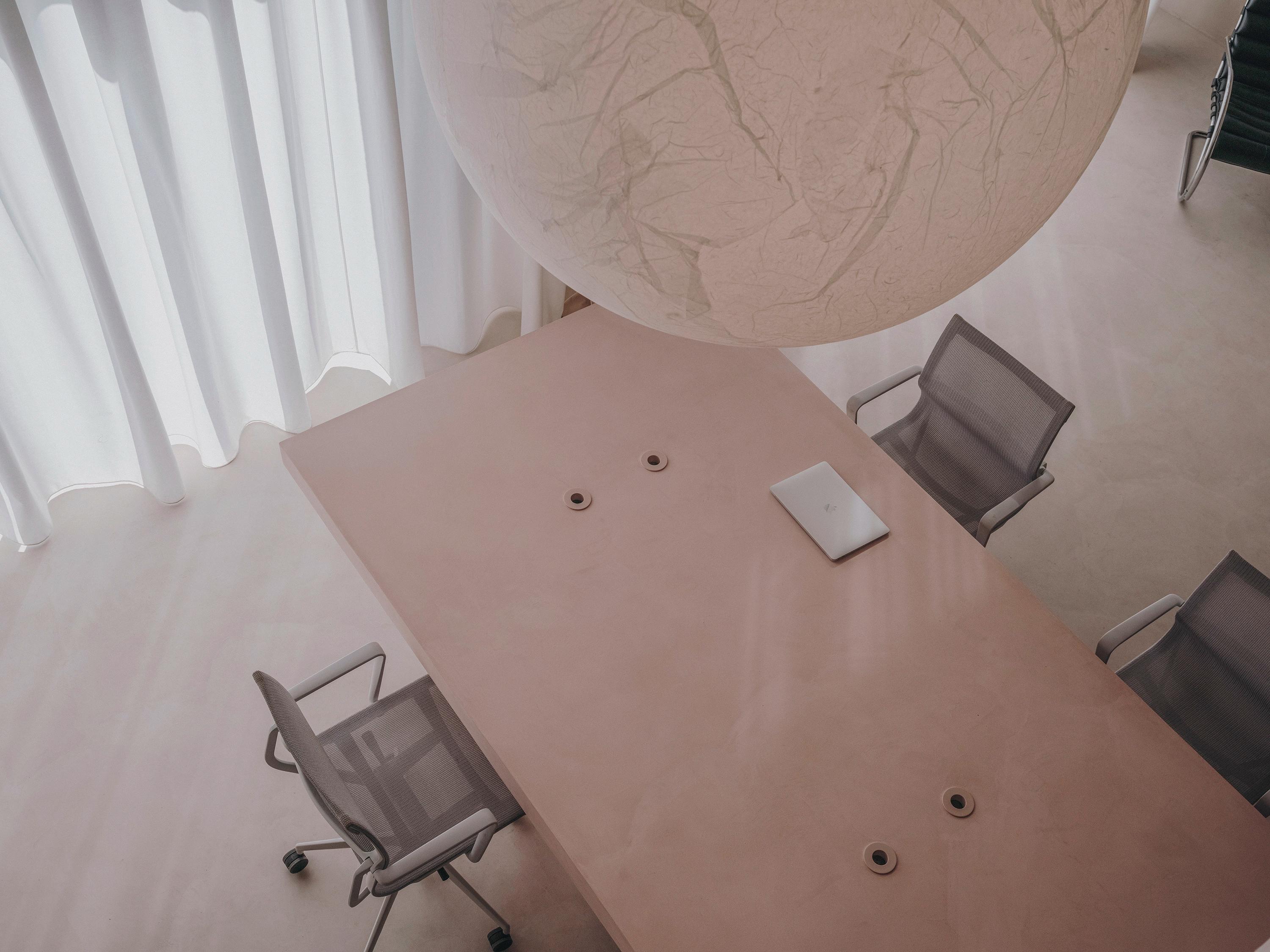 El espacio se estructura con una gran mesa central de hormigón sujeta a uno de los pilares. Queríamos diseñar una mesa continuara por todo el espacio. Una mesa que funcionara como espacio de trabajo y comedor. Como queríamos mantener la mesa al mismo nivel y enfatizar la continuidad de la mesa decidimos elevar el suelo de la zona de trabajo, lo que a su vez nos ayuda a pasar el cableado al rack y refuerza los límites de uso desde la arquitectura. El color rosa de la mesa le permite destacar en el resto del espacio monocromático. Es la pieza central del estudio su forma respeta la arquitectura existente del espacio. Evitando curvas o elementos ornamentales, decidimos utilizar líneas rectas y formas geométricas para reflejar el resto de la arquitectura. Un elemento que se hizo insitu y que tiene el color que siempre usa Andres Reisinger en sus proyectos.