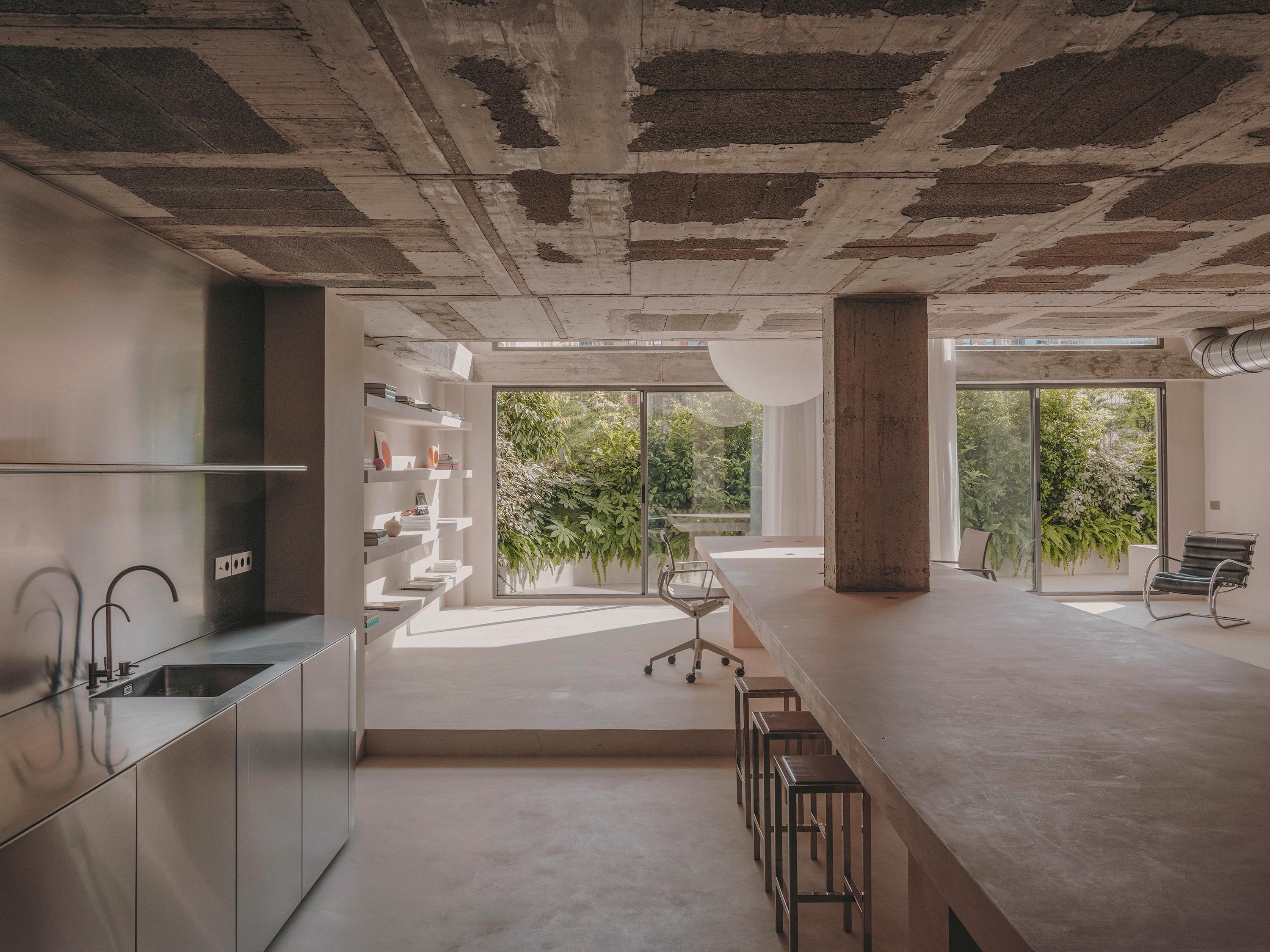 The intervention aims to design a workspace through elements influenced by the existing architecture. A raw space where the concrete structure is exposed in its most natural state. We experimented with the counterpoint of the elegance and sophistication of the elements that structure the space, treated as true sculptures made of stainless steel, the staircase that bridges the verticality of the space and the kitchen in its horizontality. These elements are inspired by the digital world of Andrés Reisinger, and evoke a surreal, dreamlike and sculptural space.