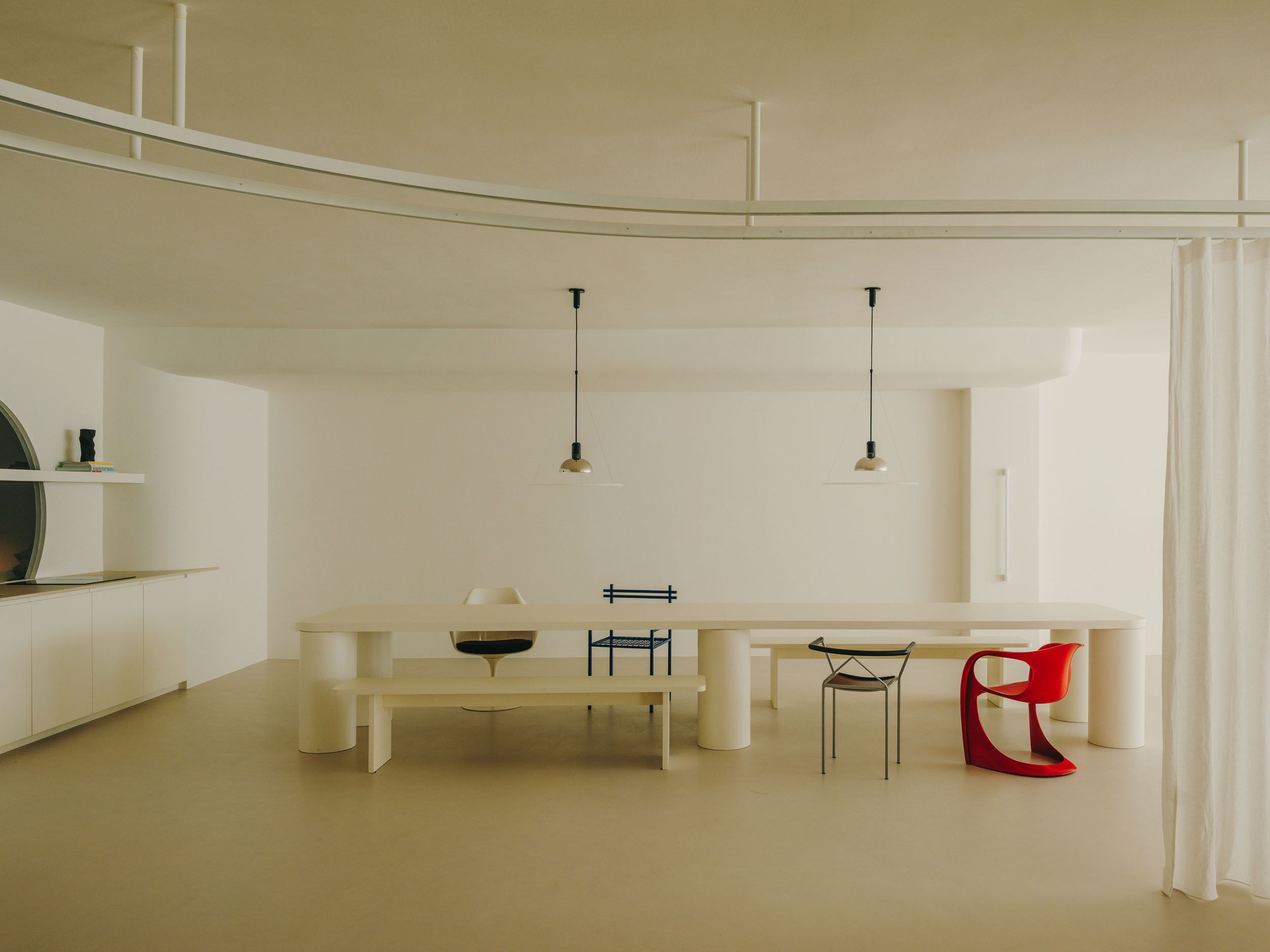 On the other side, we find the kitchen and dining area. A large custom-designed table by the studio is paired with a selection of vintage chairs from the Polop gallery in Barcelona.