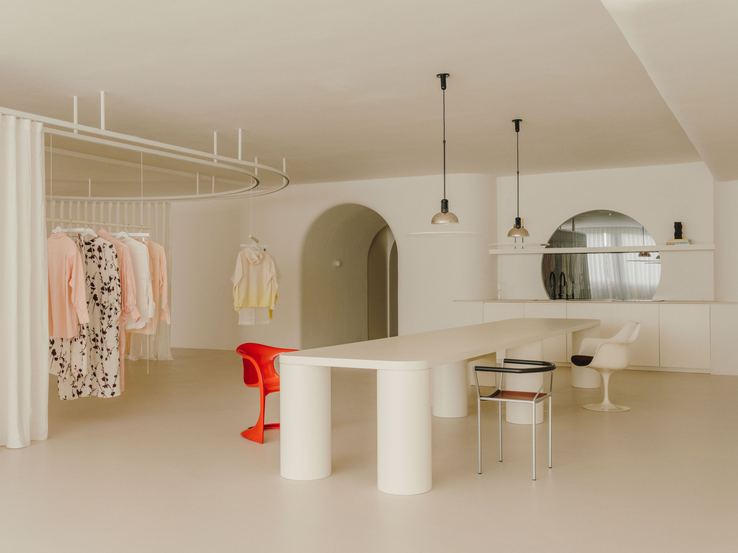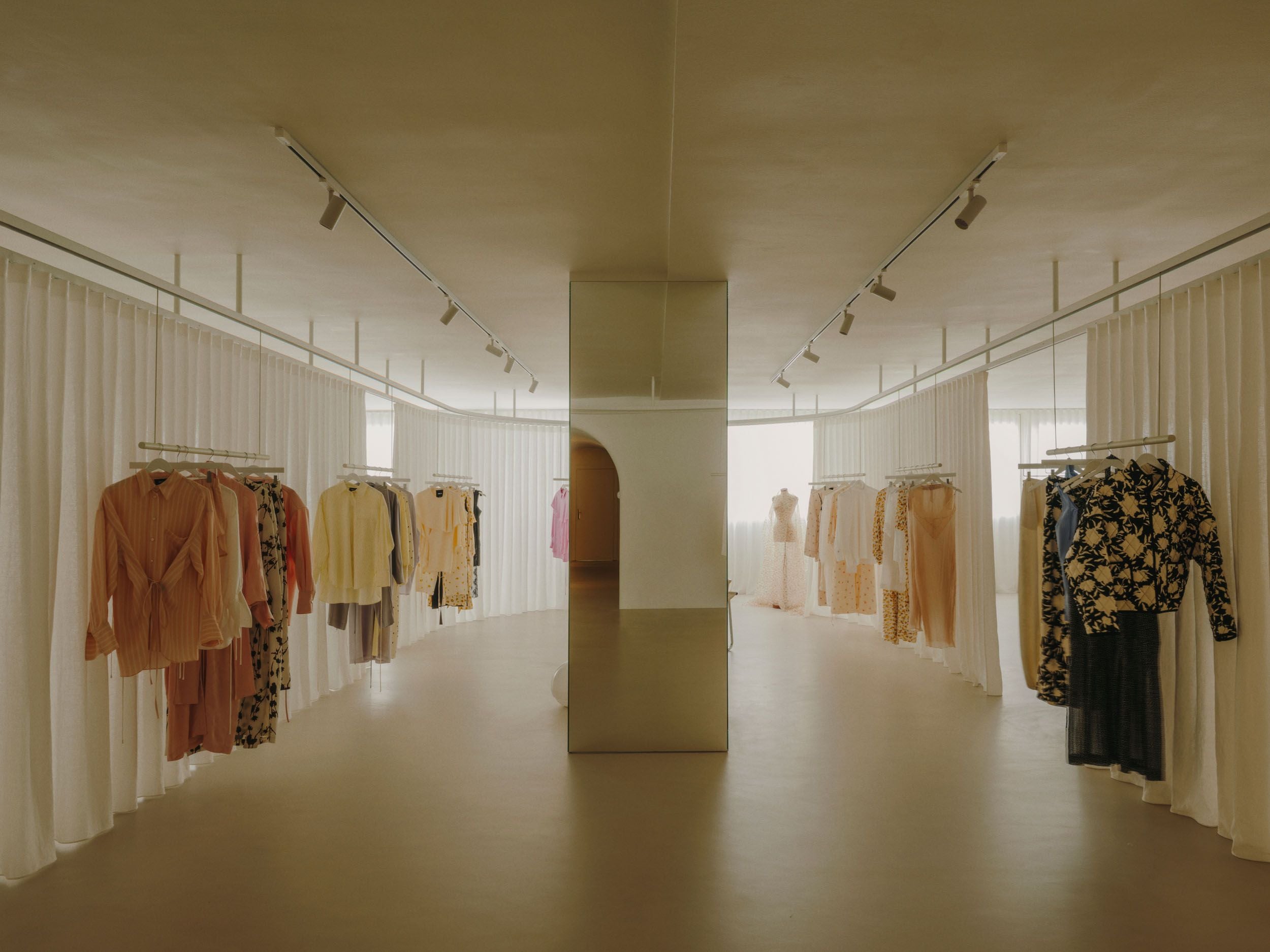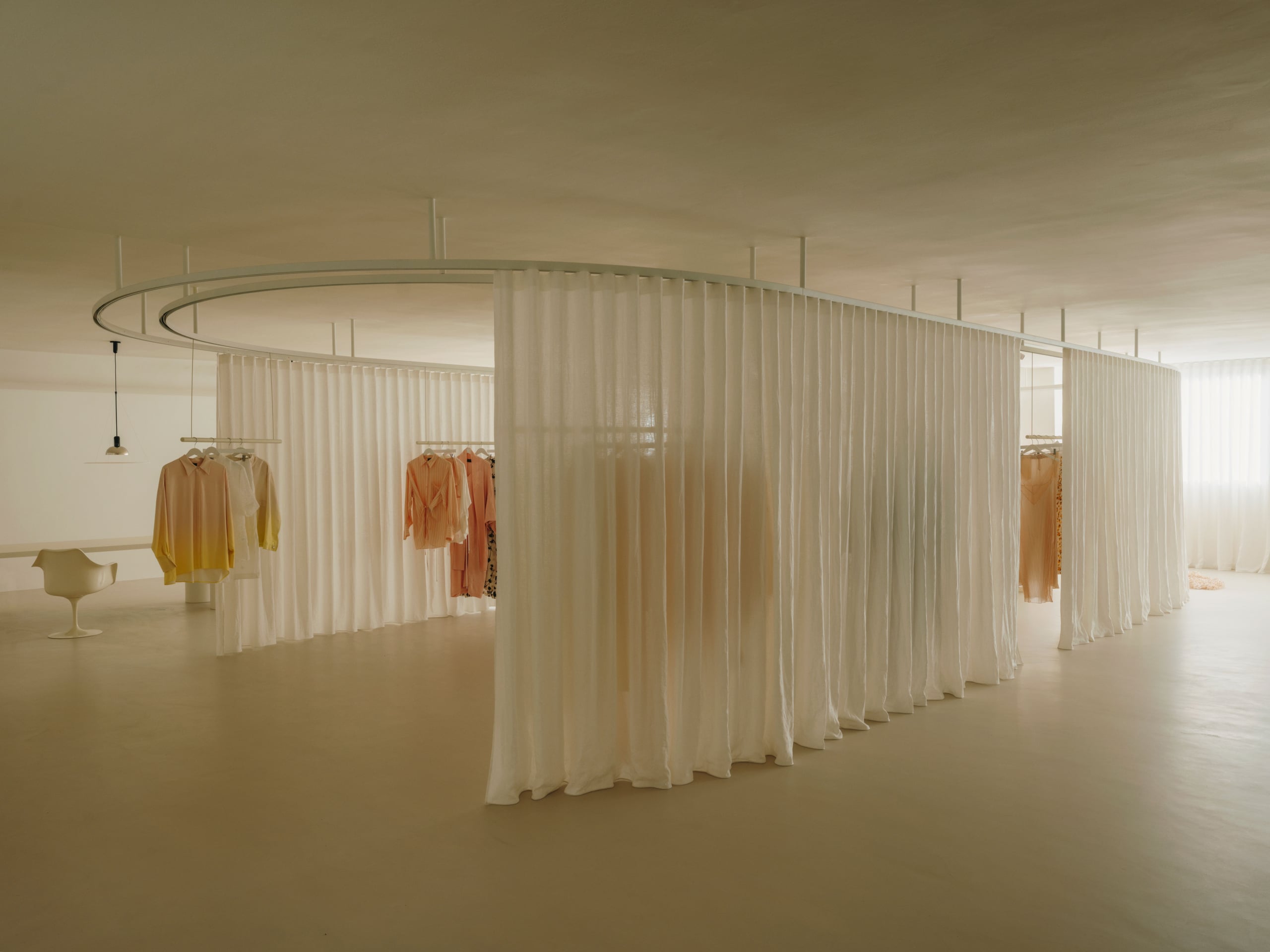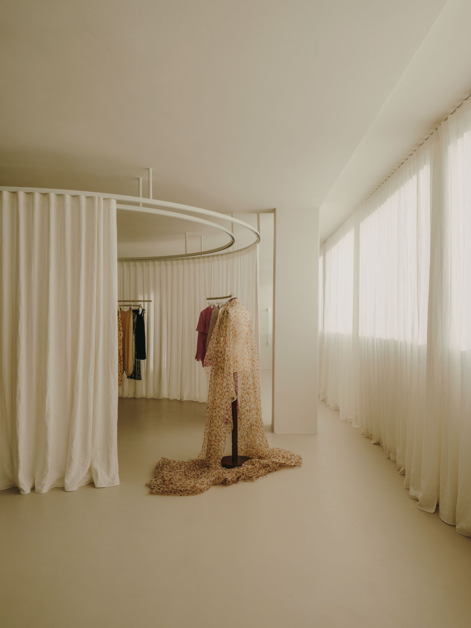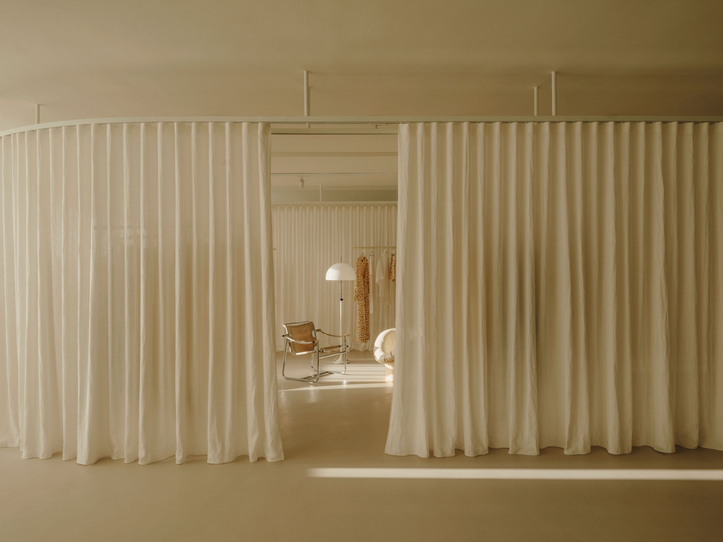 At the heart of the space lies an open area that invites gathering and shared experience. It is a mutable environment that adapts to different uses through layers of curtains—a space that is deconstructed through a system of tracks, where curtains open and close to create varying degrees of intimacy. Mobile suspended structures, functioning as garment rails, form small still-life compositions showcasing pieces from the collection. Transparency, reflections, and translucent surfaces evoke a constant interest in capturing the intangible—also present in the brand’s collections—where light acts as a thread connecting the visible and the emotional. A seating area, composed of vintage furniture and lighting, is placed at the center of the space, within the gallery setting of Fenix Originals