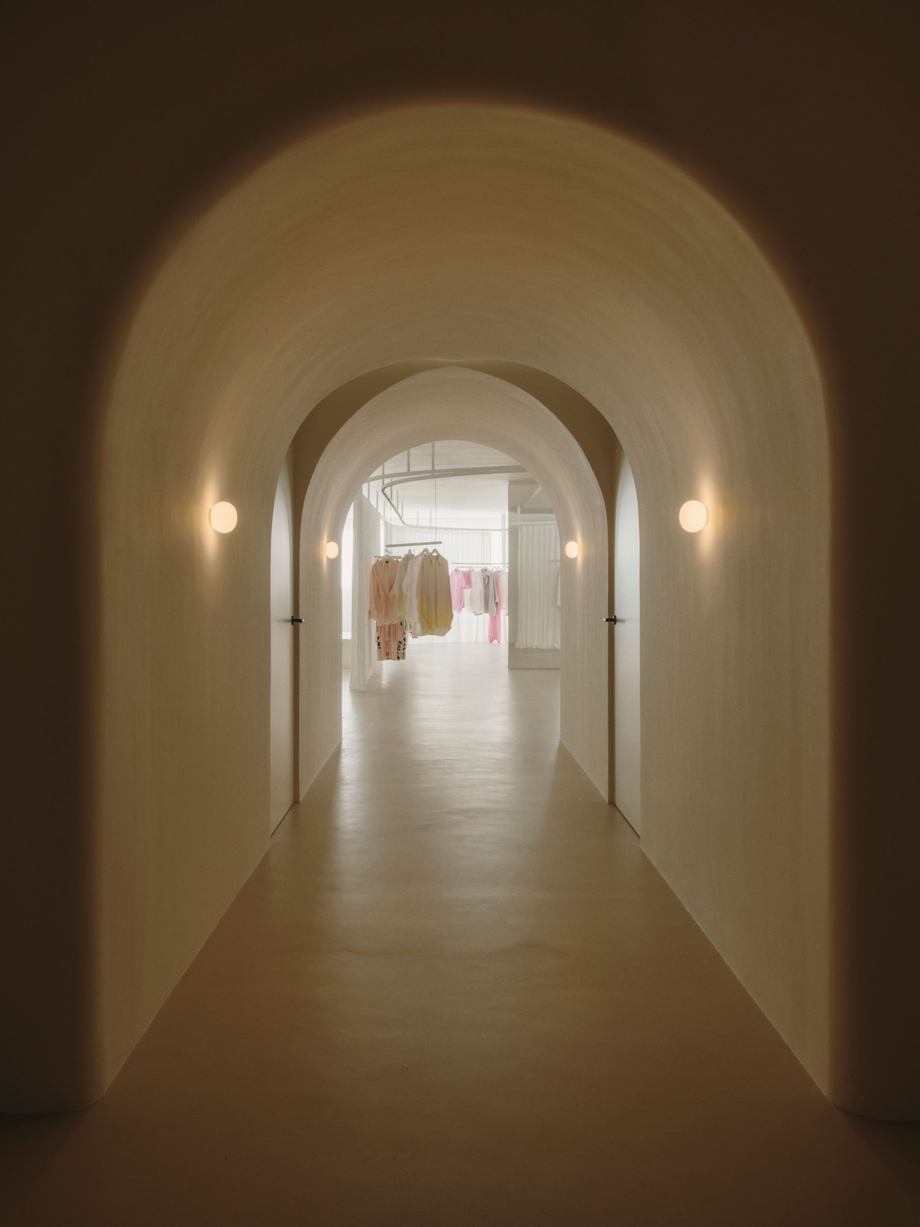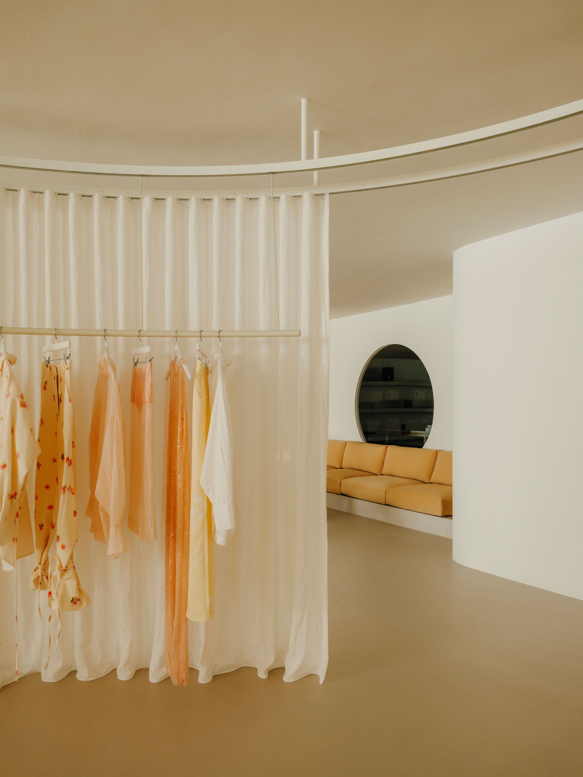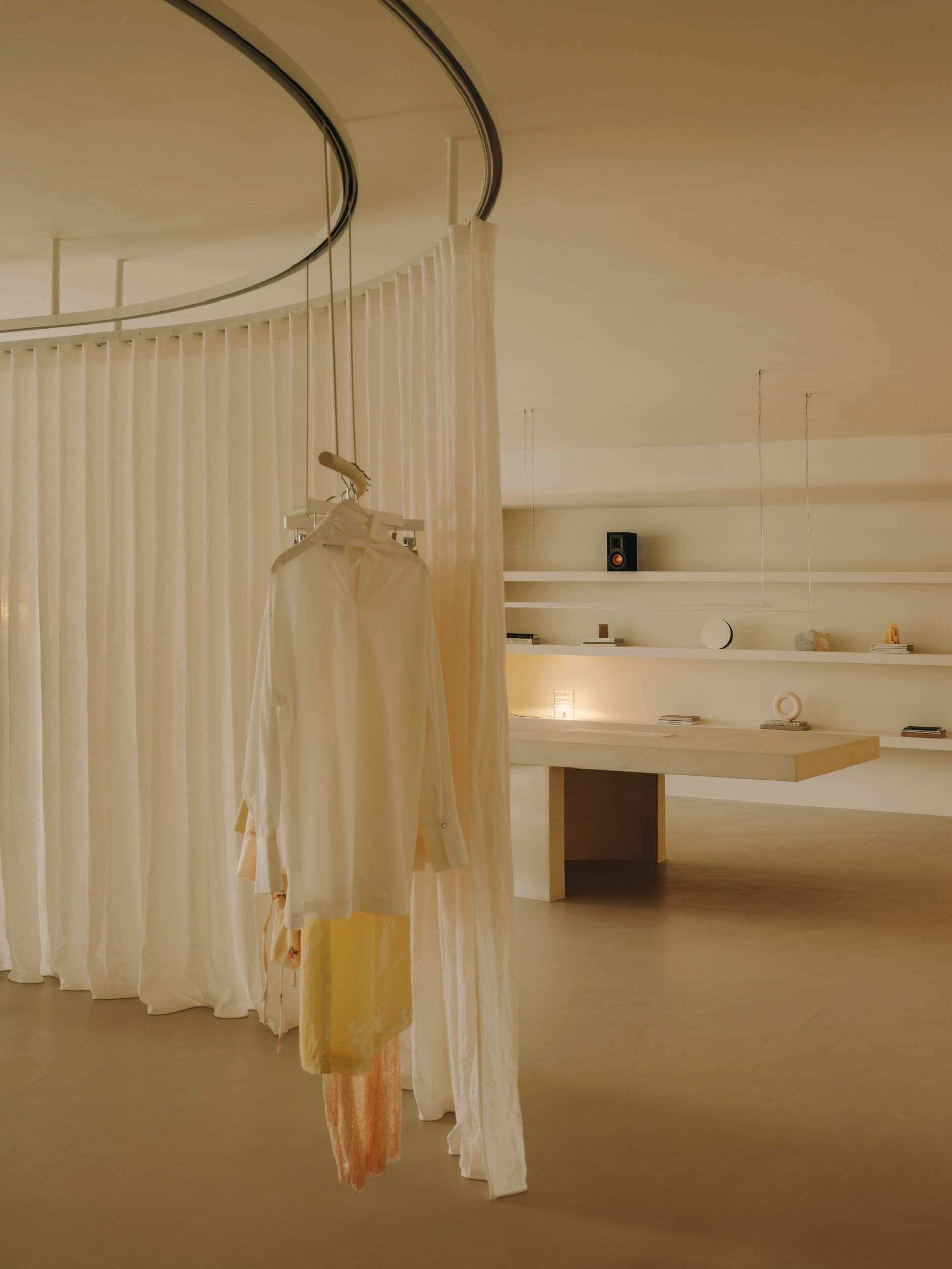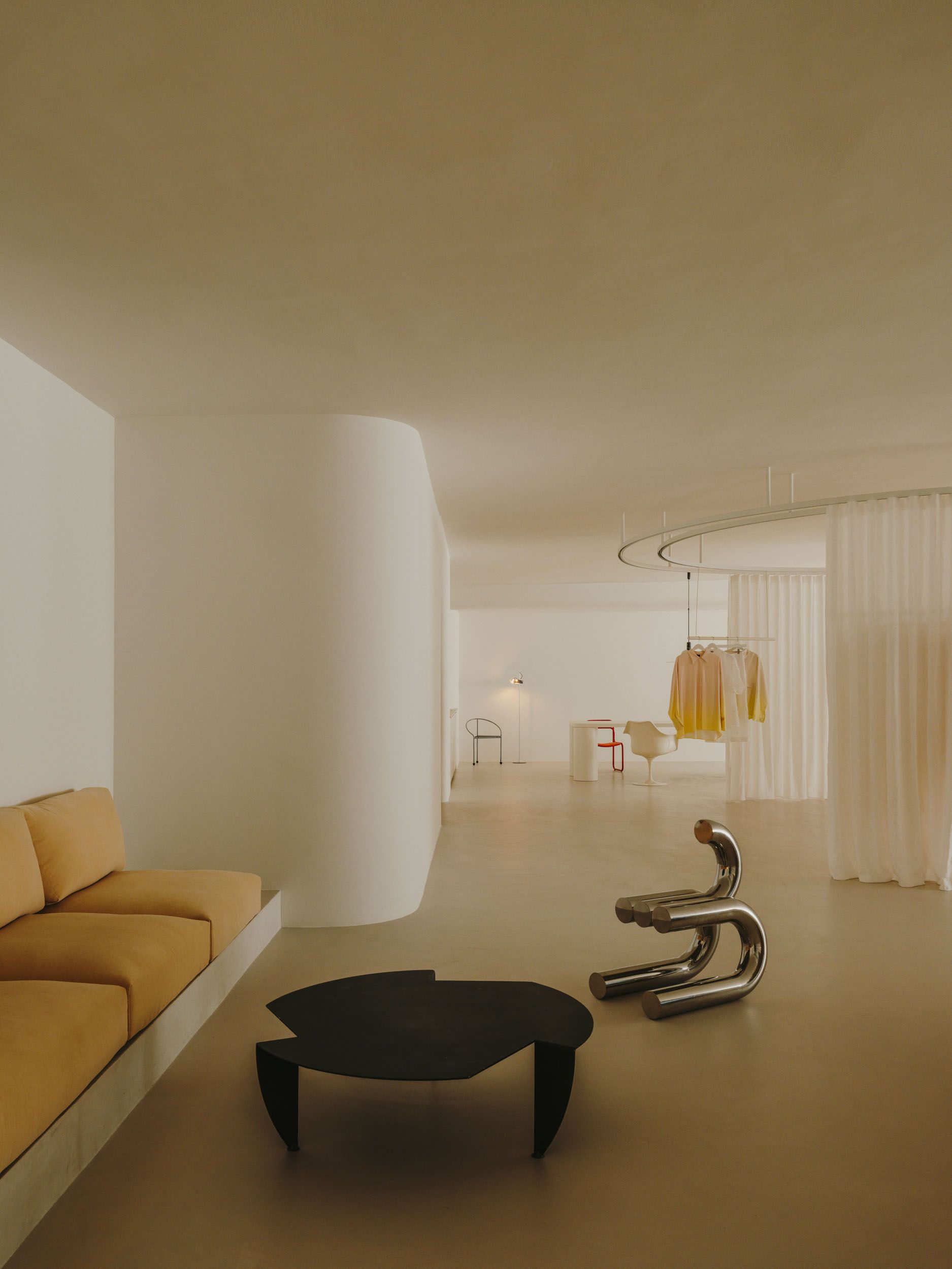 The showroom is organized through soft transitions between areas, avoiding rigid boundaries. Curtains, curved walls, and textured materials allow the space to be modulated, creating different atmospheres without losing visual continuity. This flexibility responds to the space’s dual nature: both exhibition and functional, intimate yet open at the same time.