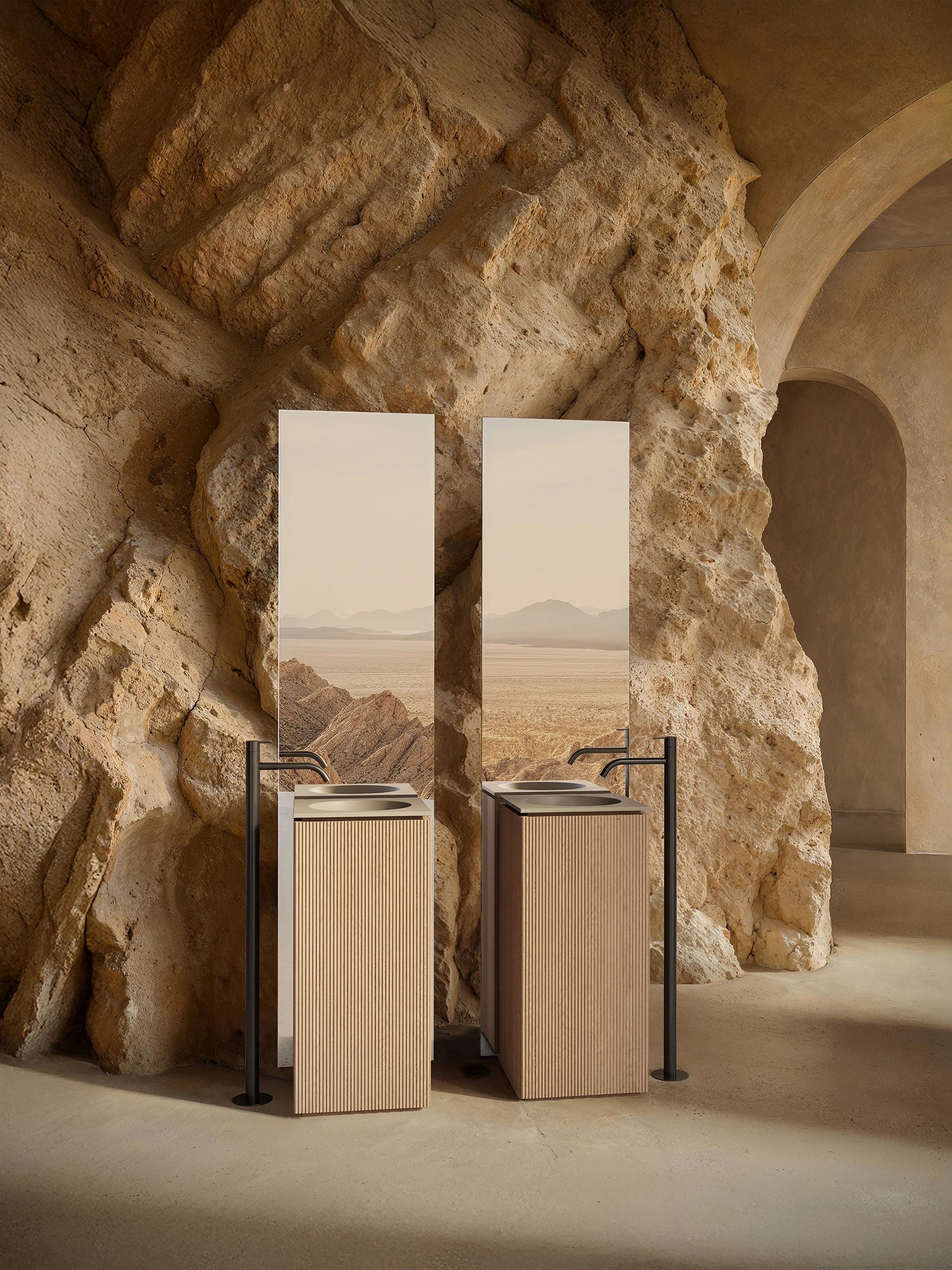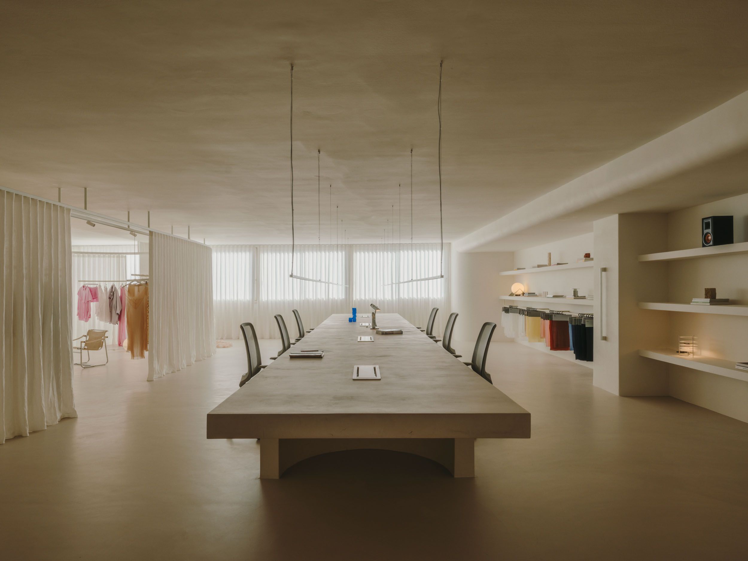 In contrast, the work areas are conceived as serene, domestic spaces, where light tones and warm materials predominate. Here, the brand’s objects take center stage, integrating into the environment as part of a coherent narrative that blurs the boundary between product and space. A large table structures the workspace—a custom-built piece conceived almost as a sculptural element.