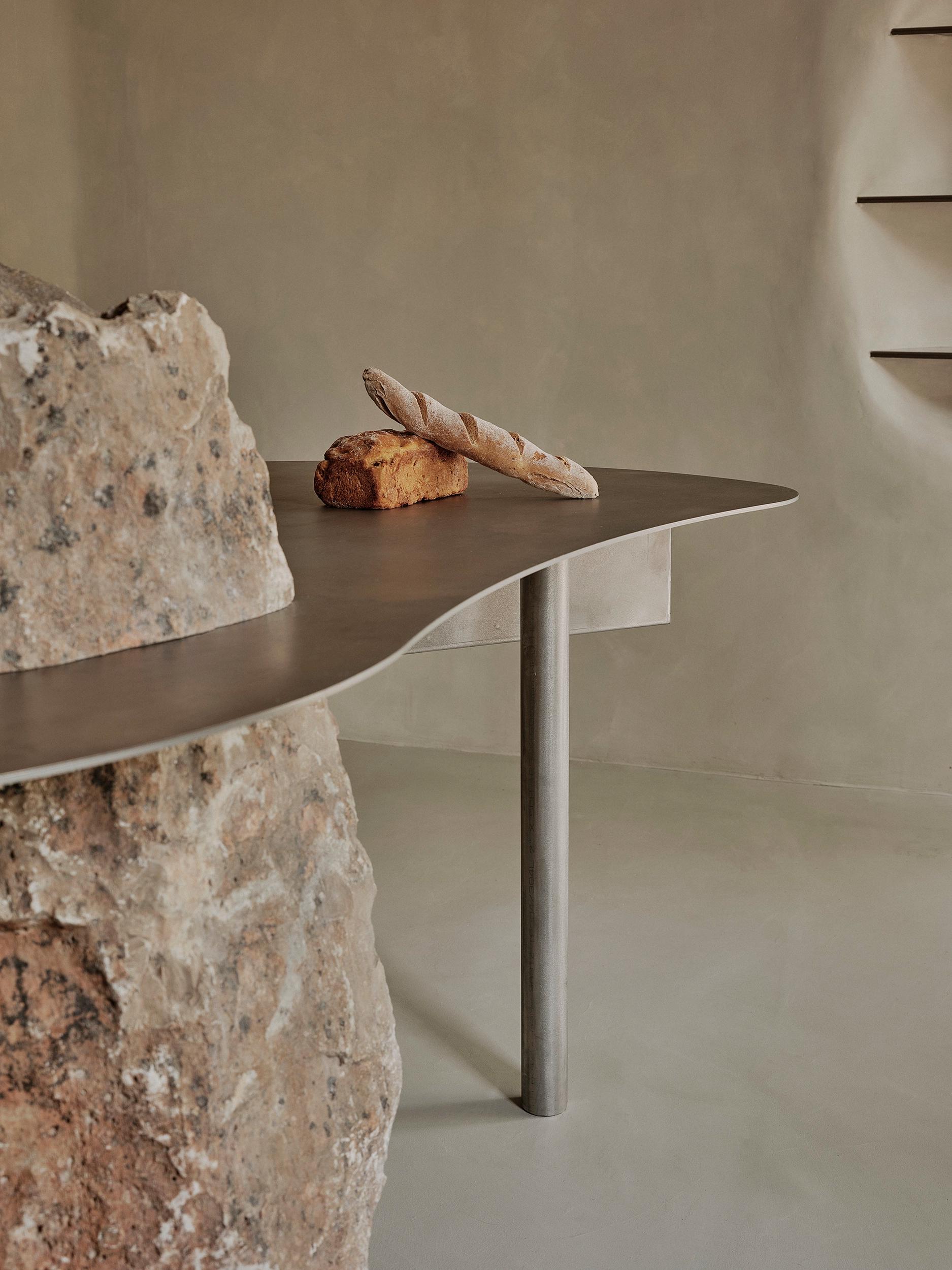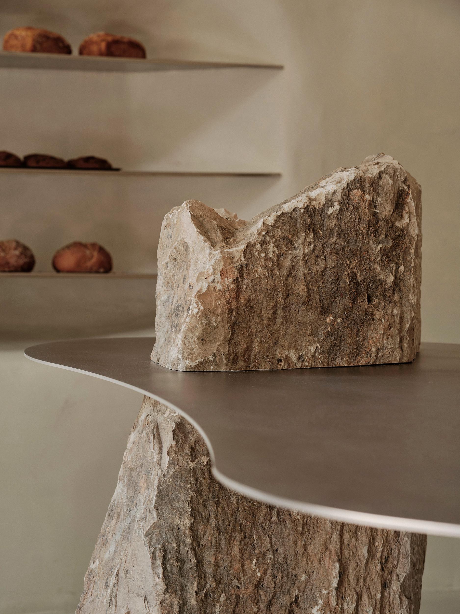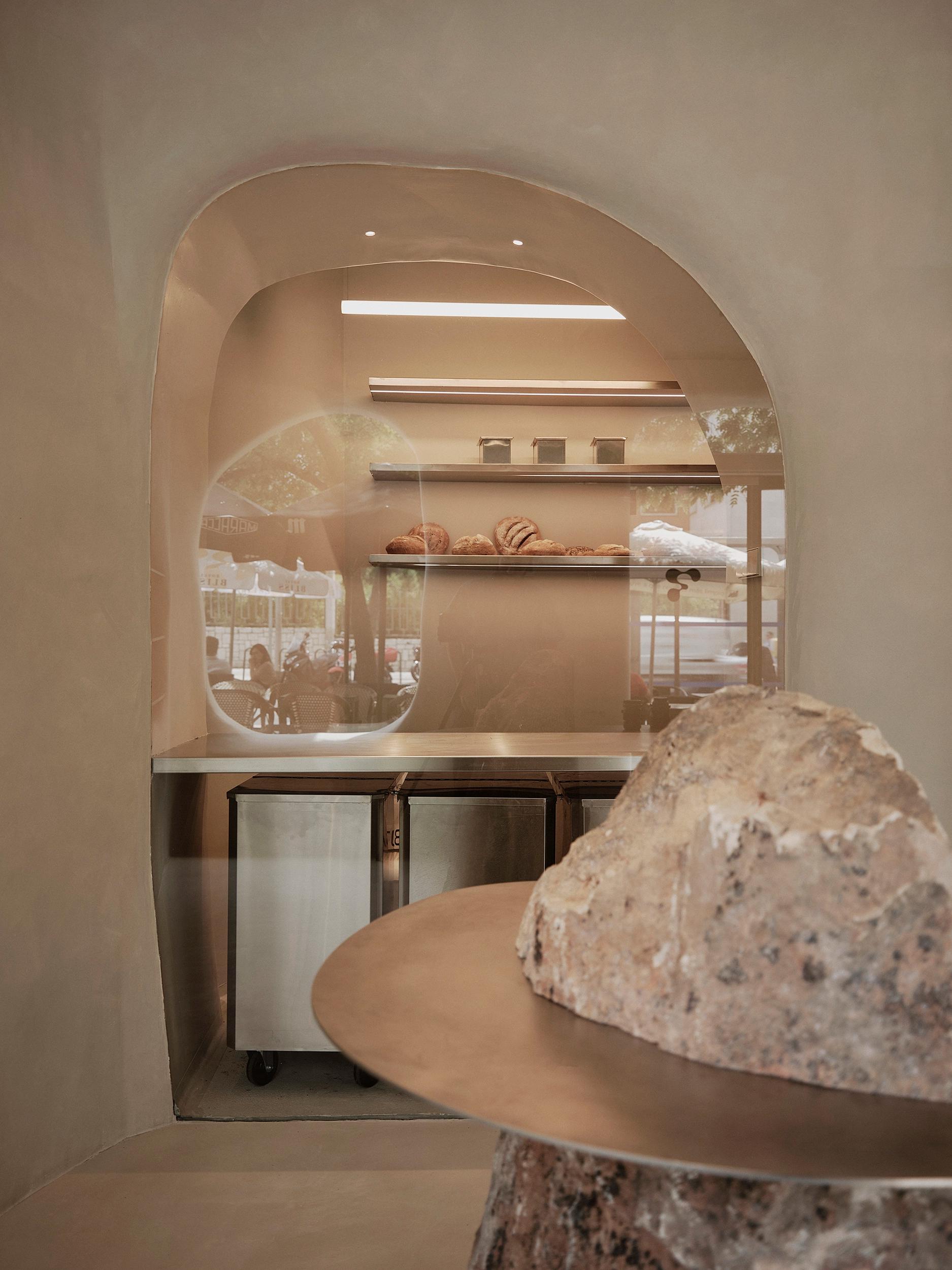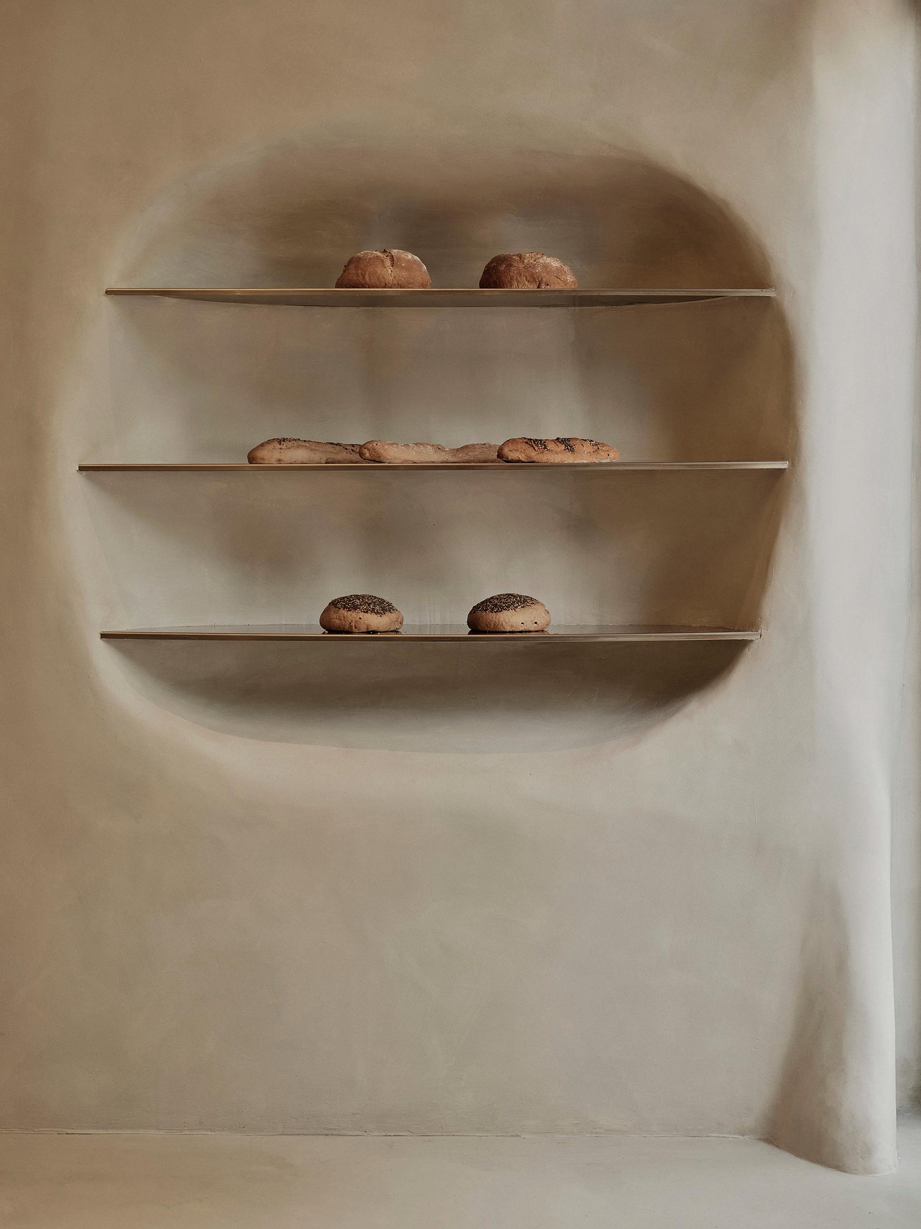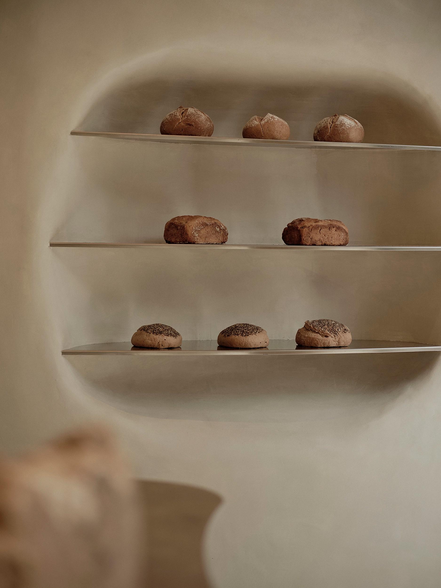 On either side of the space, curved niches adapt fluidly to the morphology of the environment, serving as display areas where bread is presented on stainless steel shelving.
