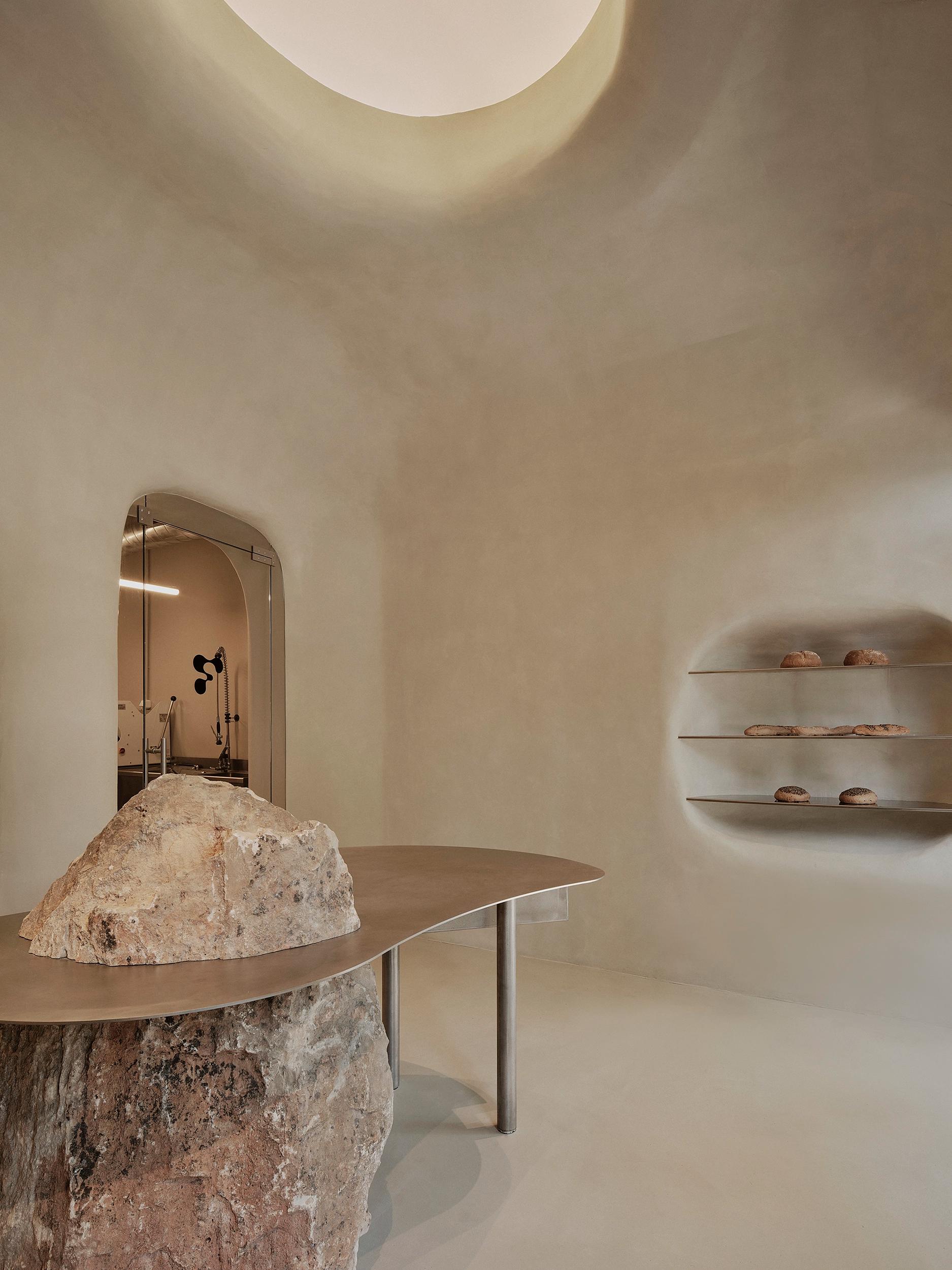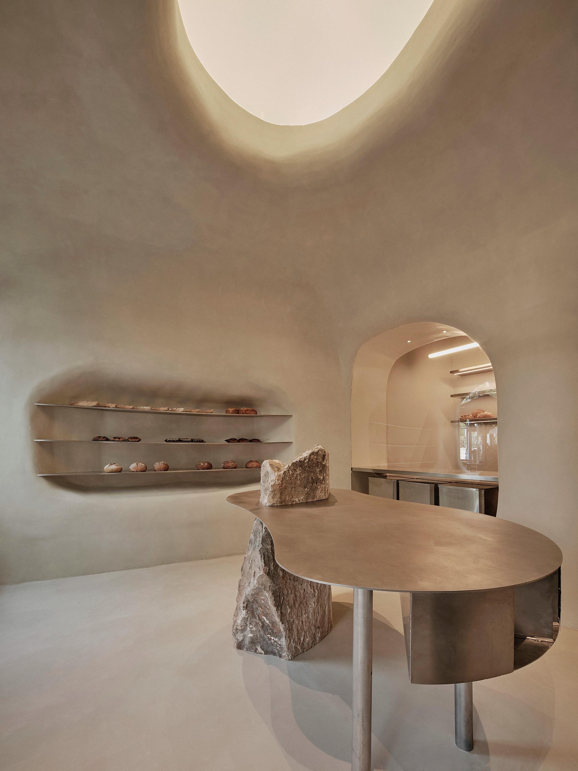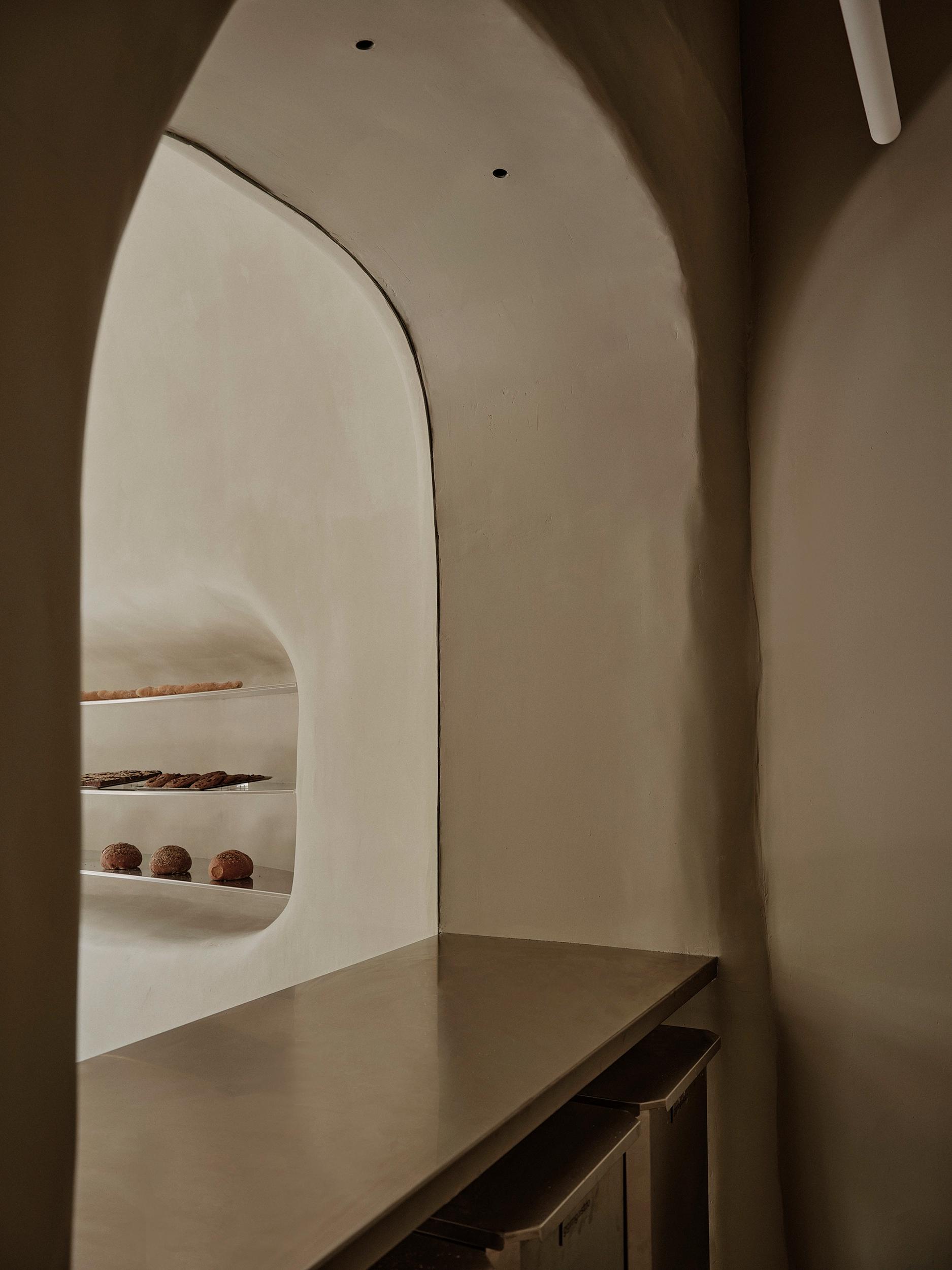 The retail area seamlessly connects with the production workshop through a series of organic arches, enabling a fluid spatial transition. Within this workshop—all products are crafted on-site—customers can observe the entire preparation process in real time, thereby reinforcing the project’s core principle of transparency.