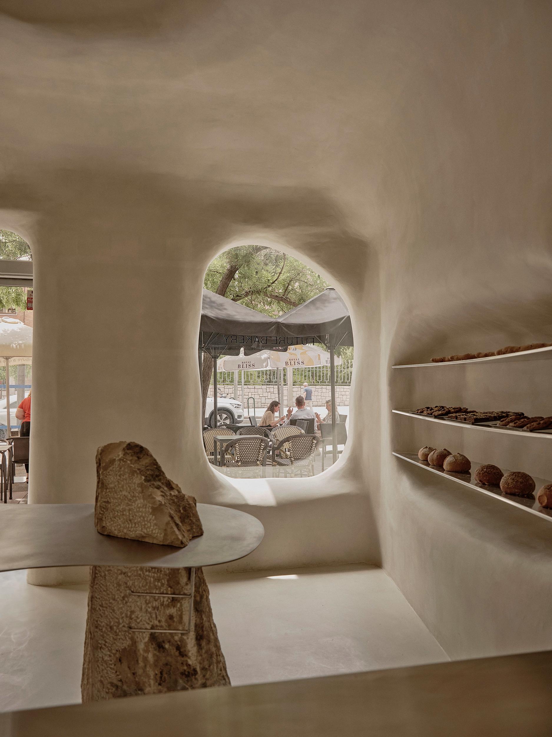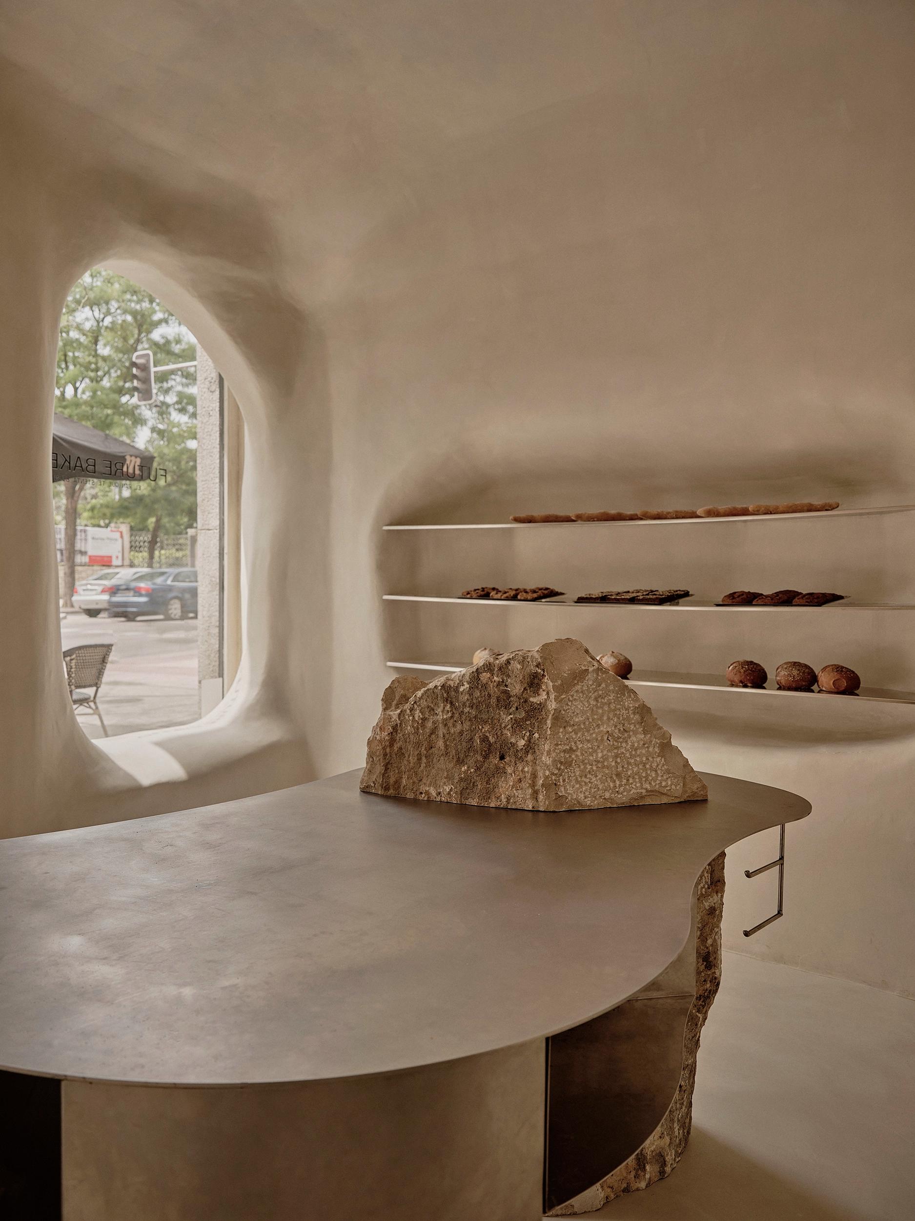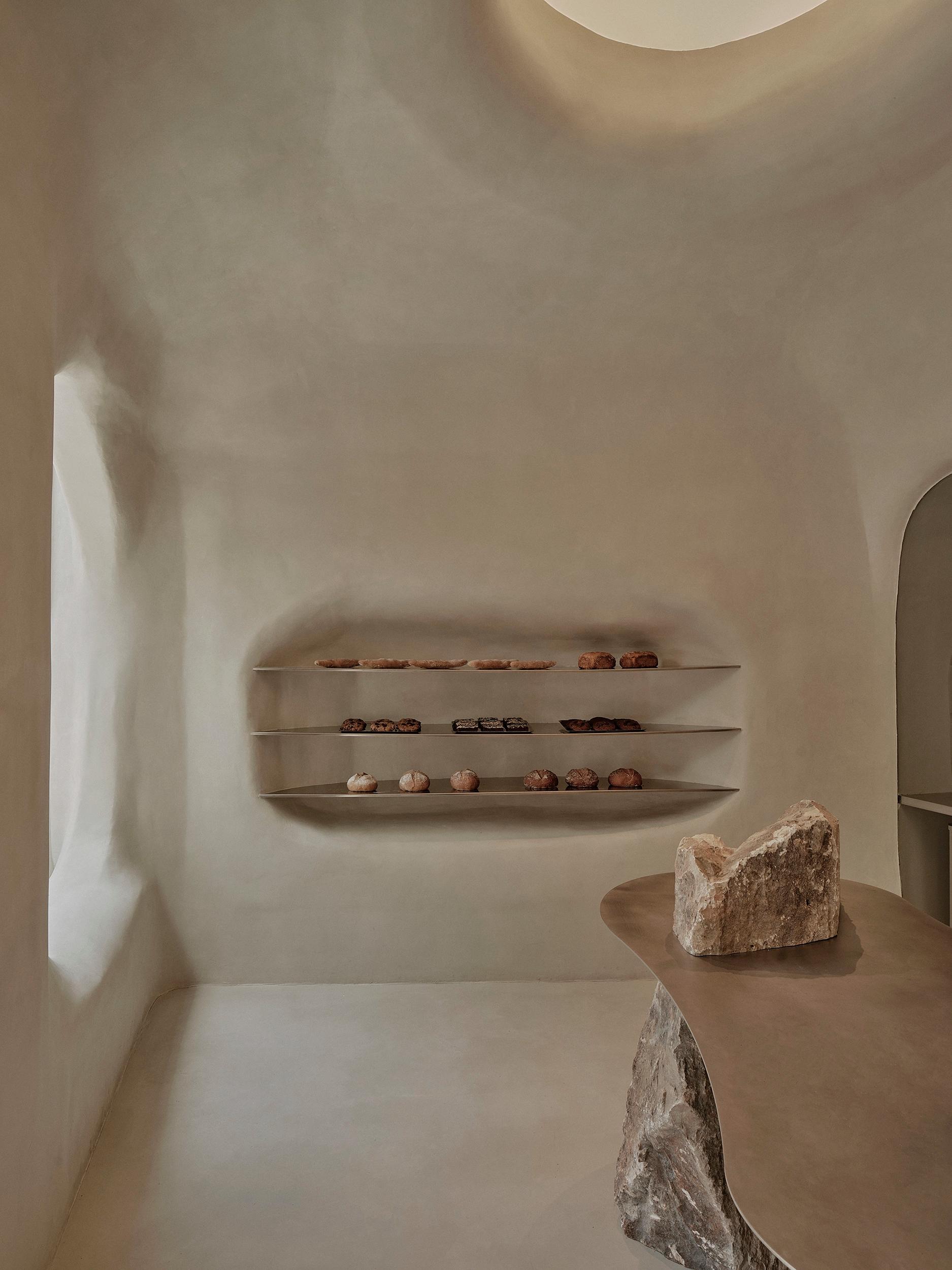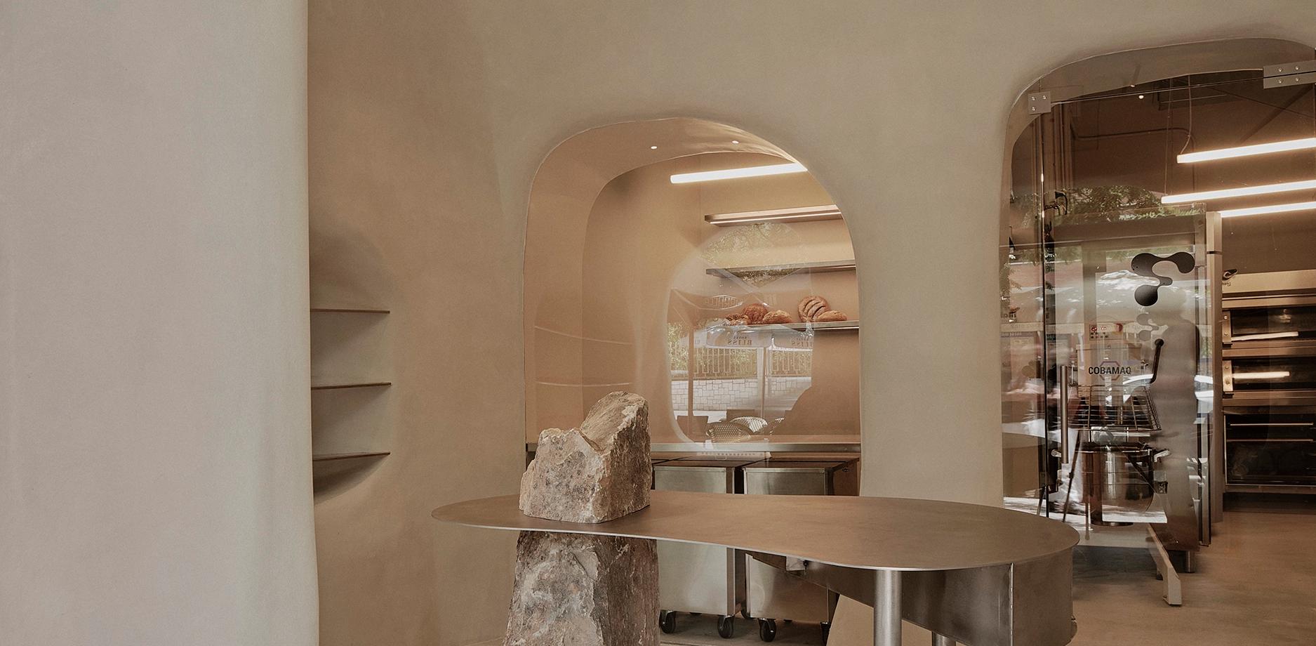 The retail area seamlessly connects with the production workshop through a series of organic arches, enabling a fluid spatial transition. Within this workshop—all products are crafted on-site—customers can observe the entire preparation process in real time, thereby reinforcing the project’s core principle of transparency.