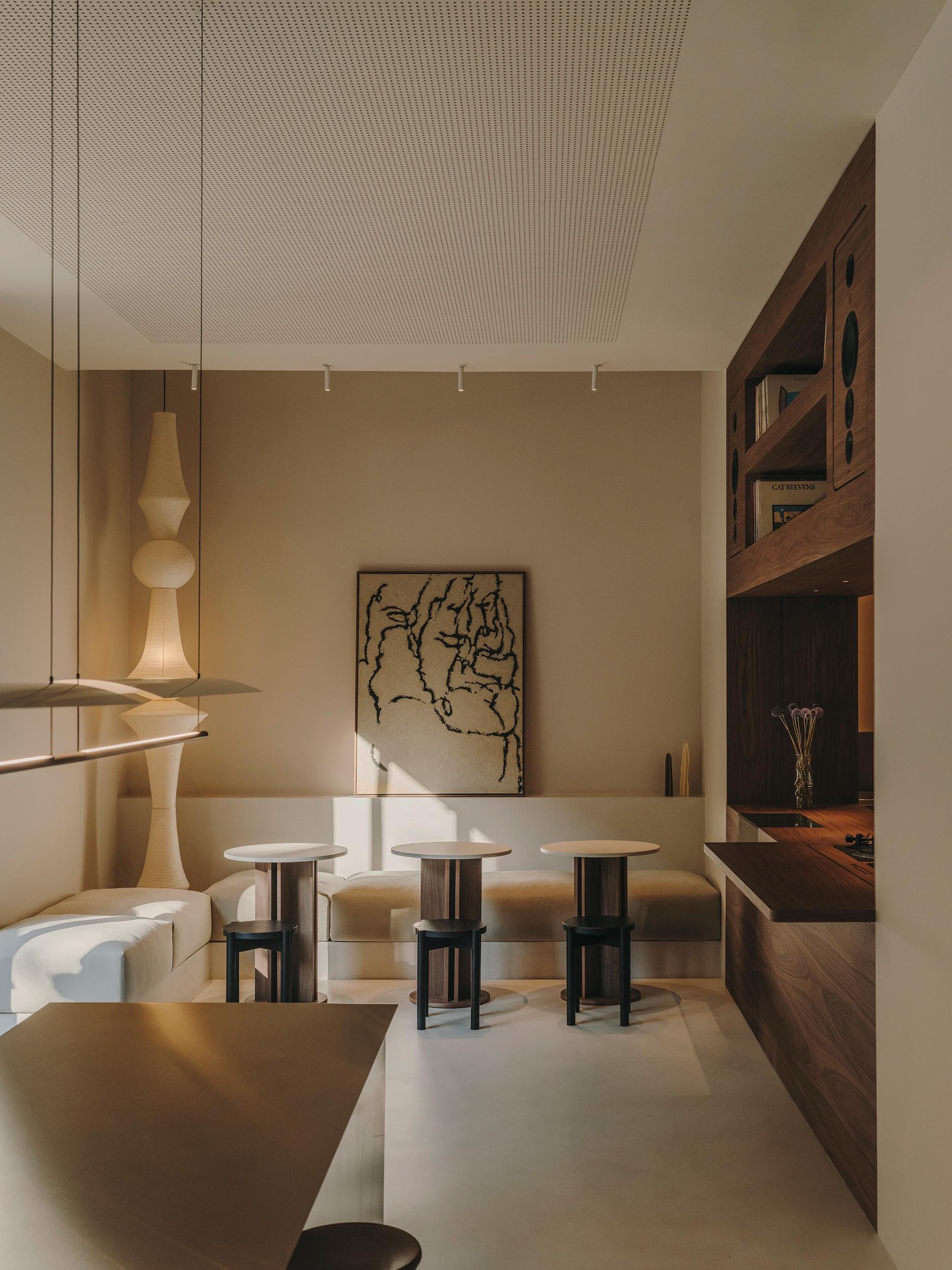 Materials play a central role in unifying these varied spaces. The floor, walls, and ceiling are finished in warm beige microcement, creating a monochromatic envelope that allows the walnut wood to stand out in rich contrast. Stainless steel elements bring a contemporary edge, while the custom beige cushions soften the harder surfaces, bridging Japanese precision with Mediterranean ease. Lighting, too, is treated as an architectural element — each fixture chosen not only for its form but for how it shapes atmosphere, marks transitions, and frames moments within the café.