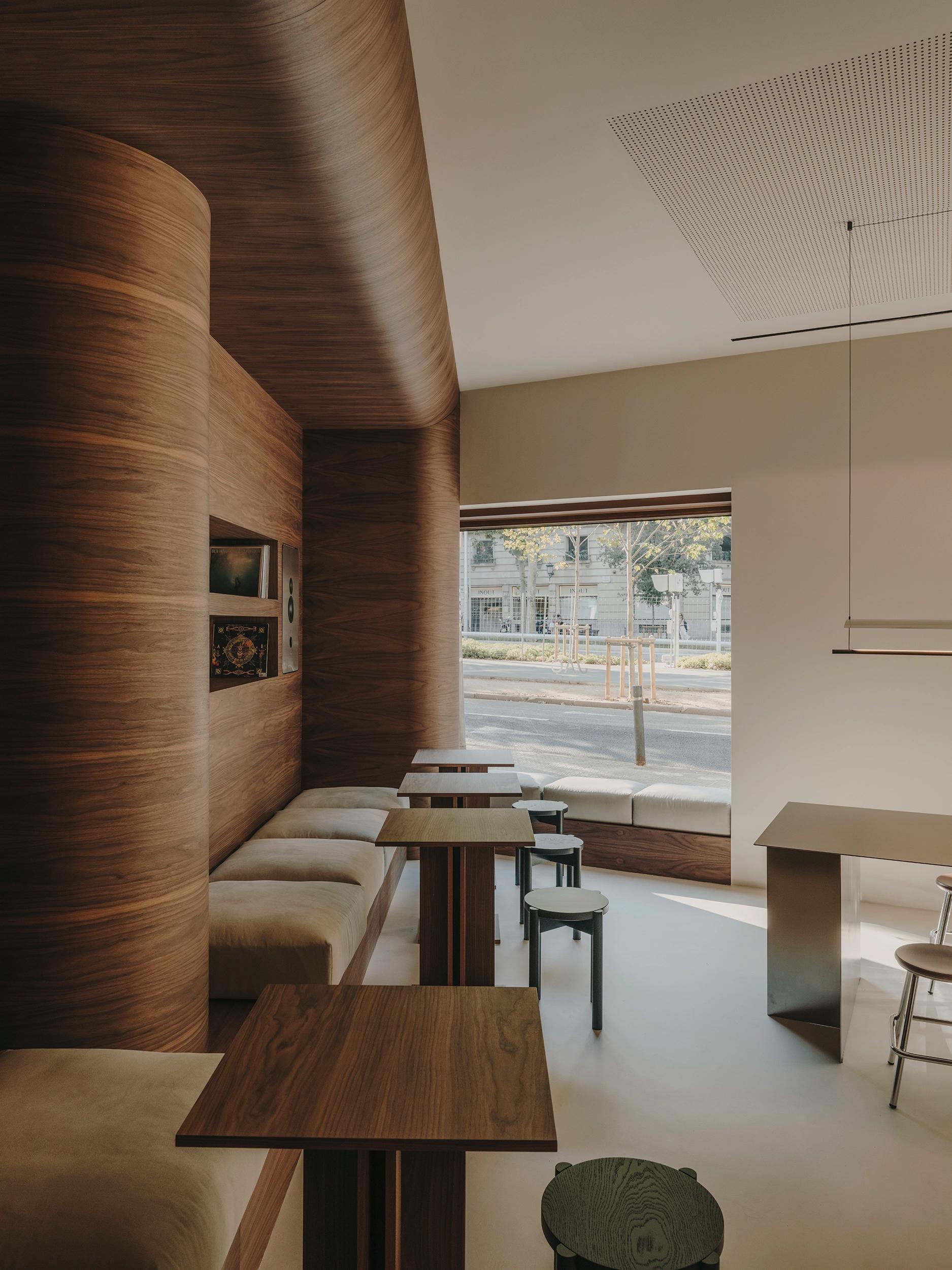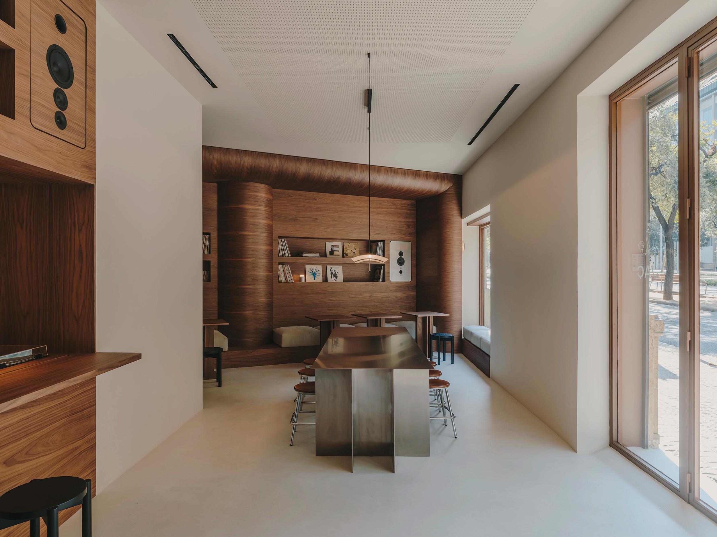 From here, the space flows toward the bar — a monolithic piece of walnut wood that doubles as a giant speaker cabinet produced by Fusteria Vidal. Designed as both functional counter and audio sculpture, the bar integrates a baked goods display, vinyl shelves, and custom speakers by Bloom Island, cut from the same slab of walnut to preserve the natural grain across surfaces. This careful detailing allows the sound system to merge seamlessly with the furniture, echoing the kissa tradition of treating audio equipment as an integral part of the room’s architecture.