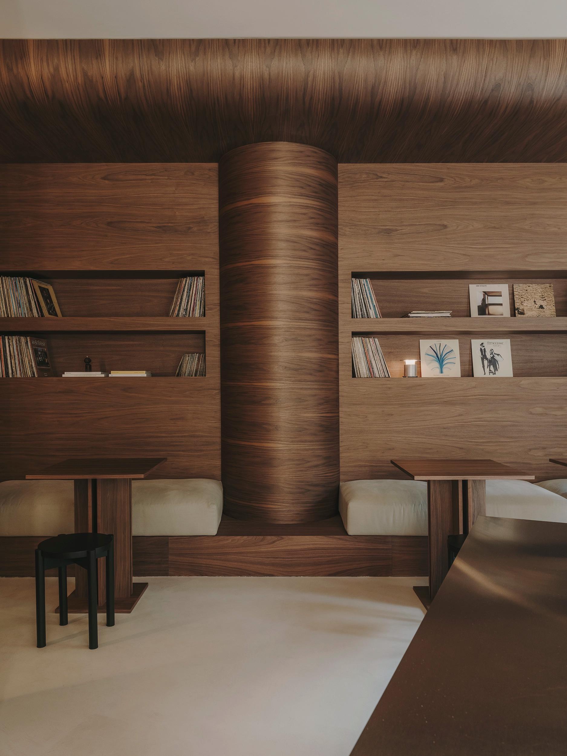 The most dramatic element of JAÇ, however, lies toward the rear: a large walnut-wood installation that curves across walls and ceiling to form a semi-enclosed listening alcove, produced by Fusteria Vidal. This architectural sculpture is divided by a cylindrical wooden column, its shelves filled with vinyl records, and on each side, stainless-steel Bloom Island speakers. The effect is immersive — a space that seems to embrace the listener, pulling them into a cocoon of warm wood and resonant sound. The integrated seating here is informal, with custom cushions and low walnut tables, lit by a Disco wall lamp by Jordi Miralbell and Mariona Reventós (Santa & Cole) that adds a subtle, theatrical touch.