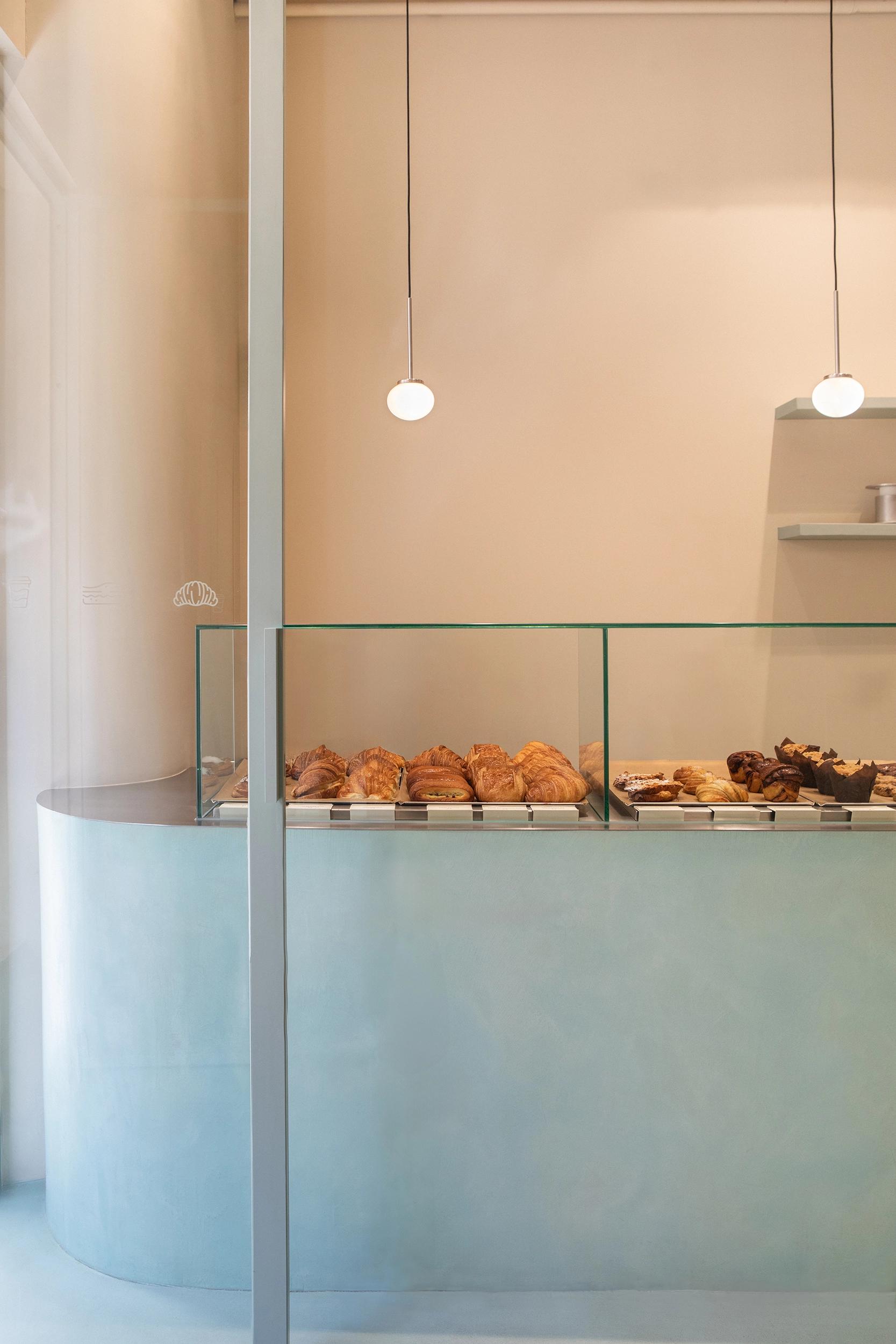 Curves are present in many corners of Little Fern, from the central bar to the walls leading to the entrance, enveloping visitors in a harmonious and fluid ambiance. At the center of the space, a striking curved microcement bar stands as a sculptural piece that seamlessly integrates design and functionality. Its thin stainless steel countertop adds a subtle touch of freshness, balancing the warmth of natural materials, all illuminated by FRAMA’s Ovoid Pendant lamps. This focal point houses an irresistible display of freshly baked goods, inviting customers to indulge in a sensory experience of artisanal flavors and aromas.