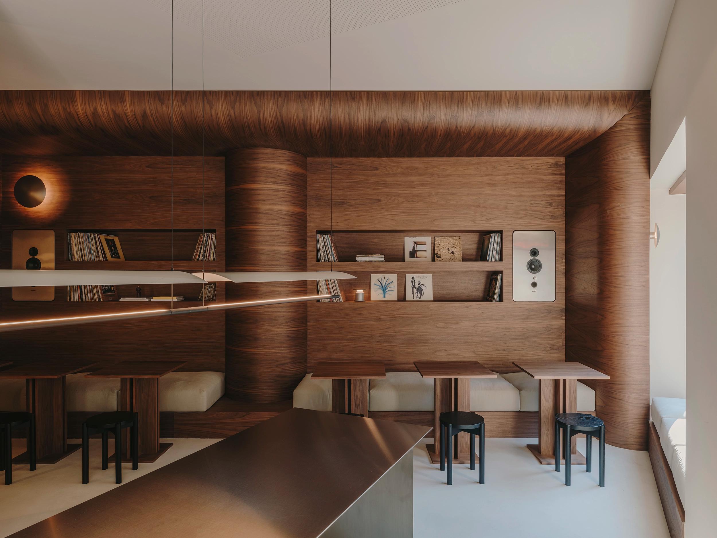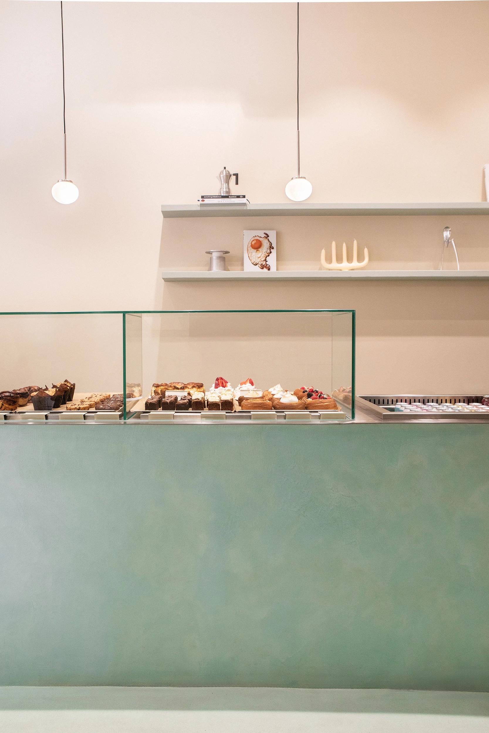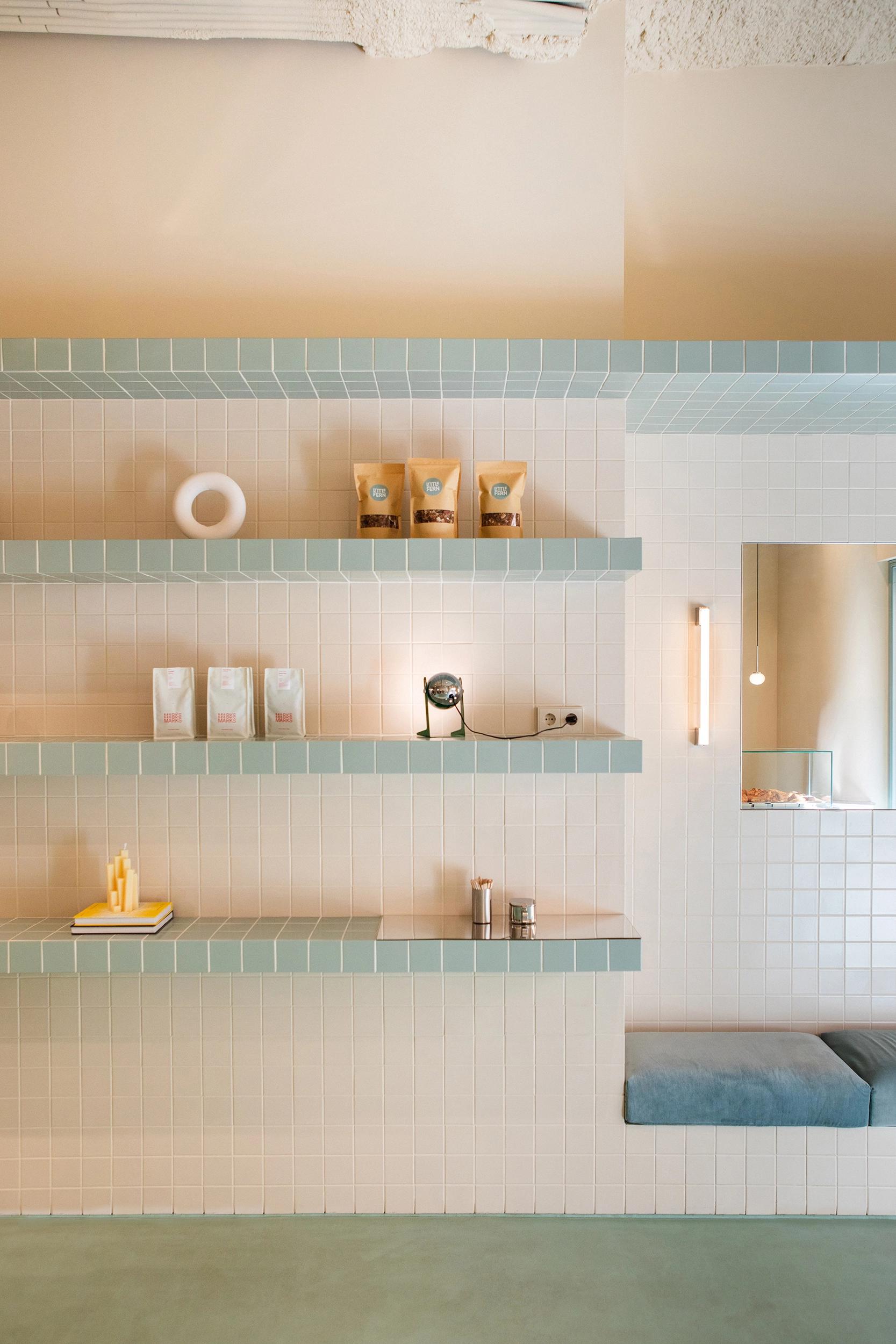 To the right, a tiled shelving wall extends across the space, serving both as an elegant display for carefully curated products and as a dynamic architectural feature. The shelves gradually transform into a built-in sofa, creating a cozy seating area where guests can linger over coffee and pastries. This seamless transition between display and seating blurs the boundaries between function and aesthetics, enhancing the overall spatial harmony.