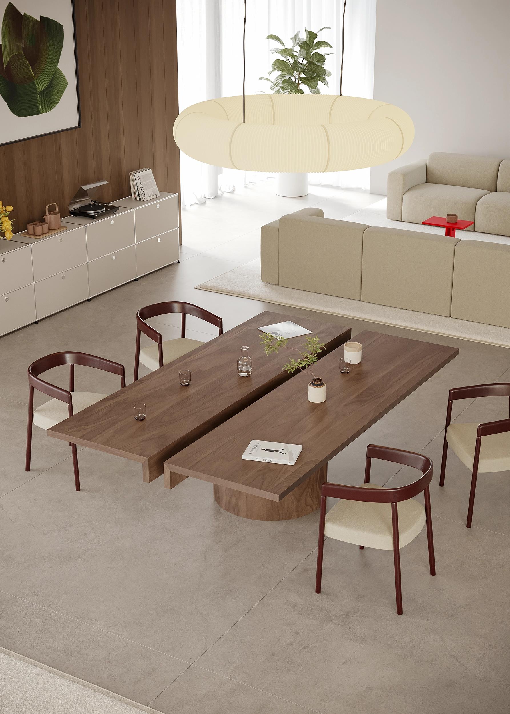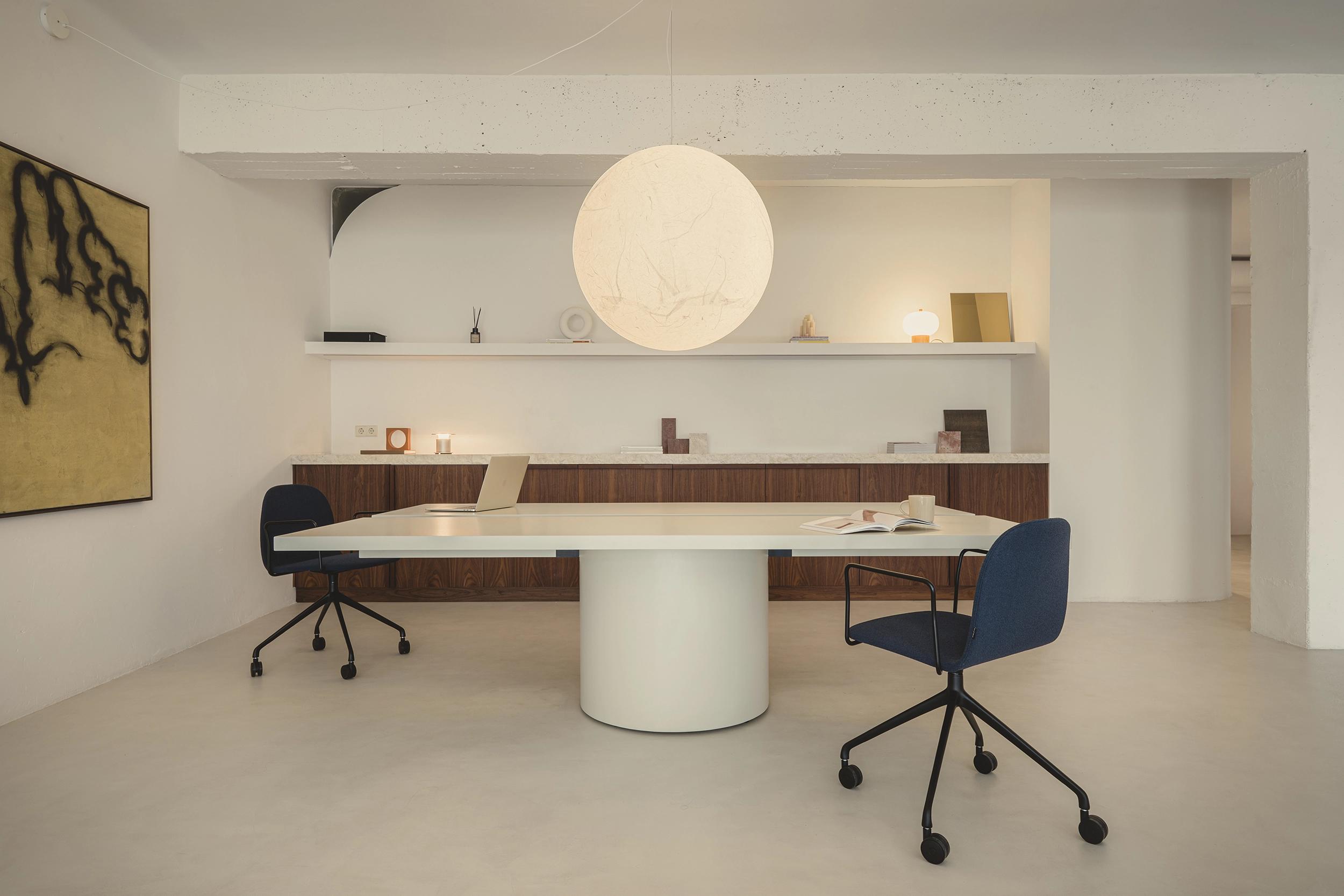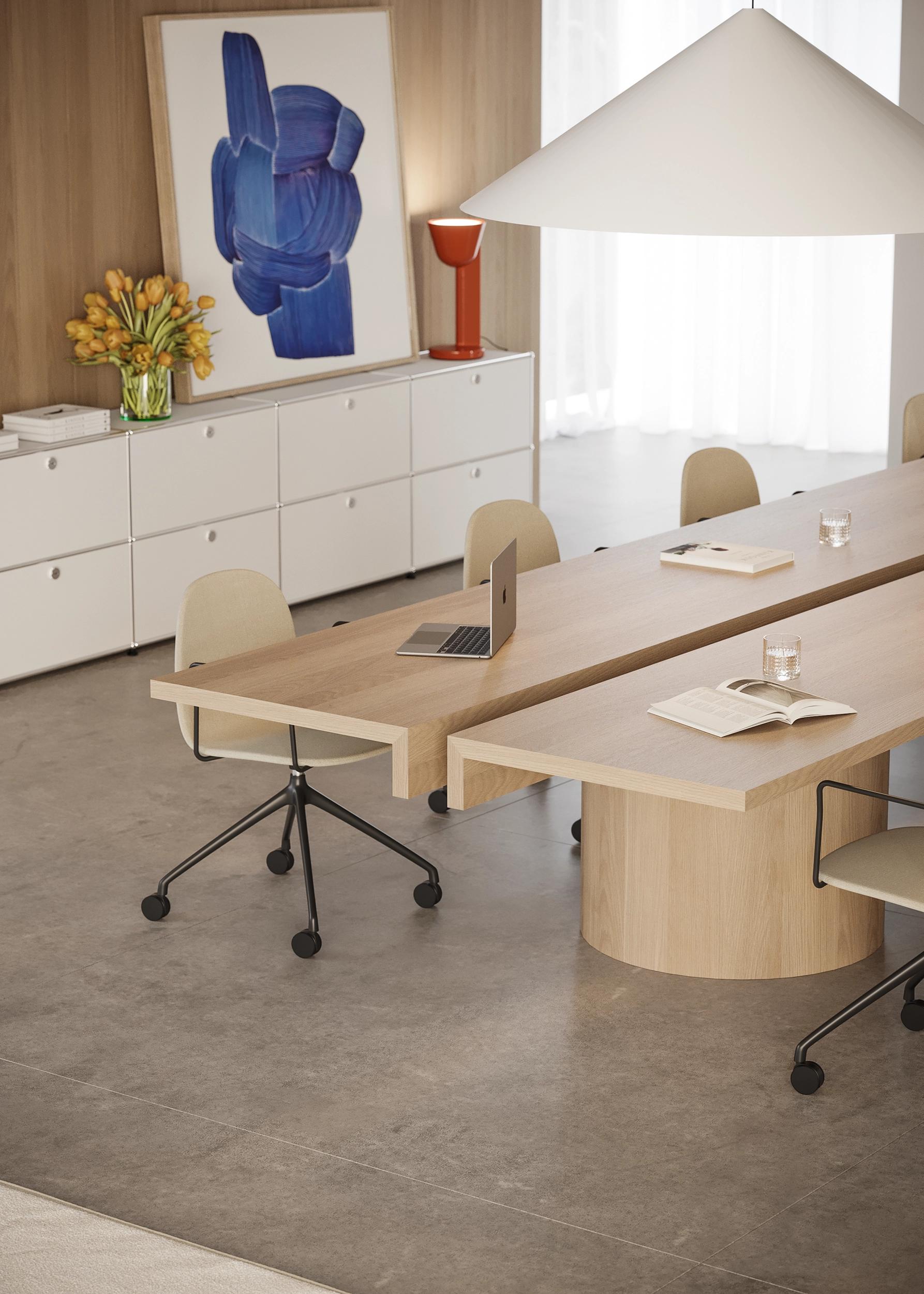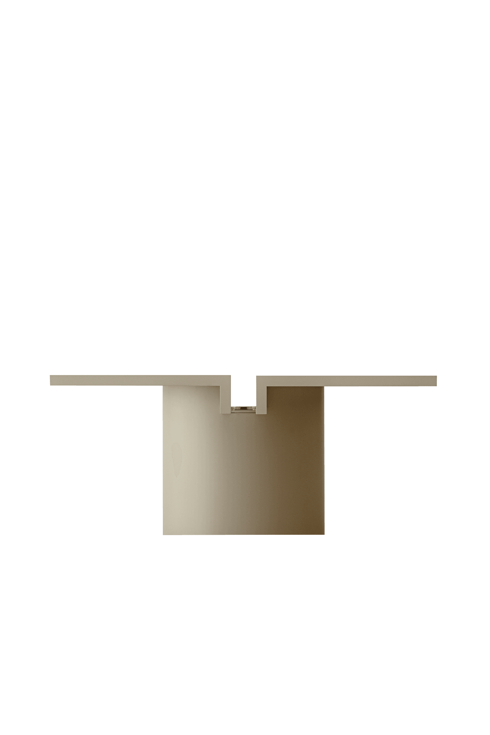TOT is defined by restraint and sculptural clarity. Pure forms give shape to the table: a single cylinder rises to support two wings, as if cradling the work surface in a quiet, almost ceremonial gesture. Its logic is architectural, precise yet open, allowing dimensions, accessories, and configurations to shift naturally in response to each space.