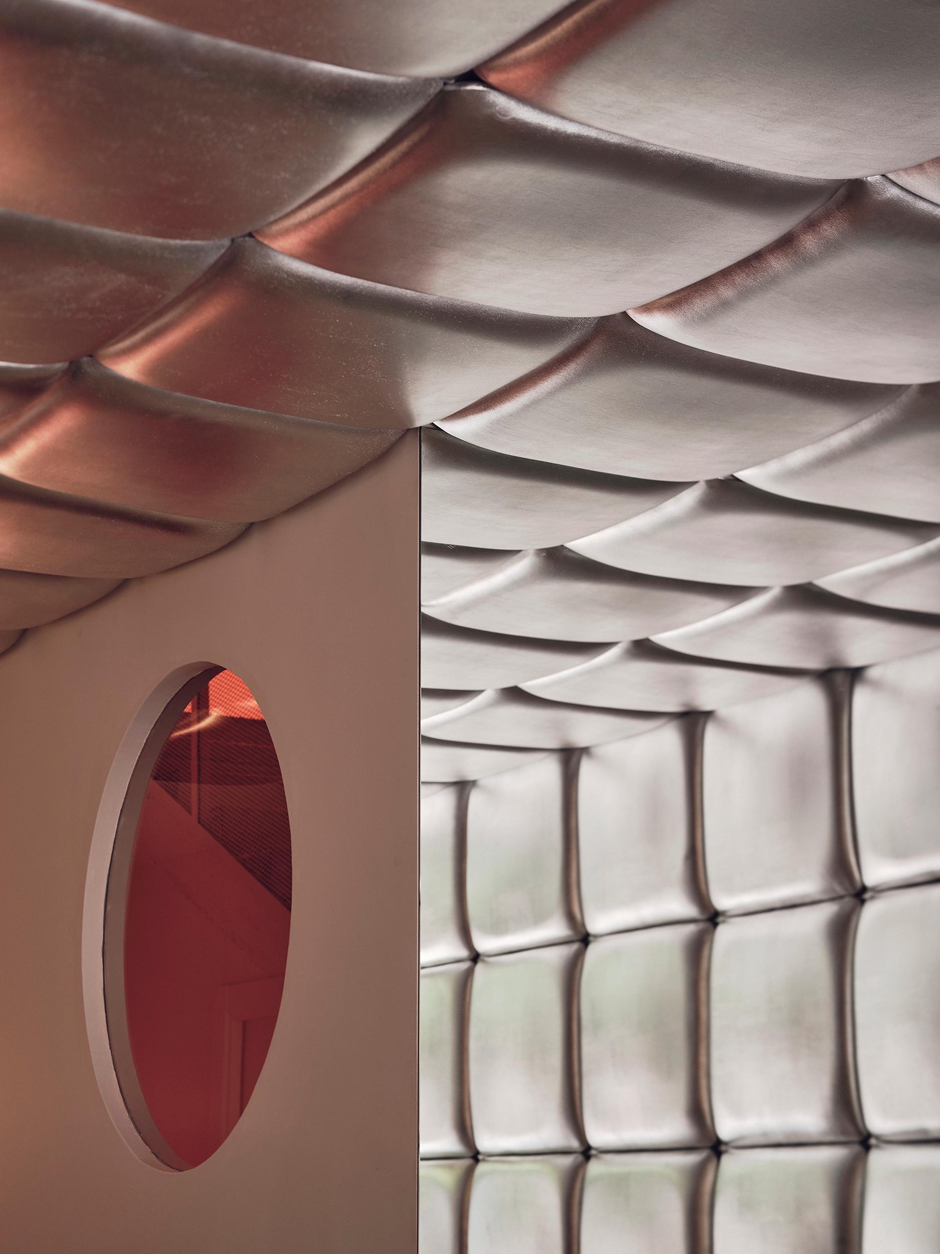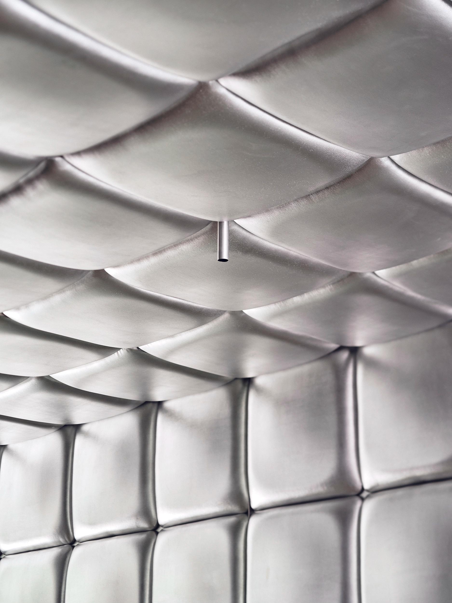 A key element of the project is the creation of "rellenos" (which means “fillings” in Spanish)—cushions filled with foam and covered with a sustainable, metallic Italian fabric. These elements form an enveloping grid that runs throughout the space, creating an immersive and easily recognizable atmosphere. Each piece symbolizes the “filling” process that defines the brand, establishing a direct connection between the product and the environment that houses it.