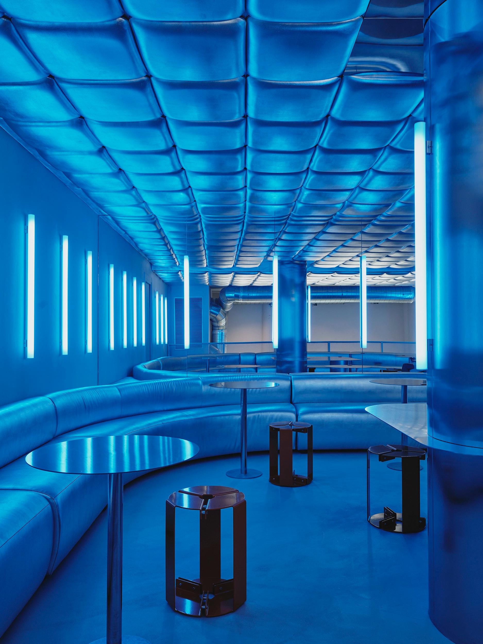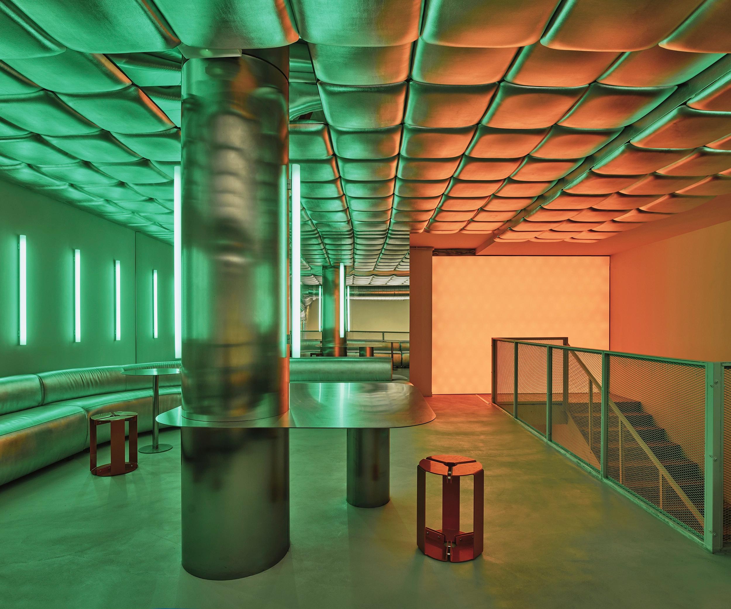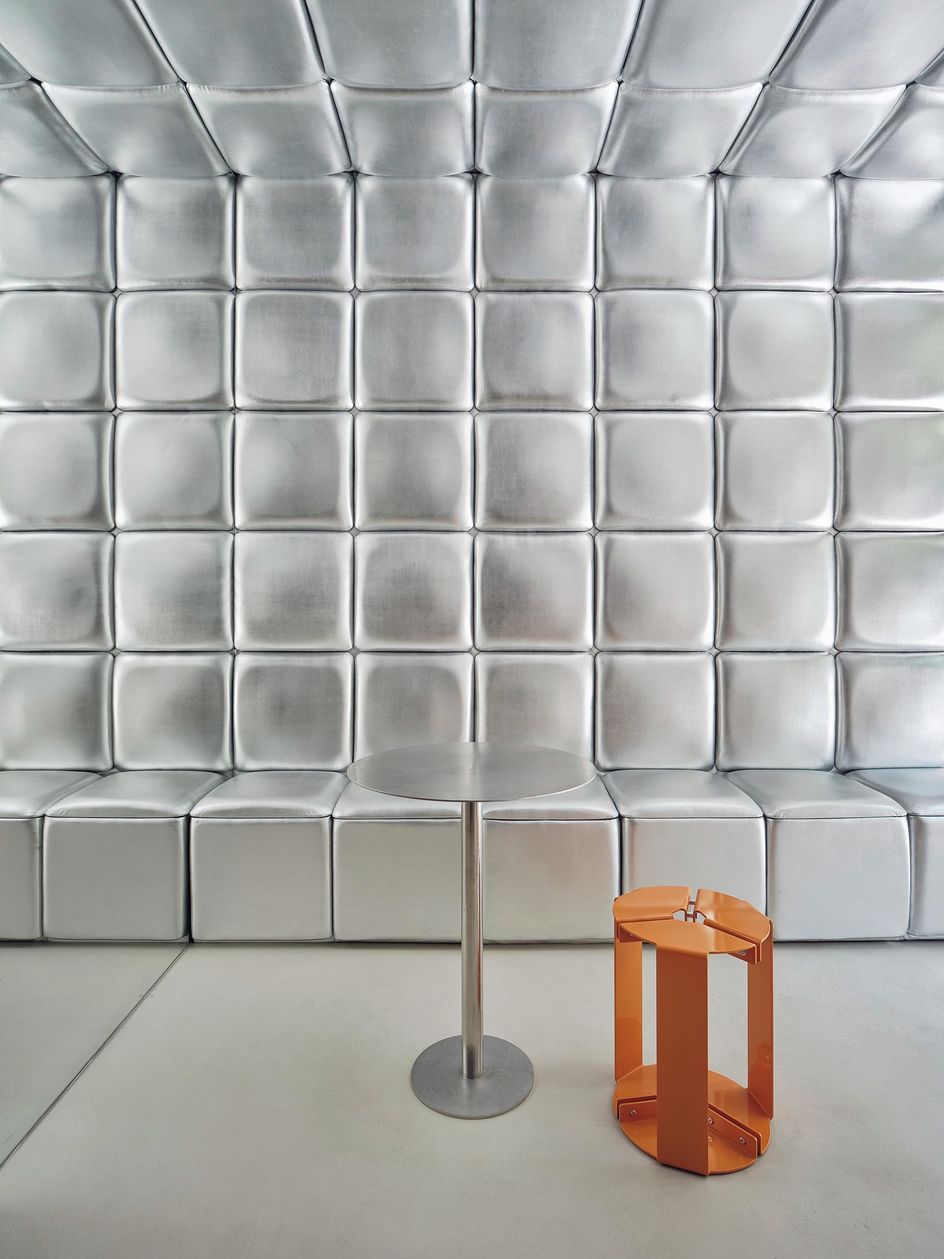 On the upper floor, a large custom-made sofa takes center stage, wrapping around the space and crafted from the same fabric. Surrounding it are circular stainless steel tables with stools designed by MLK Furniture specifically for RELLENO. The ceiling continues the grid of “rellenos,” and the walls feature mirrors and RGB lighting fixtures, creating an engaging interplay of light and reflections. At the center, an existing pillar has been clad in stainless steel and transformed into a table, topped with stainless steel and surrounded by orange stools. This area also plays with light, allowing for color changes depending on the desired atmosphere.