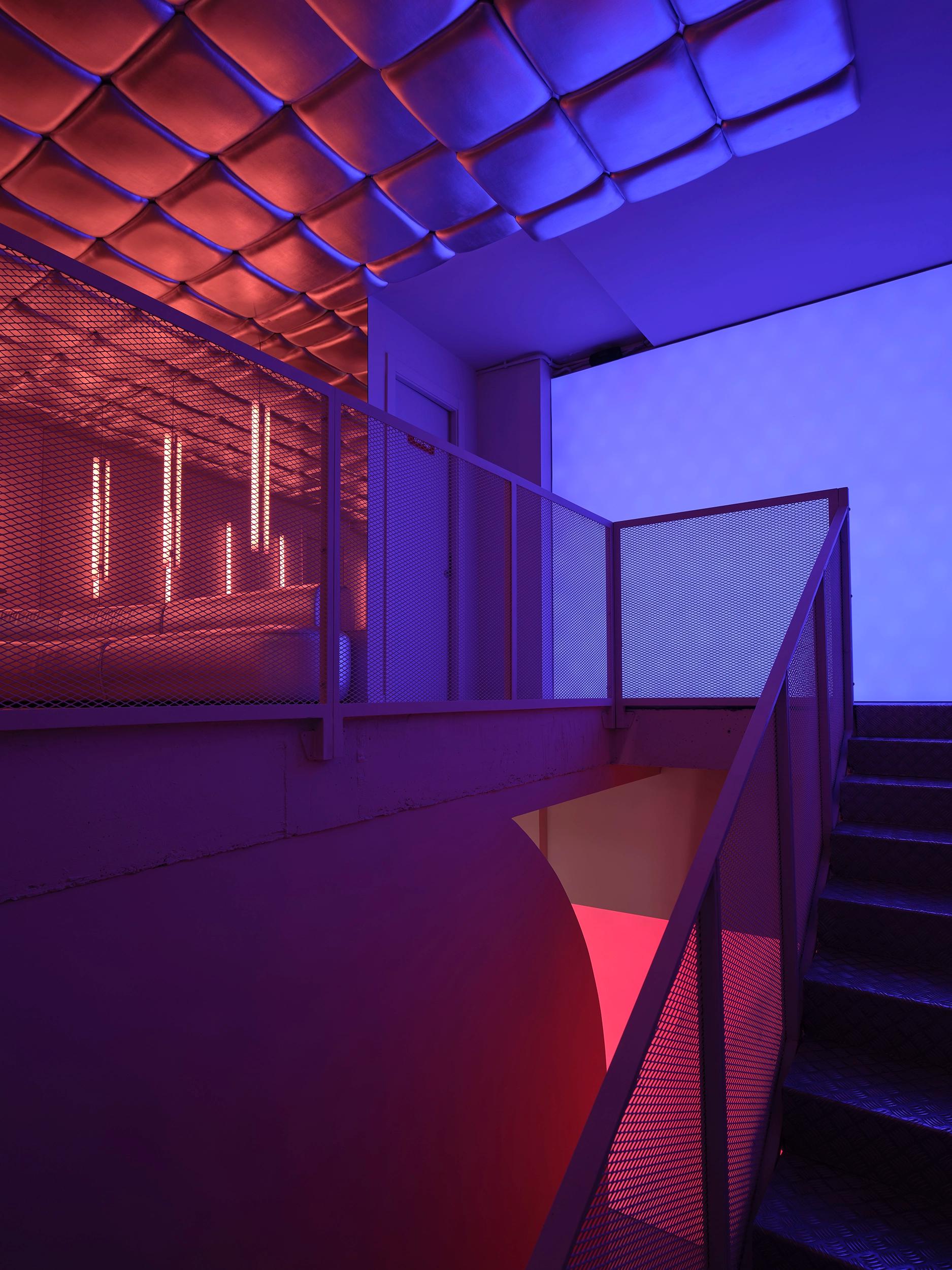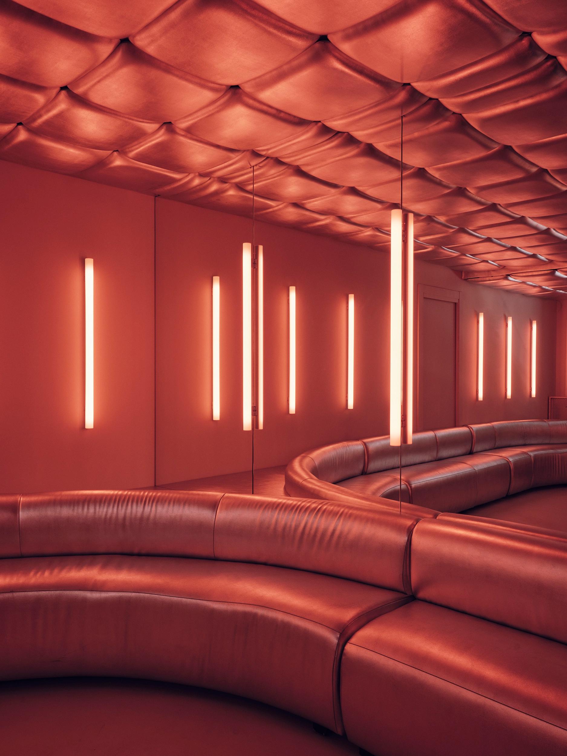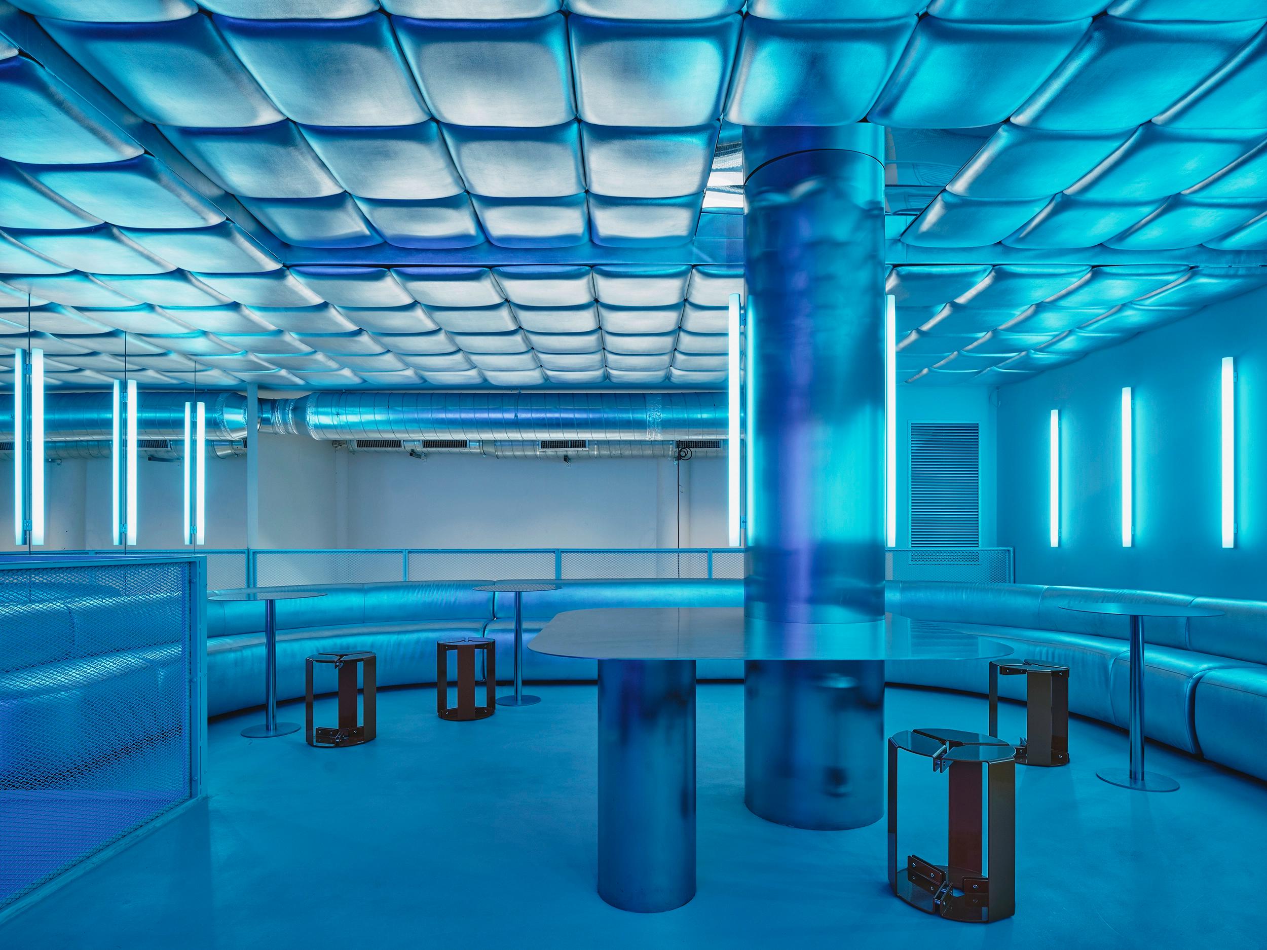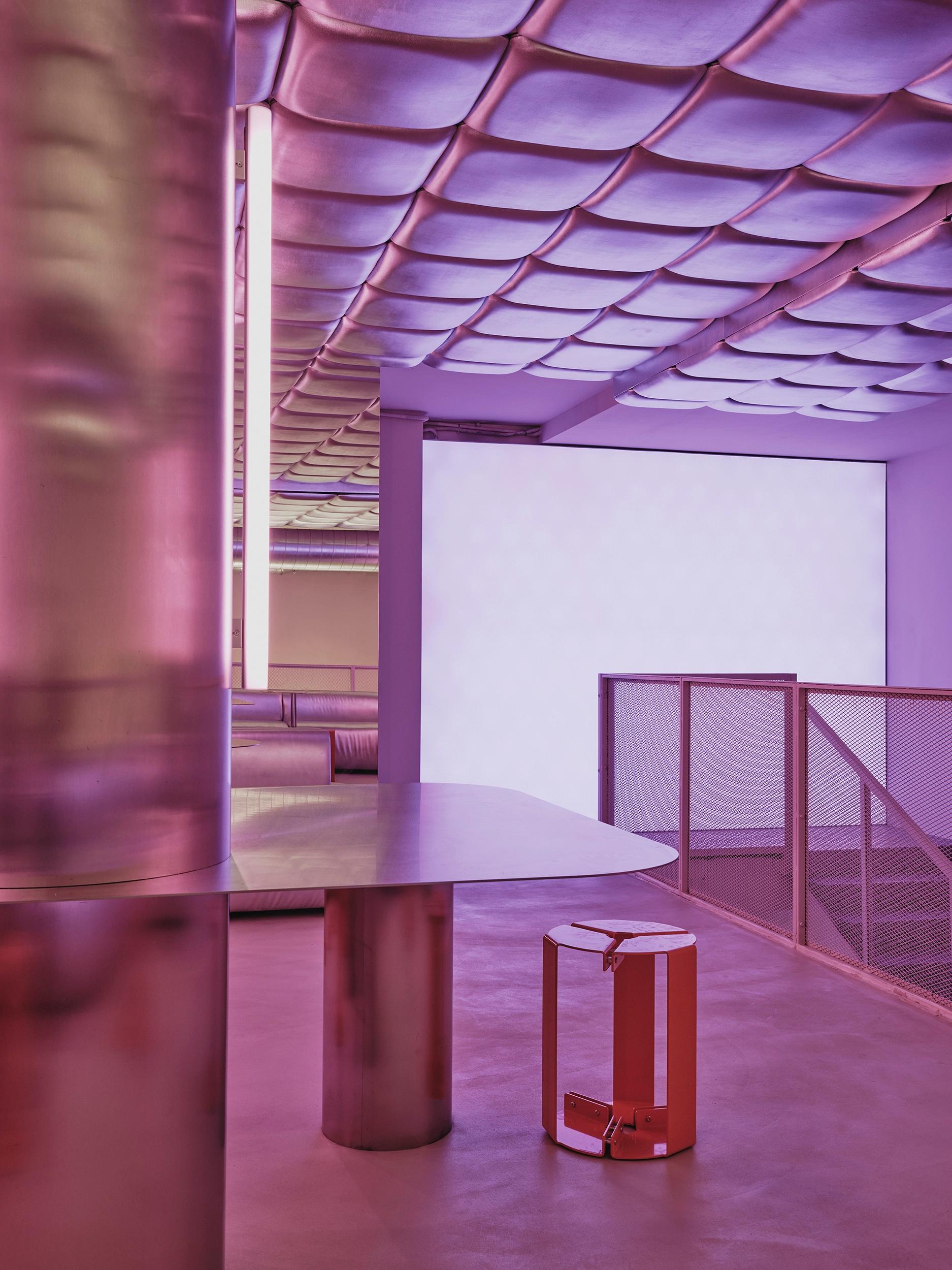 On the upper floor, a large custom-made sofa takes center stage, wrapping around the space and crafted from the same fabric. Surrounding it are circular stainless steel tables with stools designed by MLK Furniture specifically for RELLENO. The ceiling continues the grid of “rellenos,” and the walls feature mirrors and RGB lighting fixtures, creating an engaging interplay of light and reflections. At the center, an existing pillar has been clad in stainless steel and transformed into a table, topped with stainless steel and surrounded by orange stools. This area also plays with light, allowing for color changes depending on the desired atmosphere.