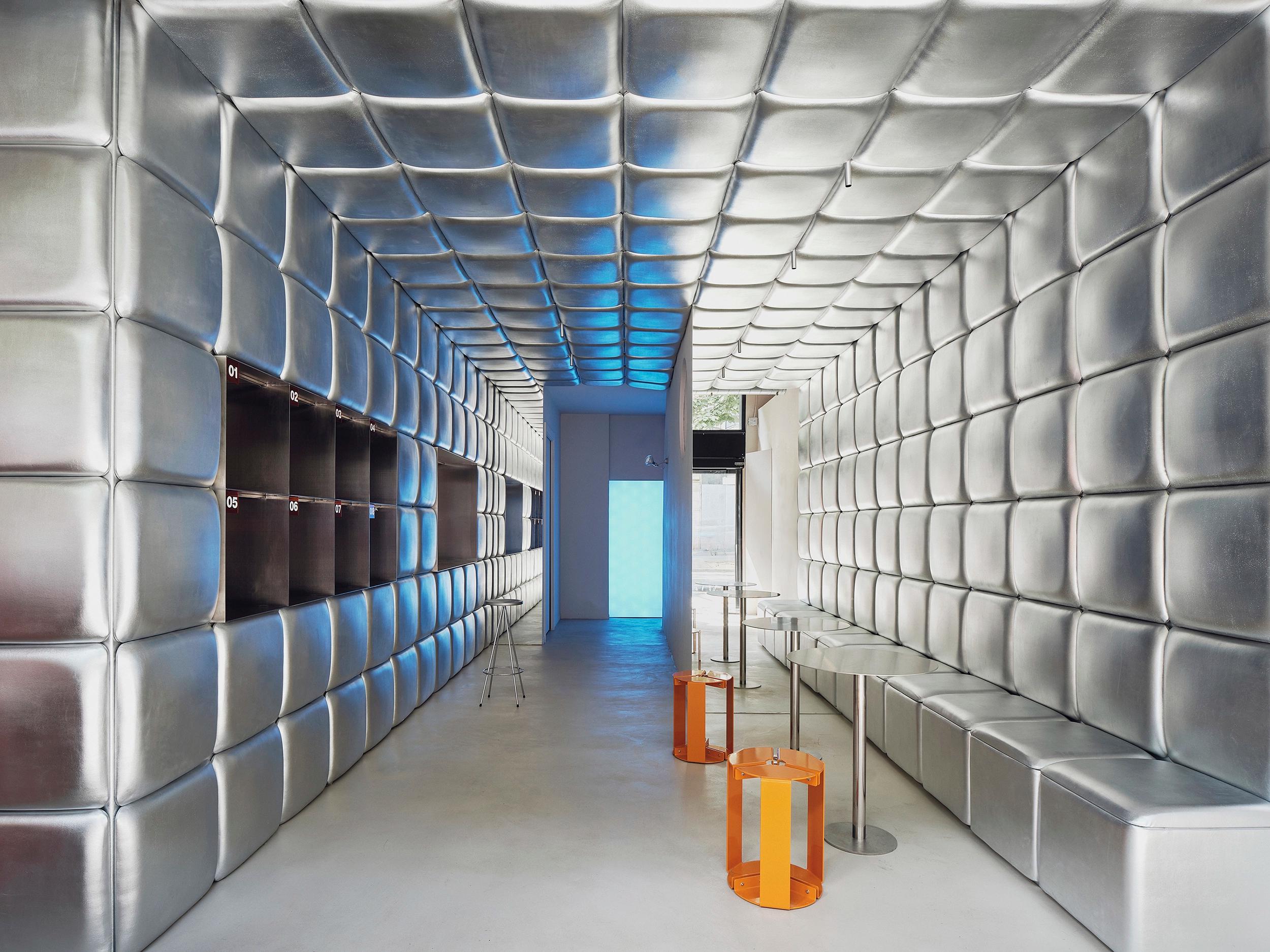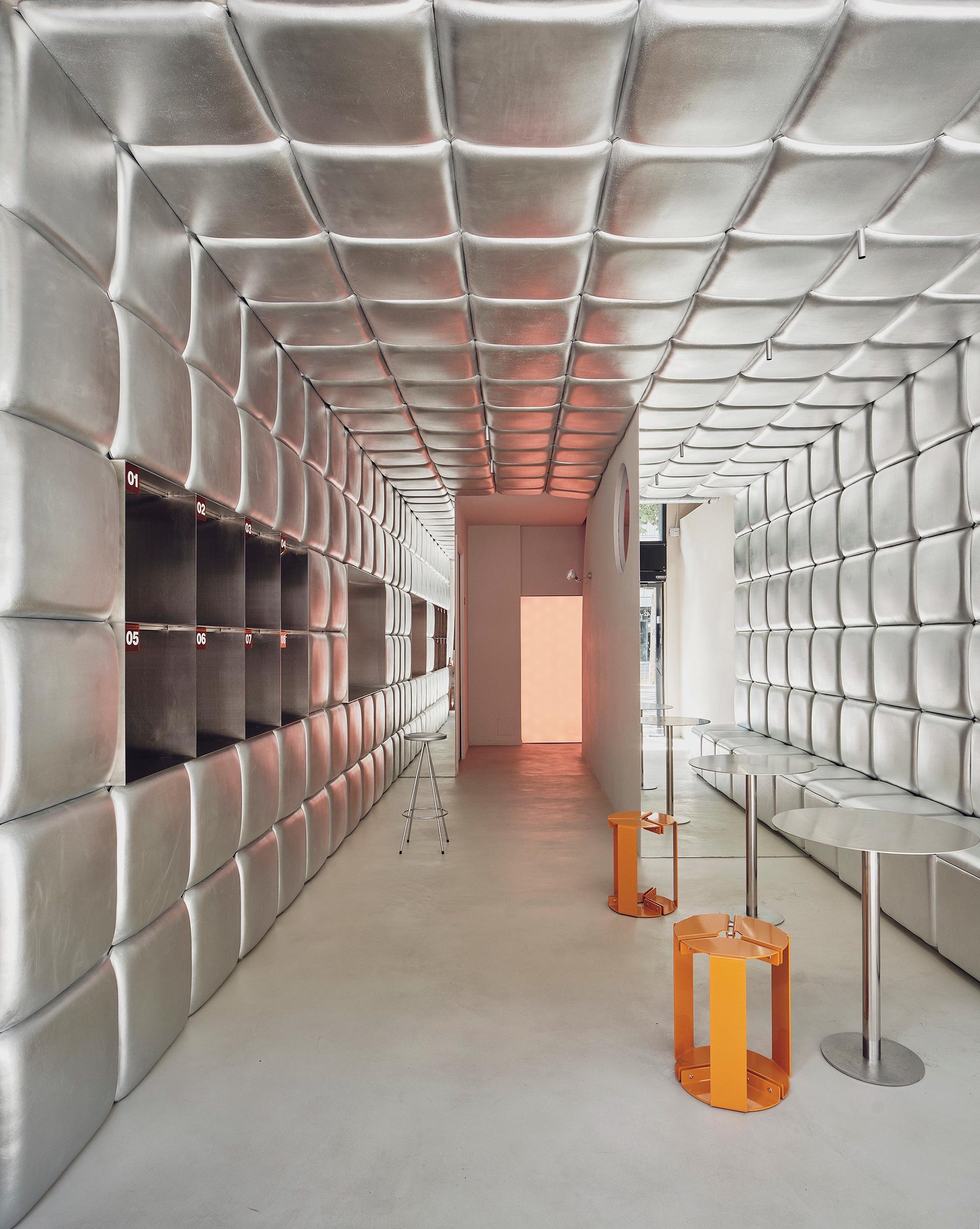 As you move further in, the ceiling lowers to three meters, creating a room within a room, filled with metallic "rellenos." On the right, customers can sit on poufs made from the same fabric; on the left, a dispenser cabinet packed with "rellenos" features numbered slots from 1 to 8, where customers can pick up their orders. A bit further in, a small bar offers a space to enjoy the delicious pasta on site.