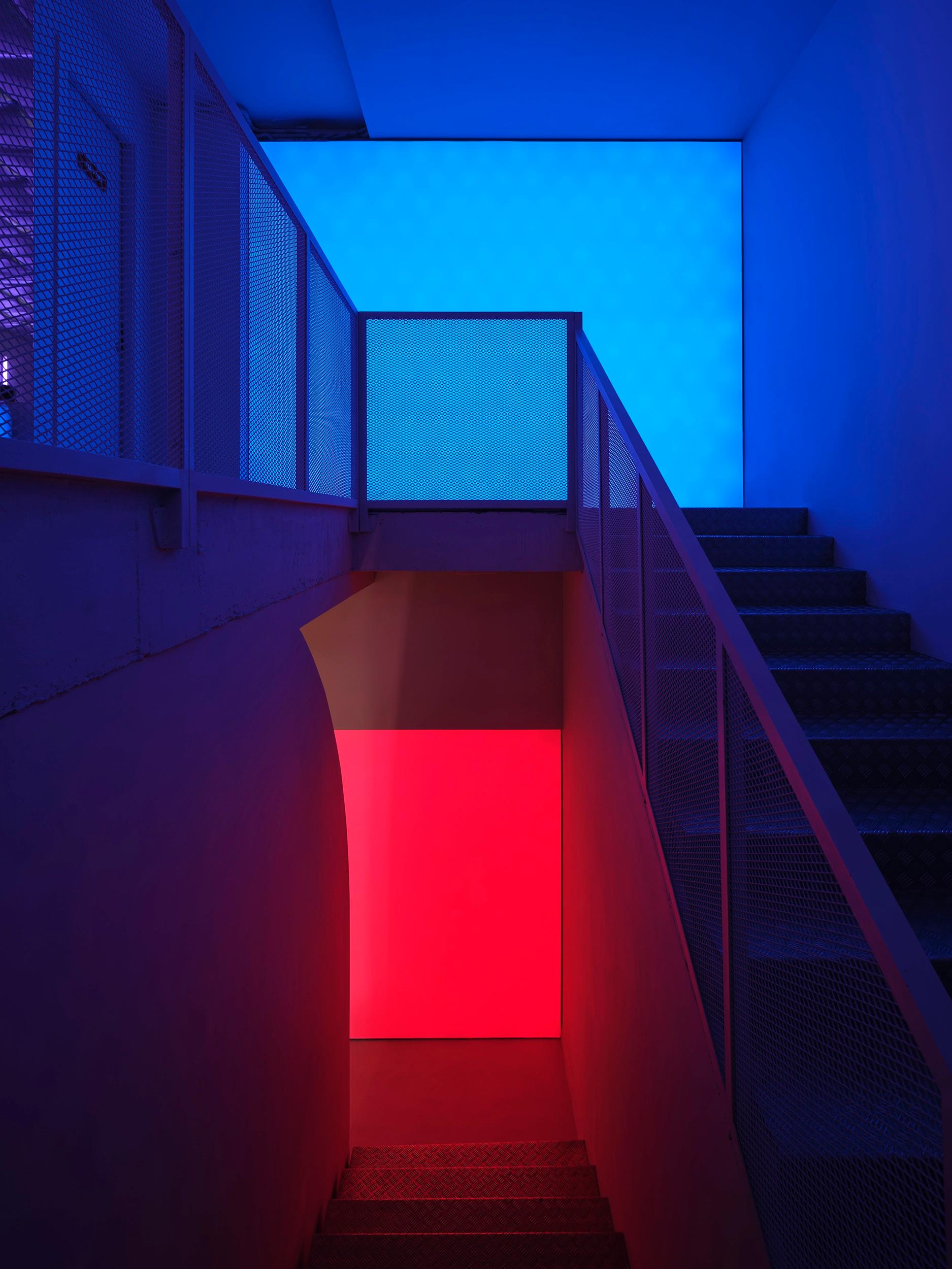 The bathroom, painted entirely in orange—the brand’s signature color—features a play of mirrors and lights that complements the overall design. Opposite the bathroom, a wall with a circular opening looks into the staircase, offering a glimpse of the lighting effects on the upper floor. This opening is accompanied by a lamp from Ingo Maurer.