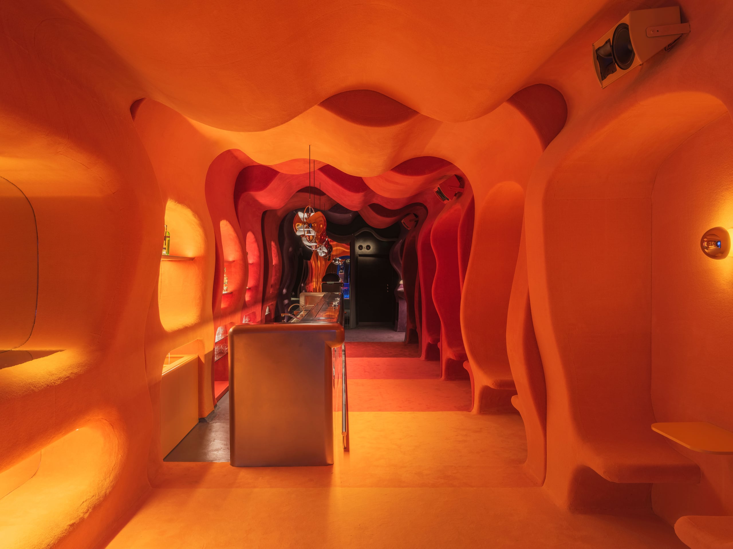 Finally, the lighting integrated into the "rellenos" is especially noteworthy. A metallic-toned spotlight emerges from the center of the junction between four “rellenos,” merging seamlessly in both shape and color. In the dispenser slots and at the bar area, LED strips also bathe the space in orange light, reinforcing the brand’s visual identity.