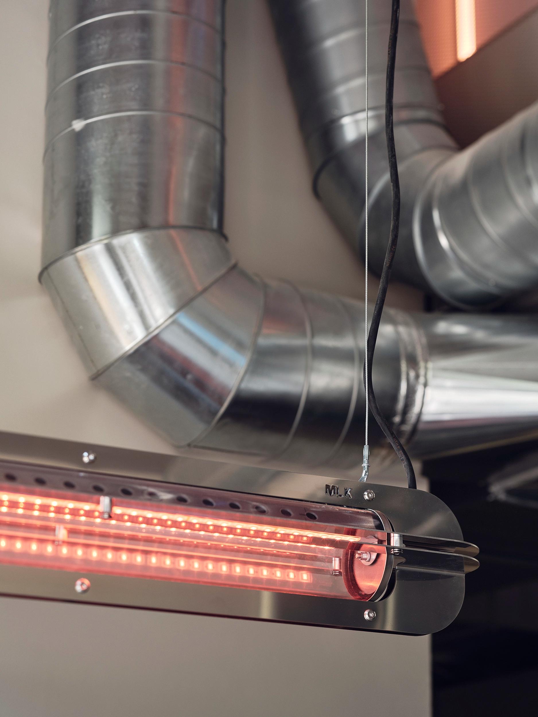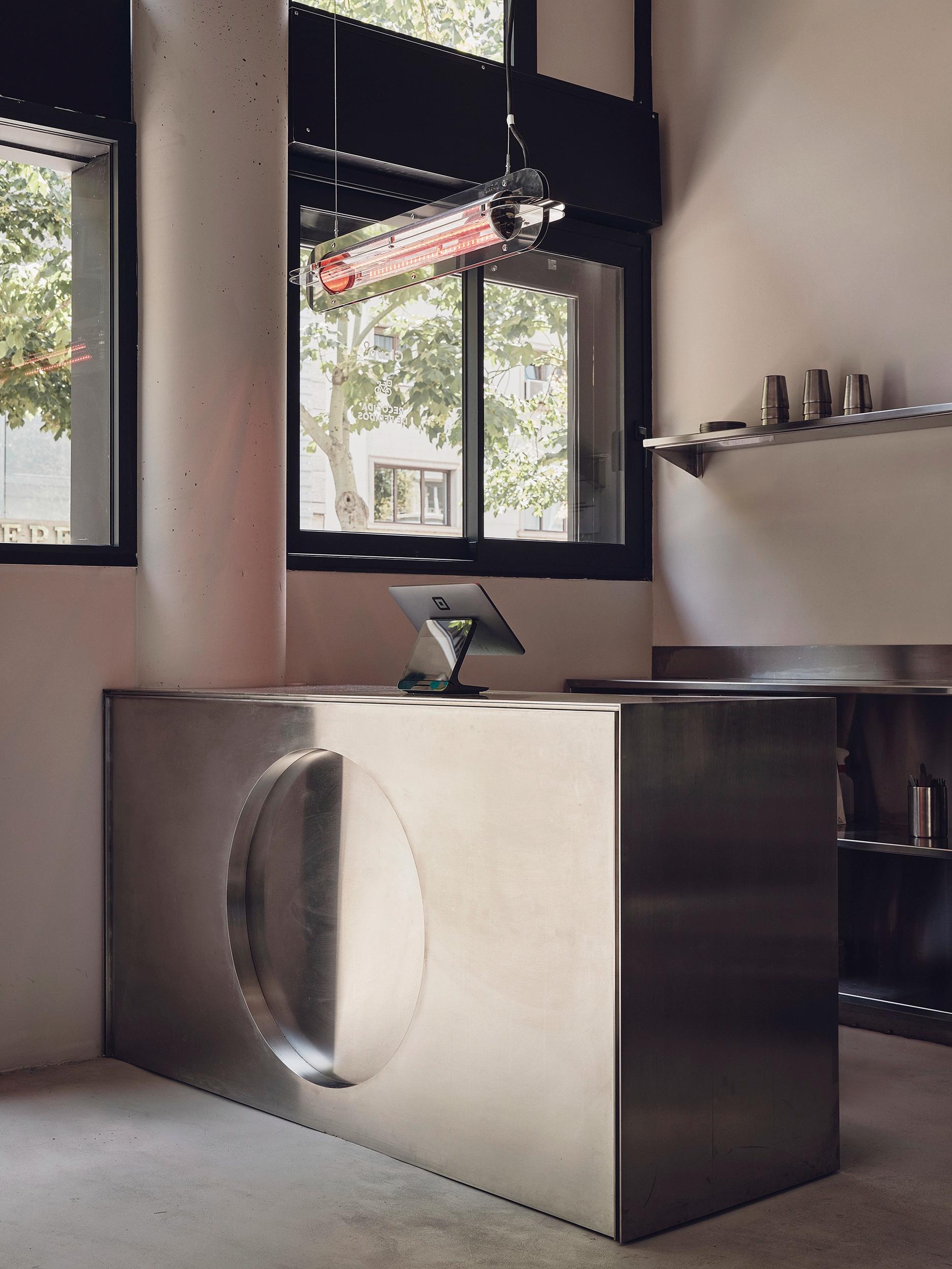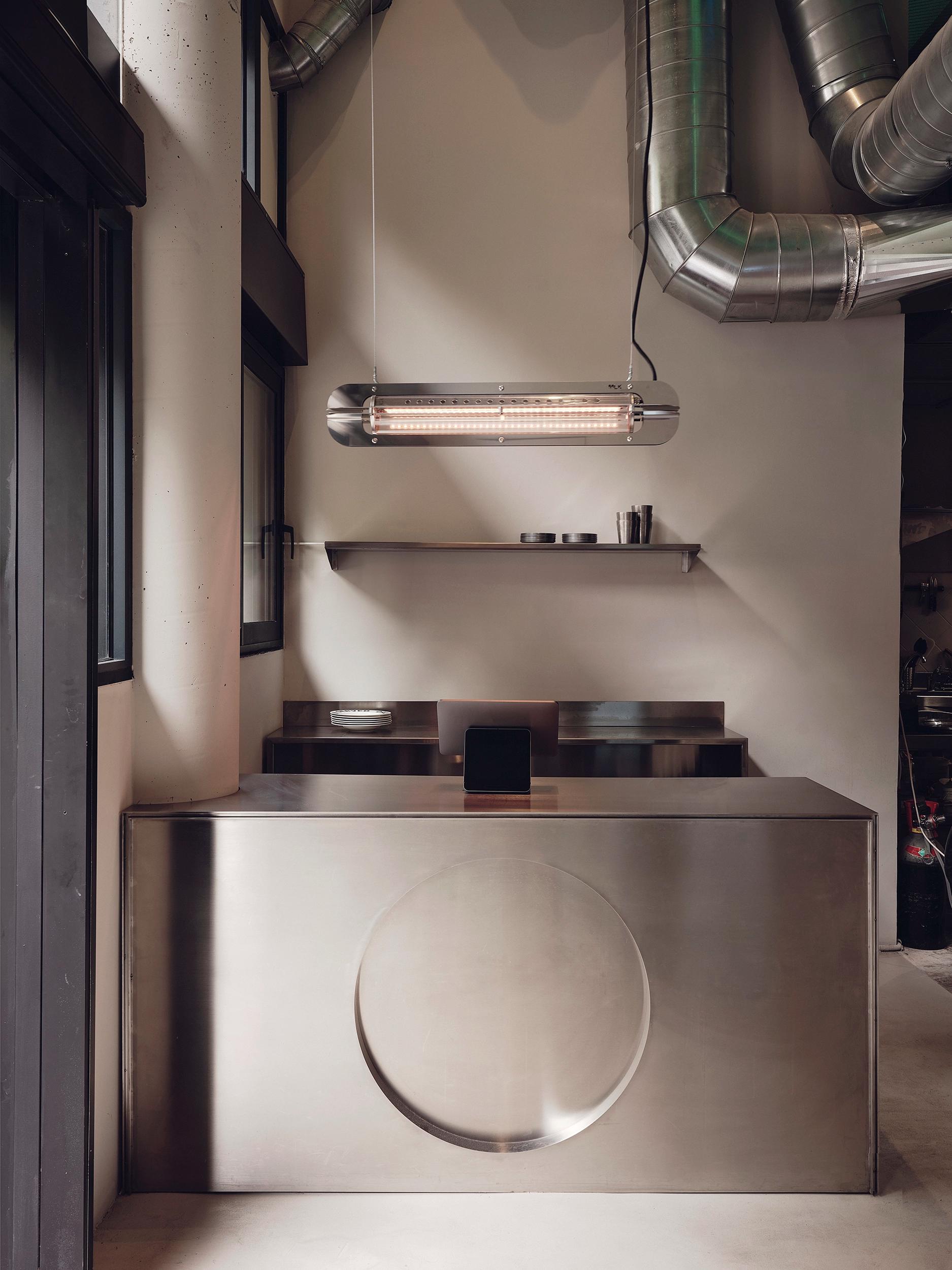 The venue is spread over two floors. Upon entering the main level, visitors encounter a space with a five-meter-high ceiling. To the right are digital kiosks for placing orders, maintaining the brand’s strong connection with the digital world. To the left is a counter designed to encourage human interaction, reflecting the brand’s desire to connect directly with customers in this first physical location. Both the counter and back counter are made of stainless steel, a material that complements the brand’s sophistication. An inox lamp by French artist MLK Furniture hangs over the bar, suspended from the ceiling at a height of four meters.
