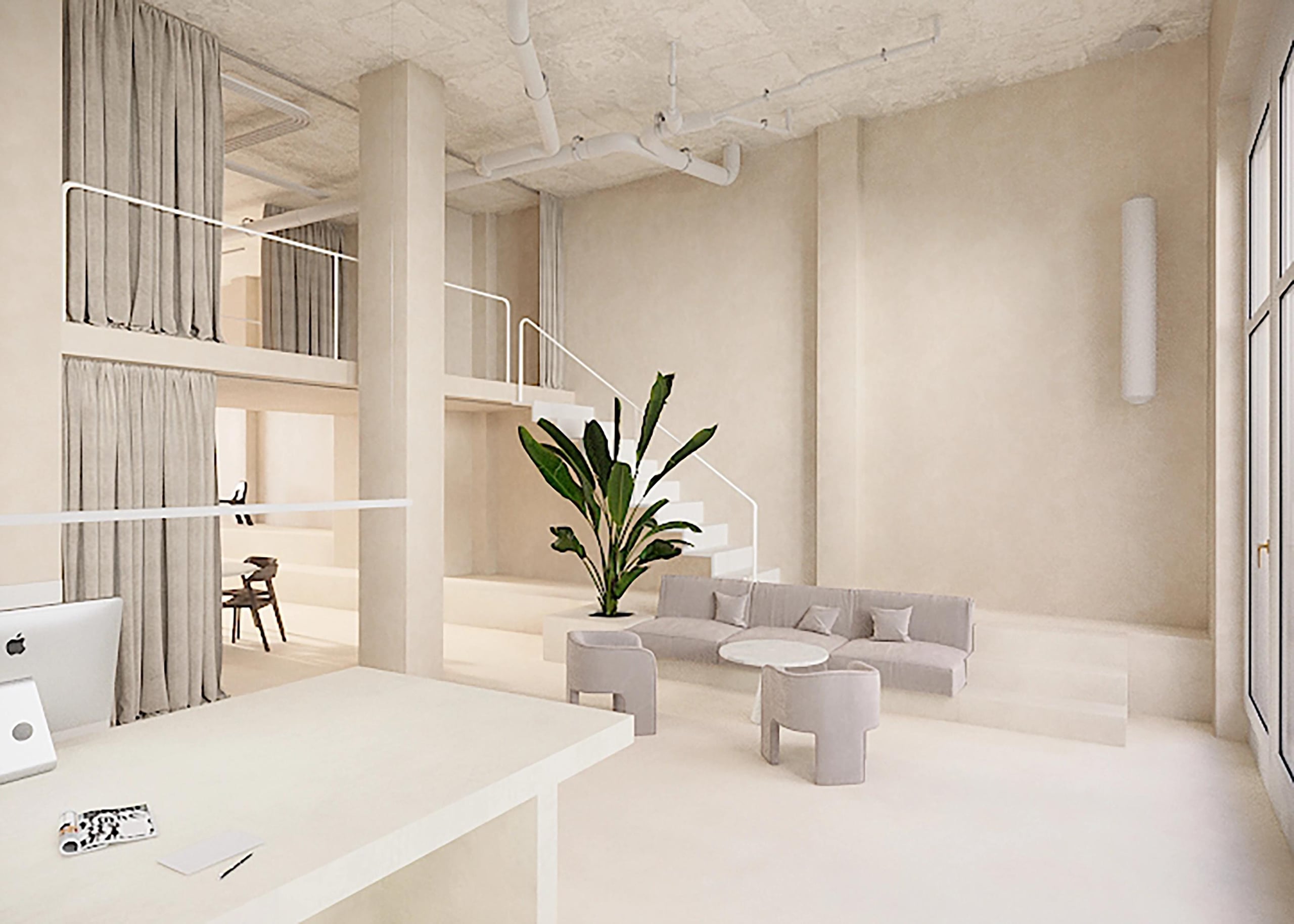 Upon entering the space, we find a large concrete step, which crosses the entire space until it reaches the end. An architectural element that in all its dimension, not only serves to exhibit objects but also to sit while waiting for the coffee, or to receive the public that comes to see a talk or exhibition given by a guest. To the right, and under a structural arch of the building, is the coffee space with a mirrored bar with a stainless steel countertop. In the public area, there is also a Three Marks Coffee corner, which makes every visit more pleasant and warm with its specialized coffee. The mezzanine can be closed with curtains both at the top and at the bottom, providing not only different degrees of privacy but also an element to divide the different areas.