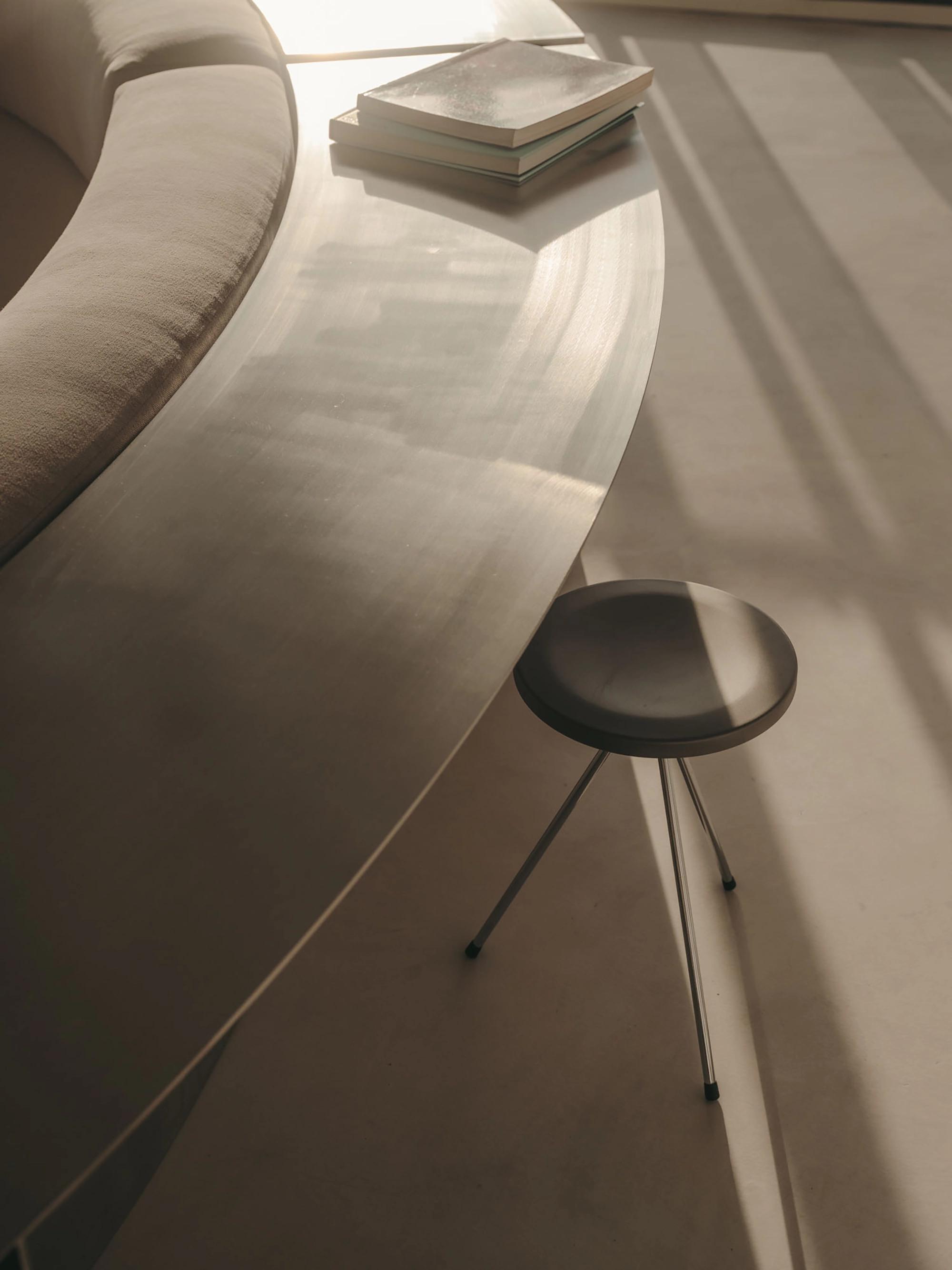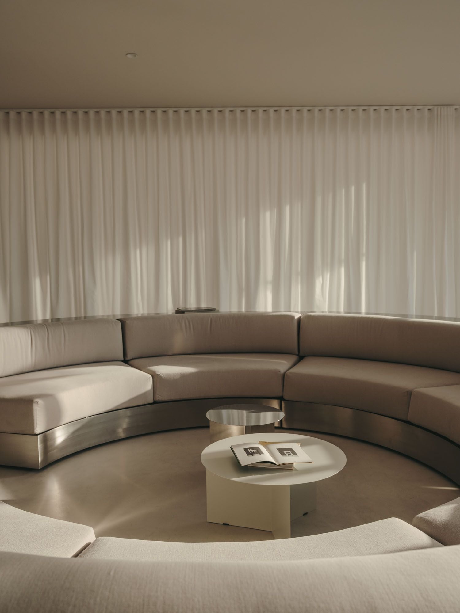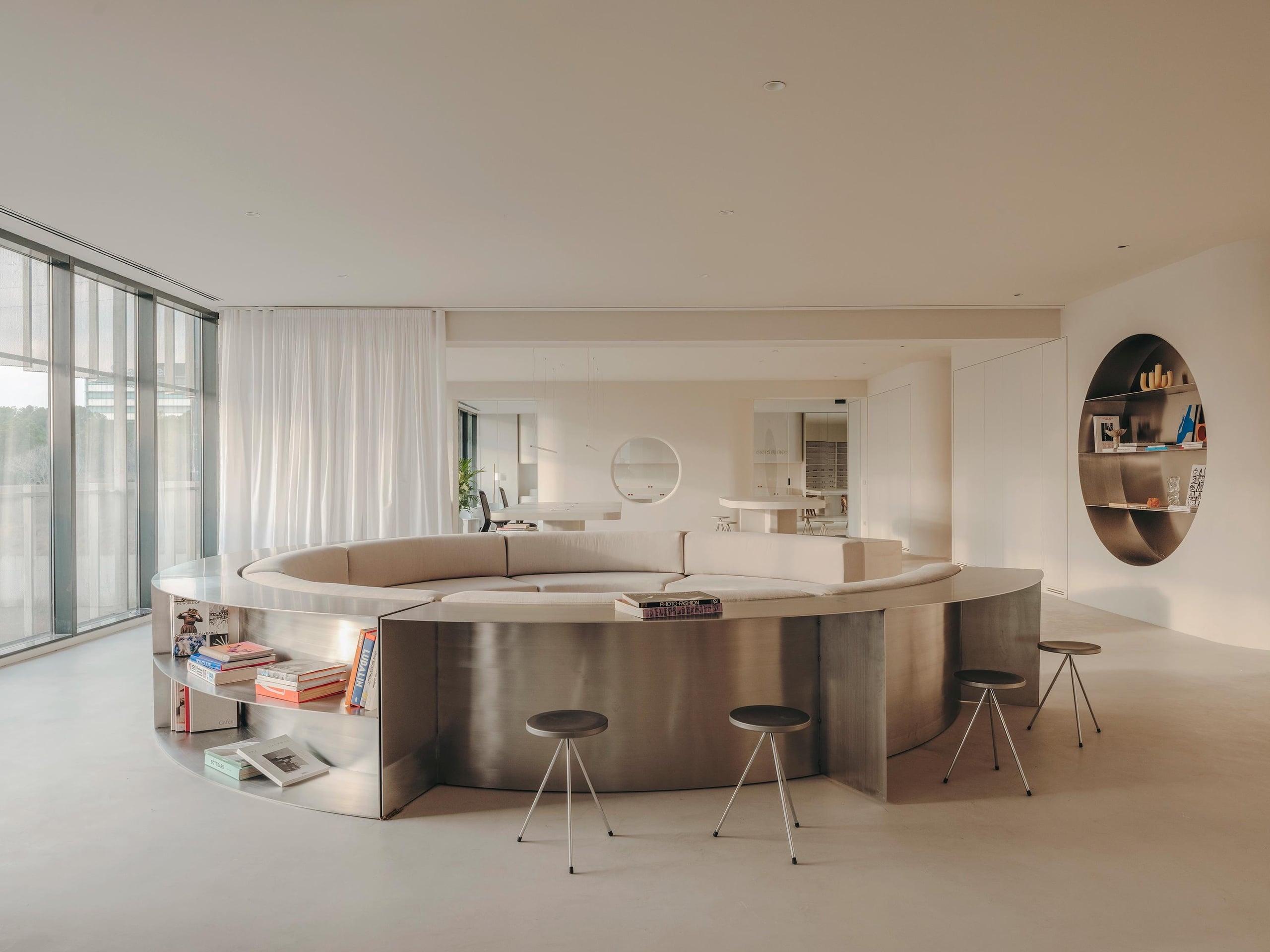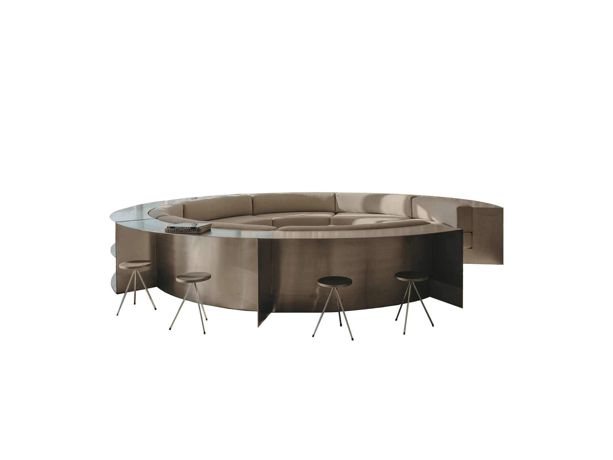 For the Gigi Studios office project, a large, custom-designed stainless steel circular sofa is presented as a sculptural piece that defies furniture conventions. The versatility of the circular sofa makes it a central element in the workspace, where comfort and functionality are harmoniously intertwined. Its sculptural presence not only beautifies the environment, but also inspires those who use it, fostering a sense of community and collaboration.