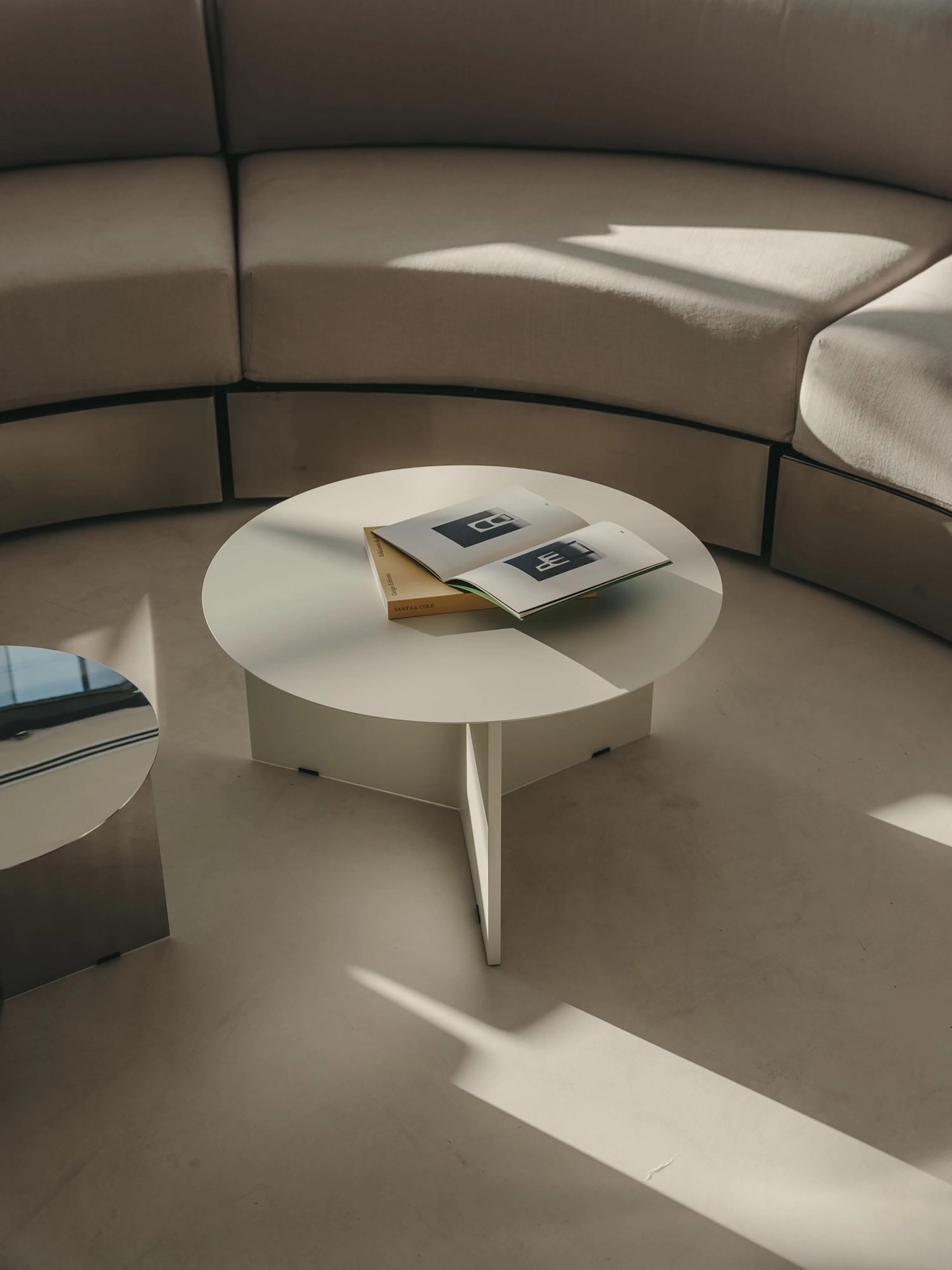 On the inside, the sofa's soft curves invite seating, creating a welcoming environment and encouraging communication and the exchange of ideas, making it the ideal place for informal meetings or brainstorming sessions. Around the perimeter, the sofa transforms into work tables and book storage, integrating functionality without sacrificing aesthetics. This feature allows the space to remain organized and accessible, with books and materials within easy reach, which is essential to the creative process. The inox surface subtly reflects light, adding a bright dimension to the environment. In short, this circular sofa is not just a piece of furniture, it intensifies creativity and interaction.
