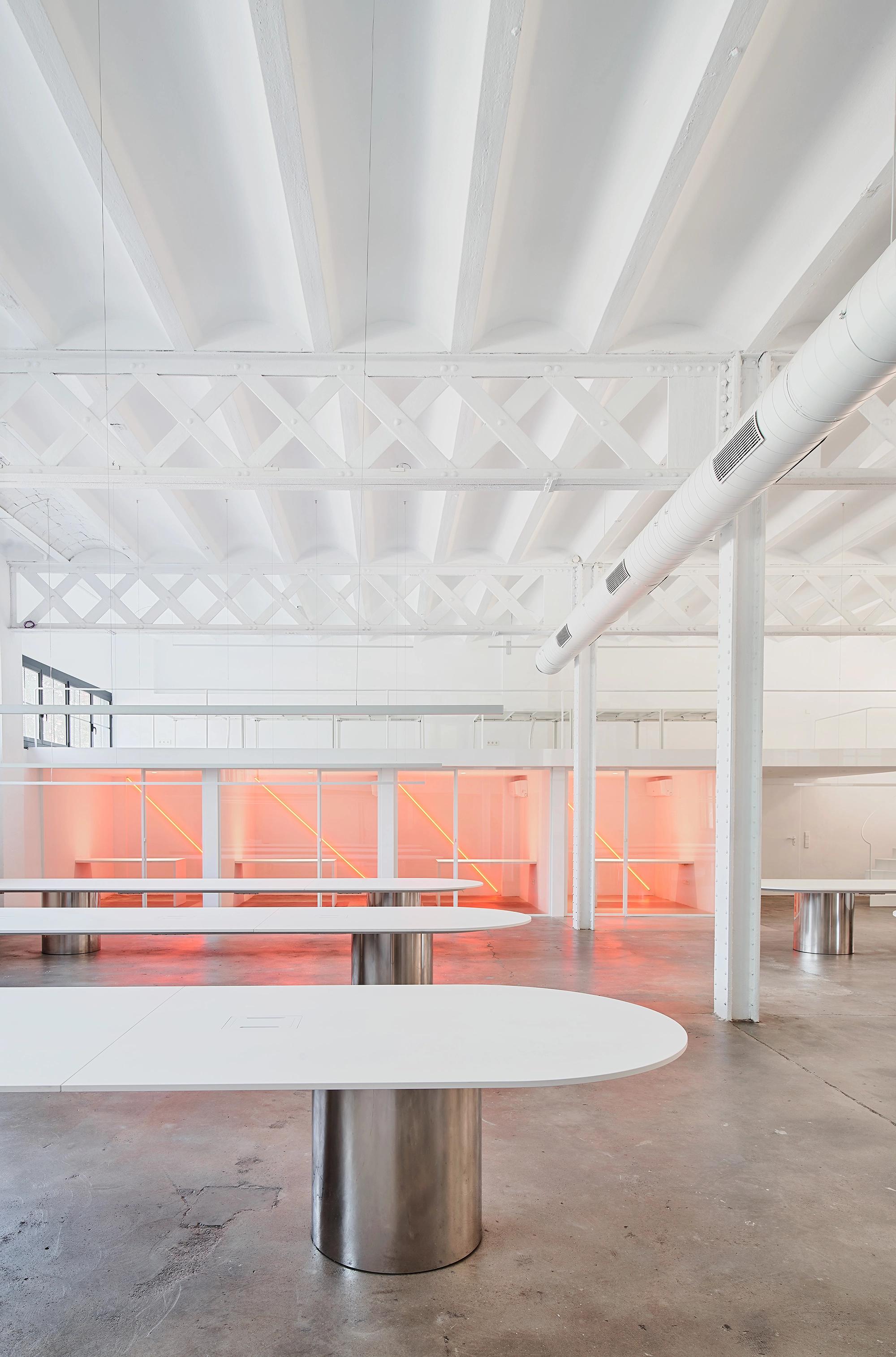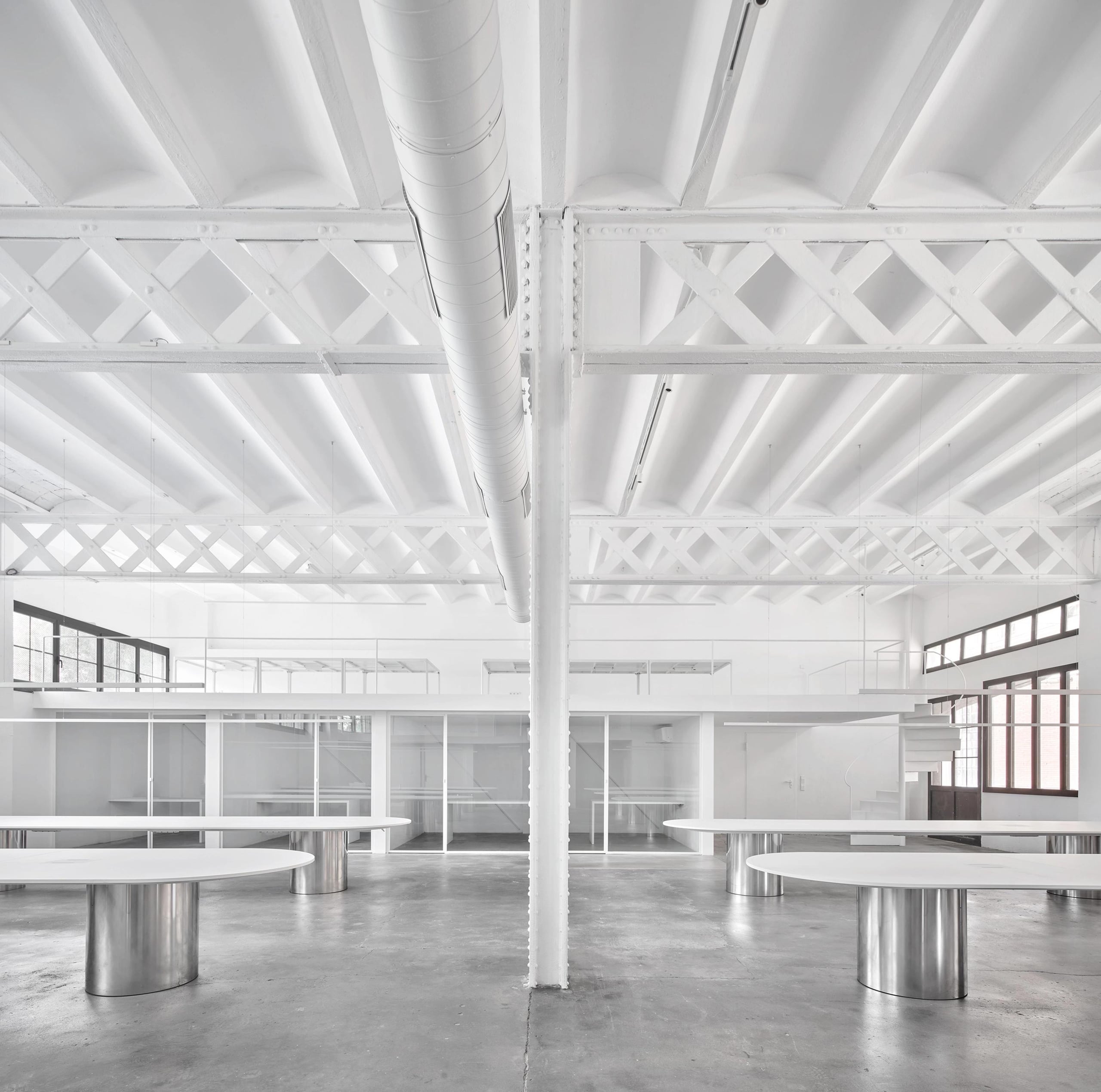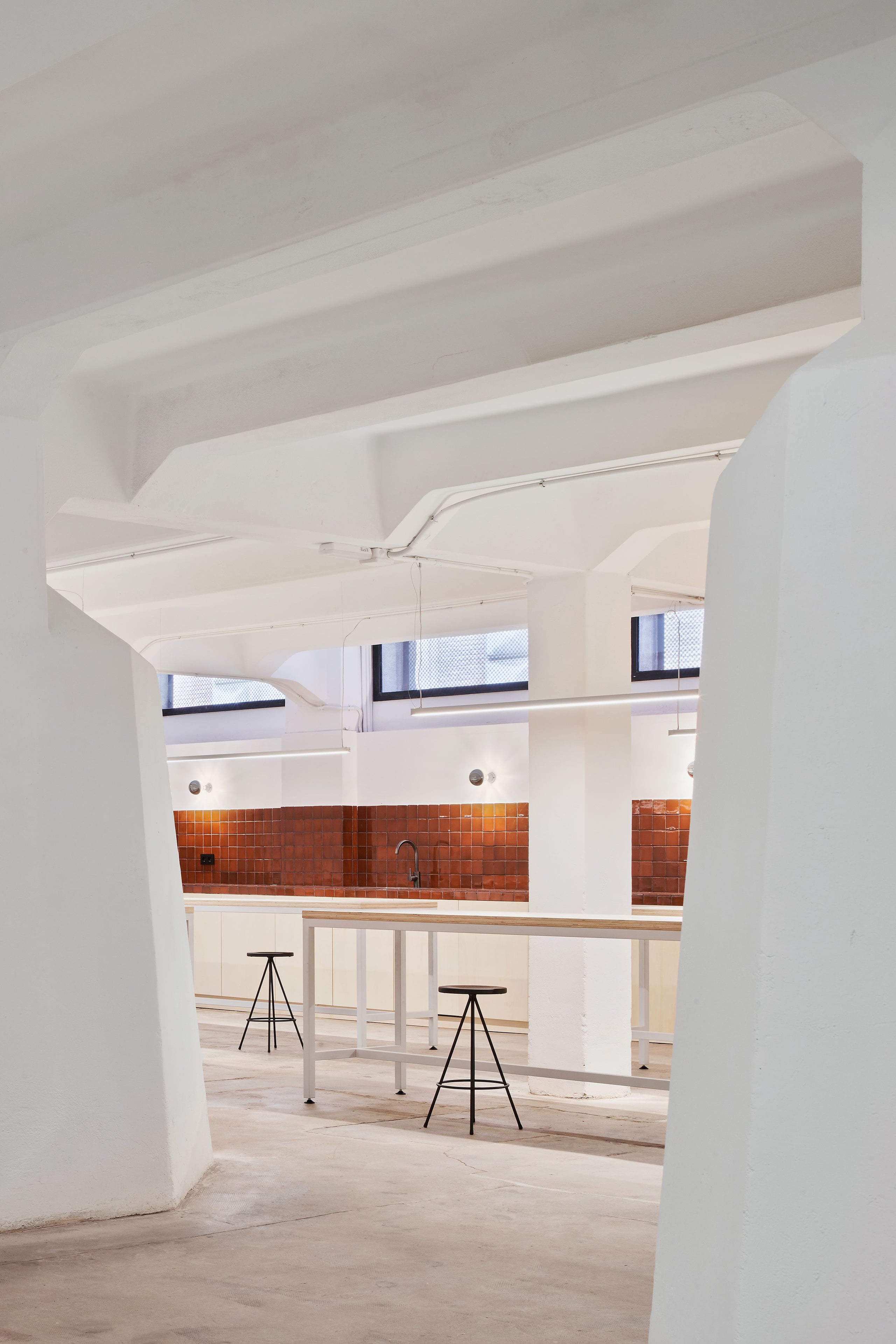 The concrete floor is polished and varnished to maintain the industrial atmosphere. The custom-designed tables consist of circular stainless steel legs and a large white top with a circular finish. The lamps are from Difusiona as is the entire lighting project. The windows were painted black to emphasize their rhythm. The lower floor has a large kitchen with 10x10 centimeters glossy terracotta ceramic tiles and poplar doors. Tables on wheels make up the dining area. Large central pillars separate the leisure area from the meeting rooms. All the original terracotta flooring is maintained original, only polished and varnished.