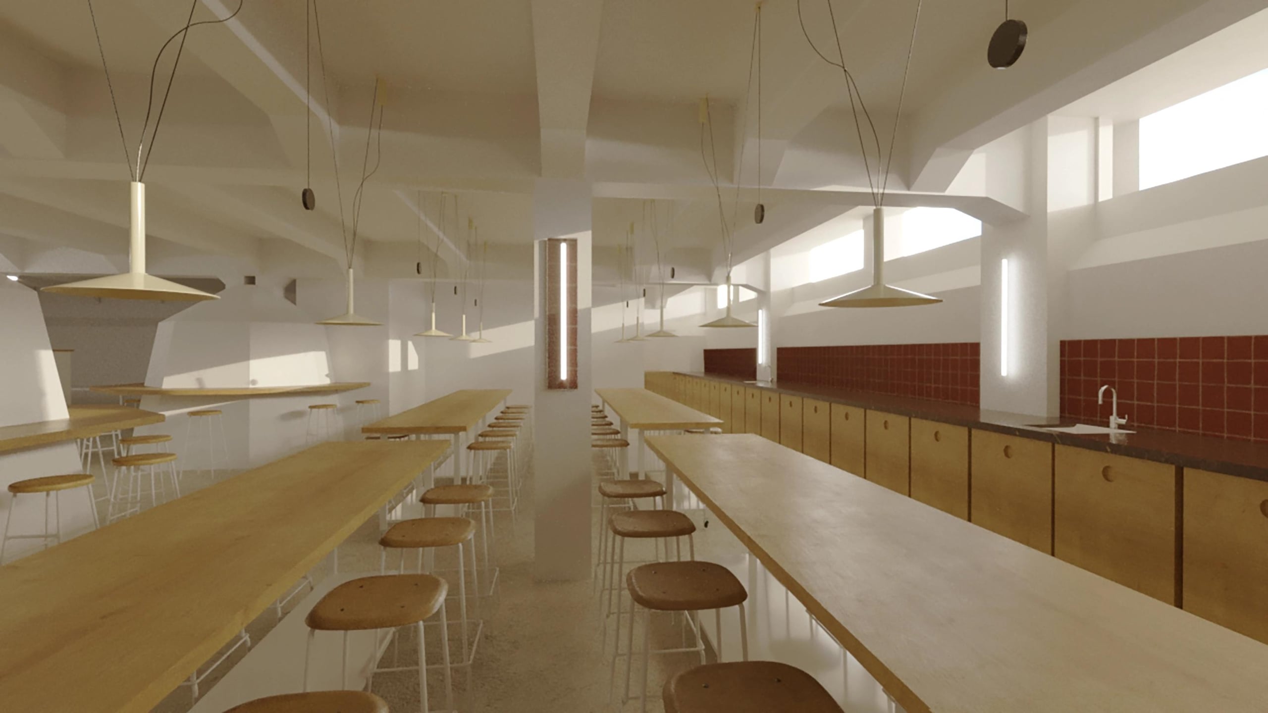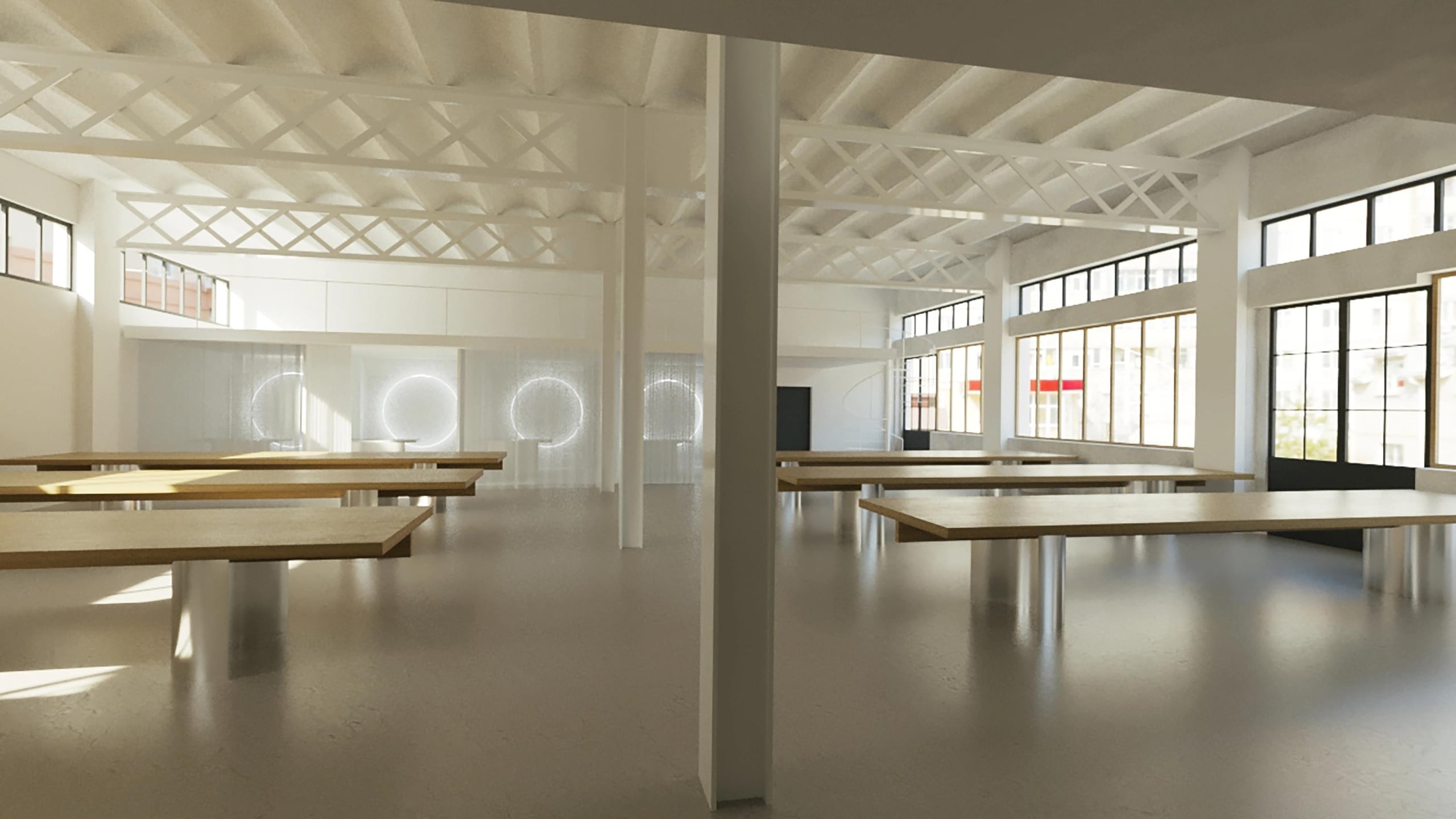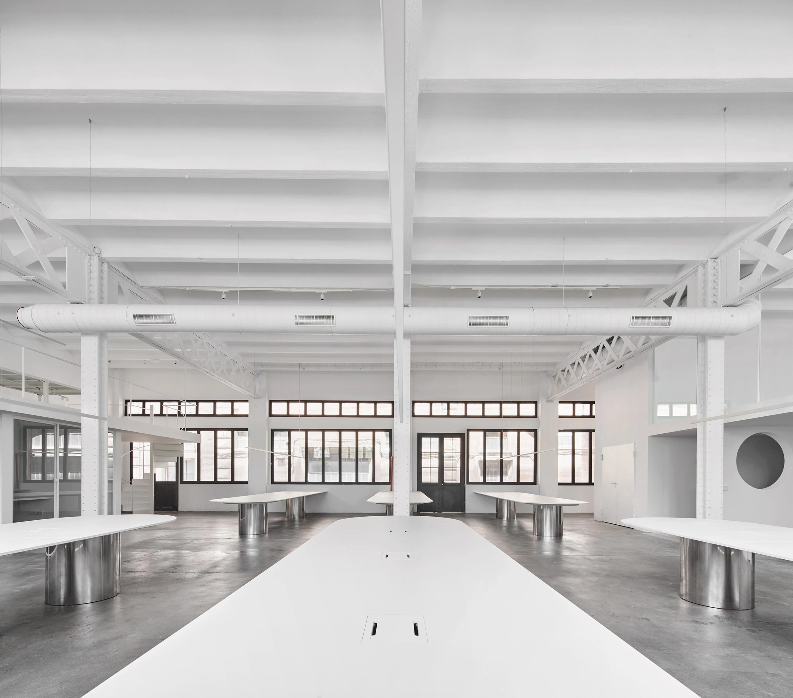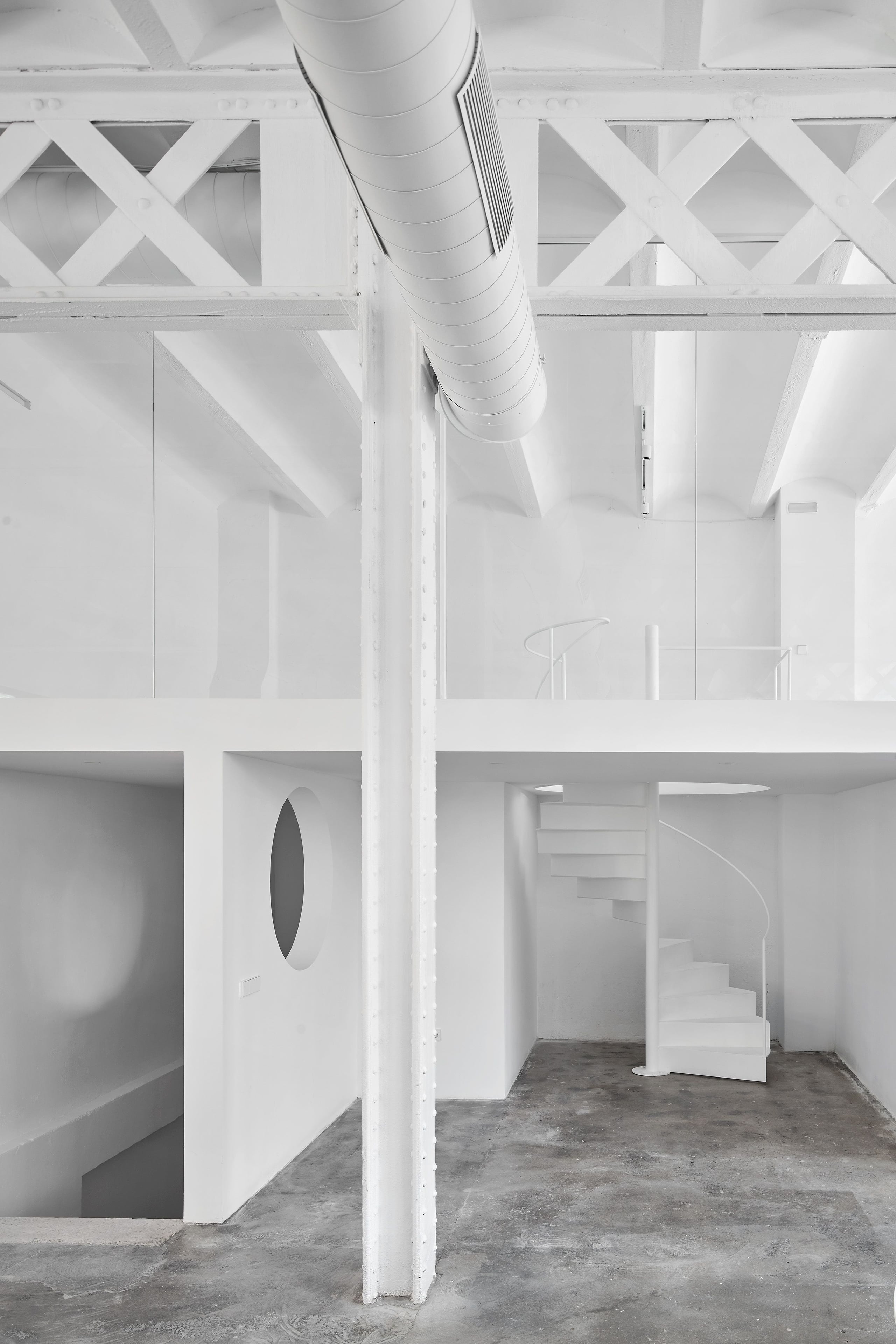 The concrete floor is polished and varnished to maintain the industrial atmosphere. The custom-designed tables consist of circular stainless steel legs and a large white top with a circular finish. The lamps are from Difusiona as is the entire lighting project. The windows were painted black to emphasize their rhythm. The lower floor has a large kitchen with 10x10 centimeters glossy terracotta ceramic tiles and poplar doors. Tables on wheels make up the dining area. Large central pillars separate the leisure area from the meeting rooms. All the original terracotta flooring is maintained original, only polished and varnished.