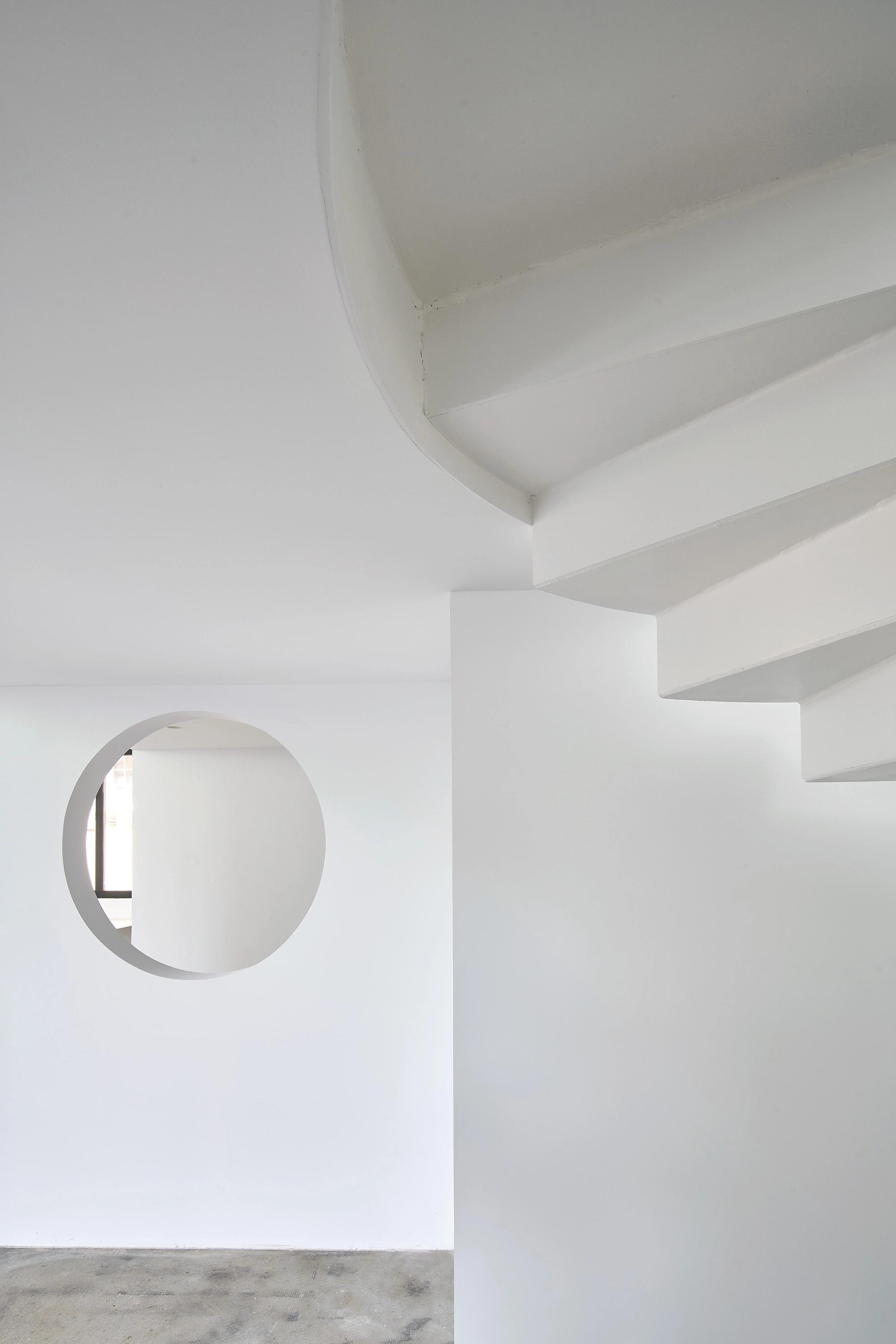 The first staircase is placed outside the mezzanine and is connected to it with a small metal platform. The second staircase is placed inside the second mezzanine. A circular horizontal opening is generated that dialogues with a second vertical opening in the wall to give more light to the existing stairs that give access to the lower floor.