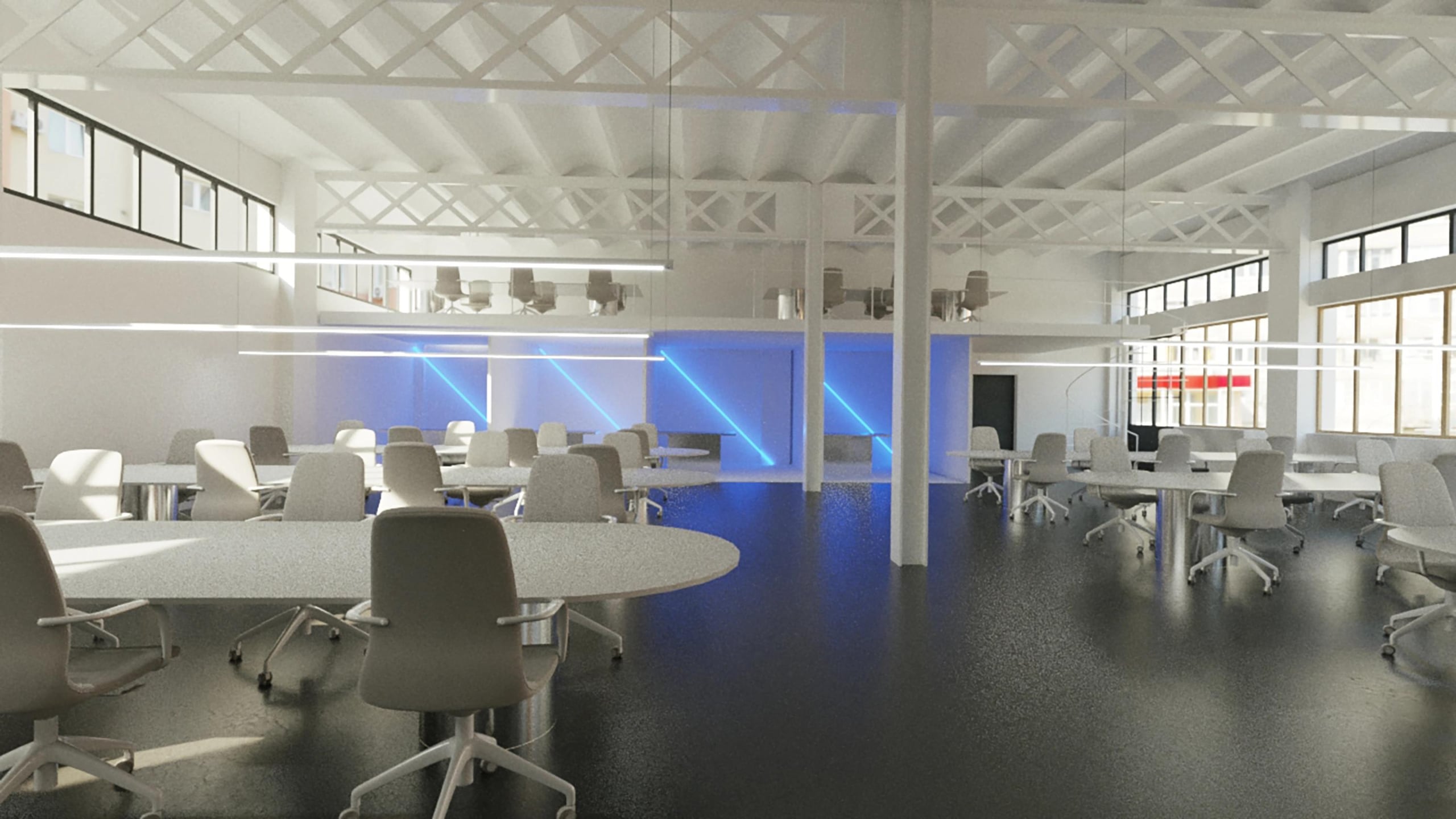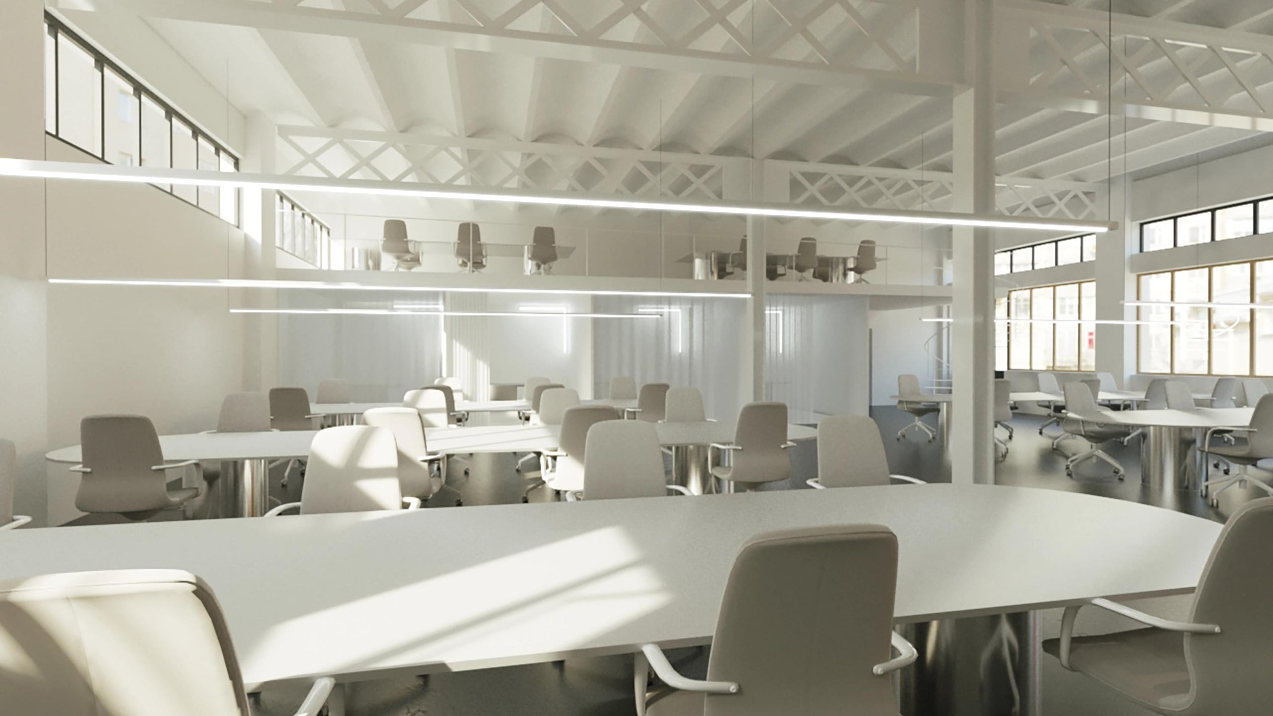 The program consisted of a work area for thirty people, different meeting rooms, a main meeting room, kitchen and dining area and "fast calls". The first decision was to locate the common kitchen and dining area on the lower floor near the windows, leaving the rest of the space for fast calls and two meeting rooms.