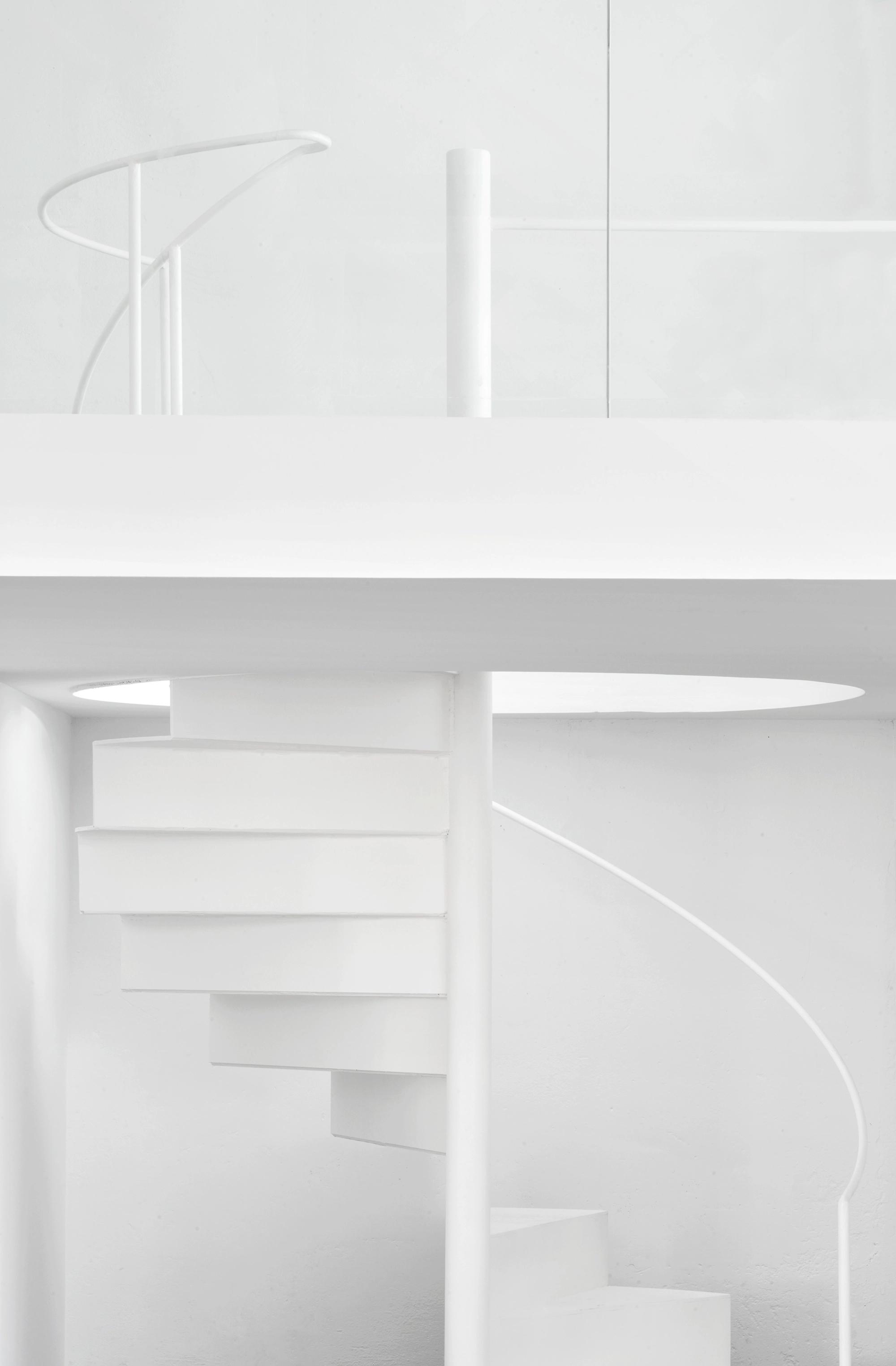 The staircases are spiral shaped, made of bent sheet metal with a central pillar. The 2 cm section tubular railing runs along the staircase and becomes the railing of the mezzanine. A subtle and fine element that enhances the verticality of the staircase.