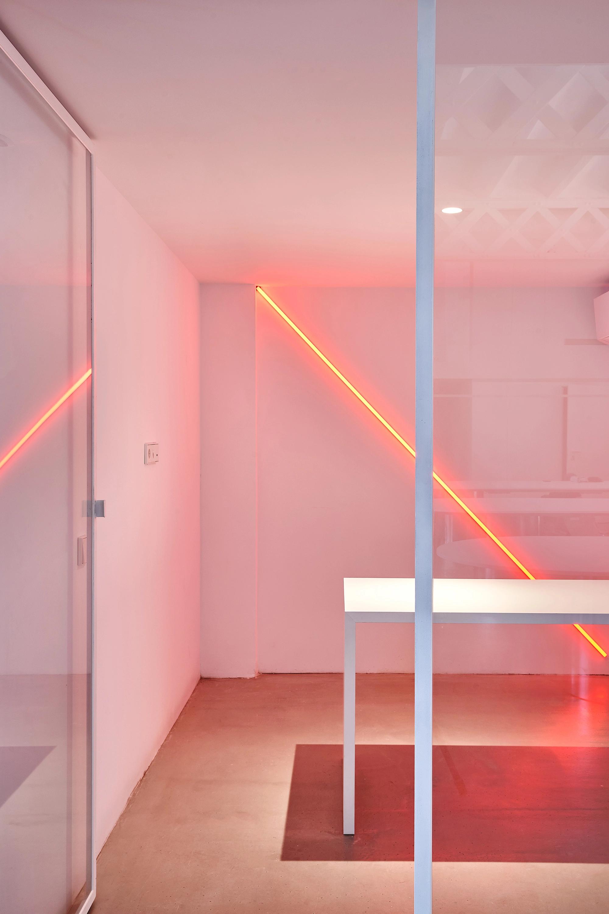 Another great fundamental element in the project is the lighting, the use of the color of light in lines that refer to the corporate logo finish fixing the identity of the company in the space.