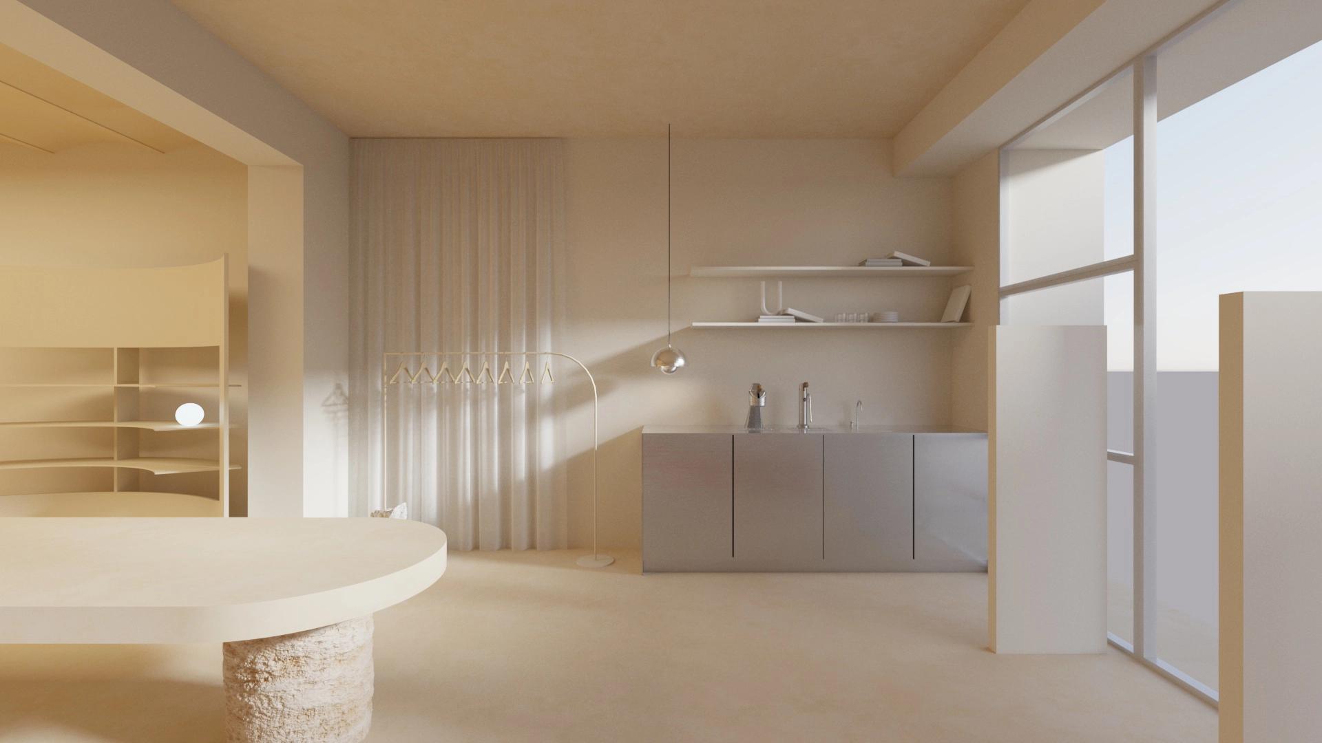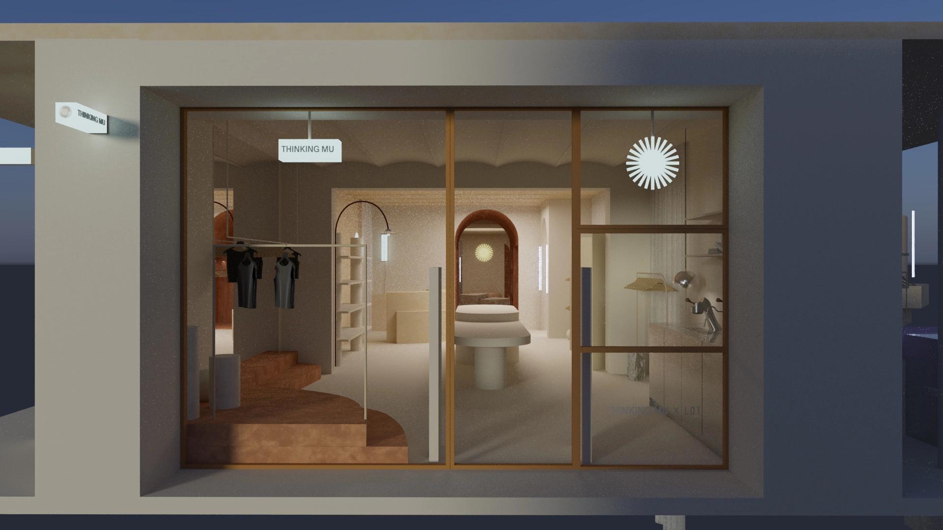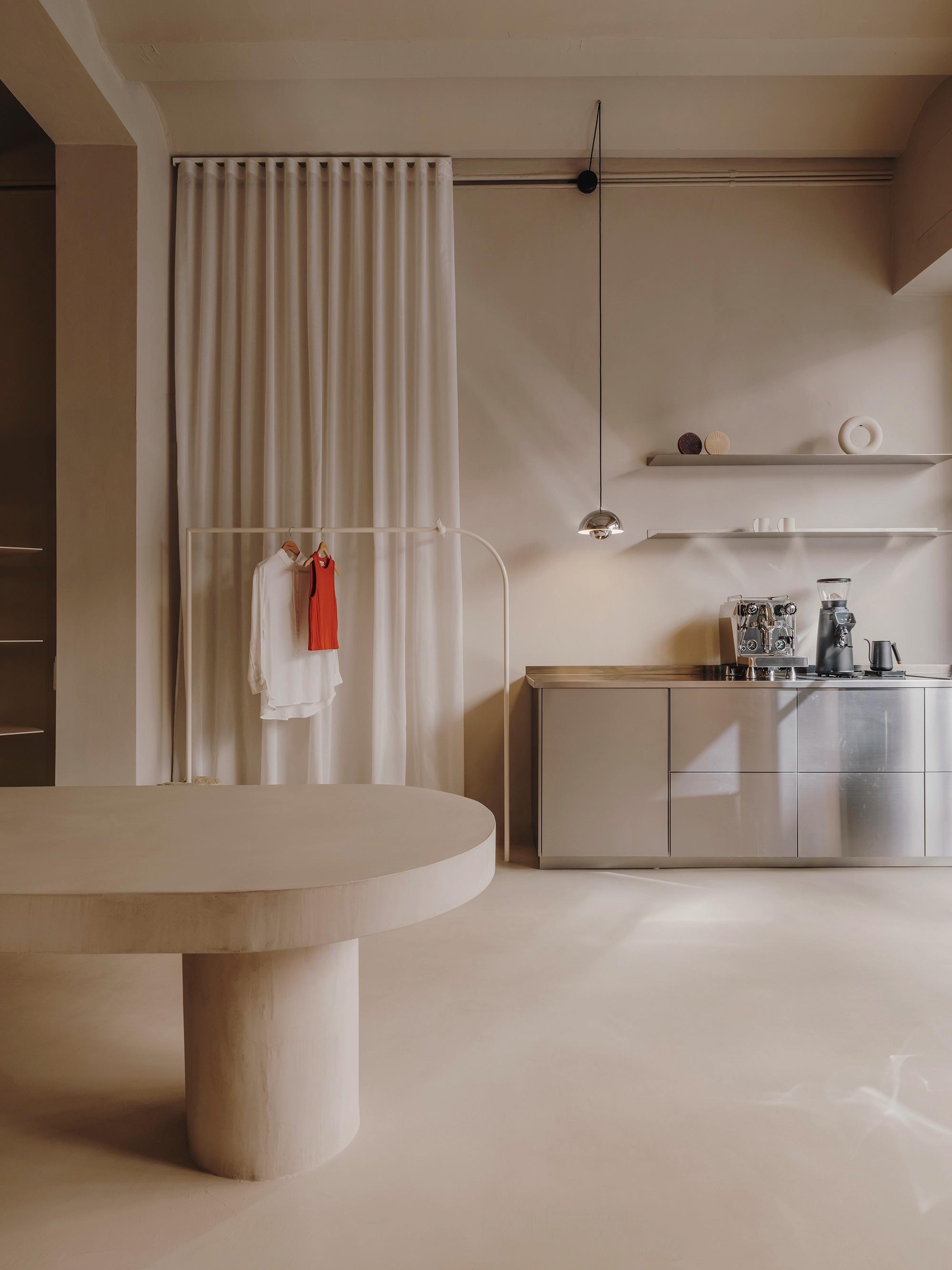 After crossing the tunnel, the user enters a space of the store whose main aesthetic is that of a dreamlike place, outside of what one is accustomed to seeing in the real world. Located in Barcelona, a city of constant movement and exchange, the store includes an area for events and presentations. Curved stands are designed that resemble those of an amphitheatre. A large circular opening in the ceiling radiates a subtle light using a backlit fabric, contributing to this idea of creating a dream space. Underneath this zenital light is a sculpture by Sara Regal that functions as an exhibition coffee table. This piece was created from the rubble generated after the renovation, once again emphasizing the principles of sustainability that represent the brand.