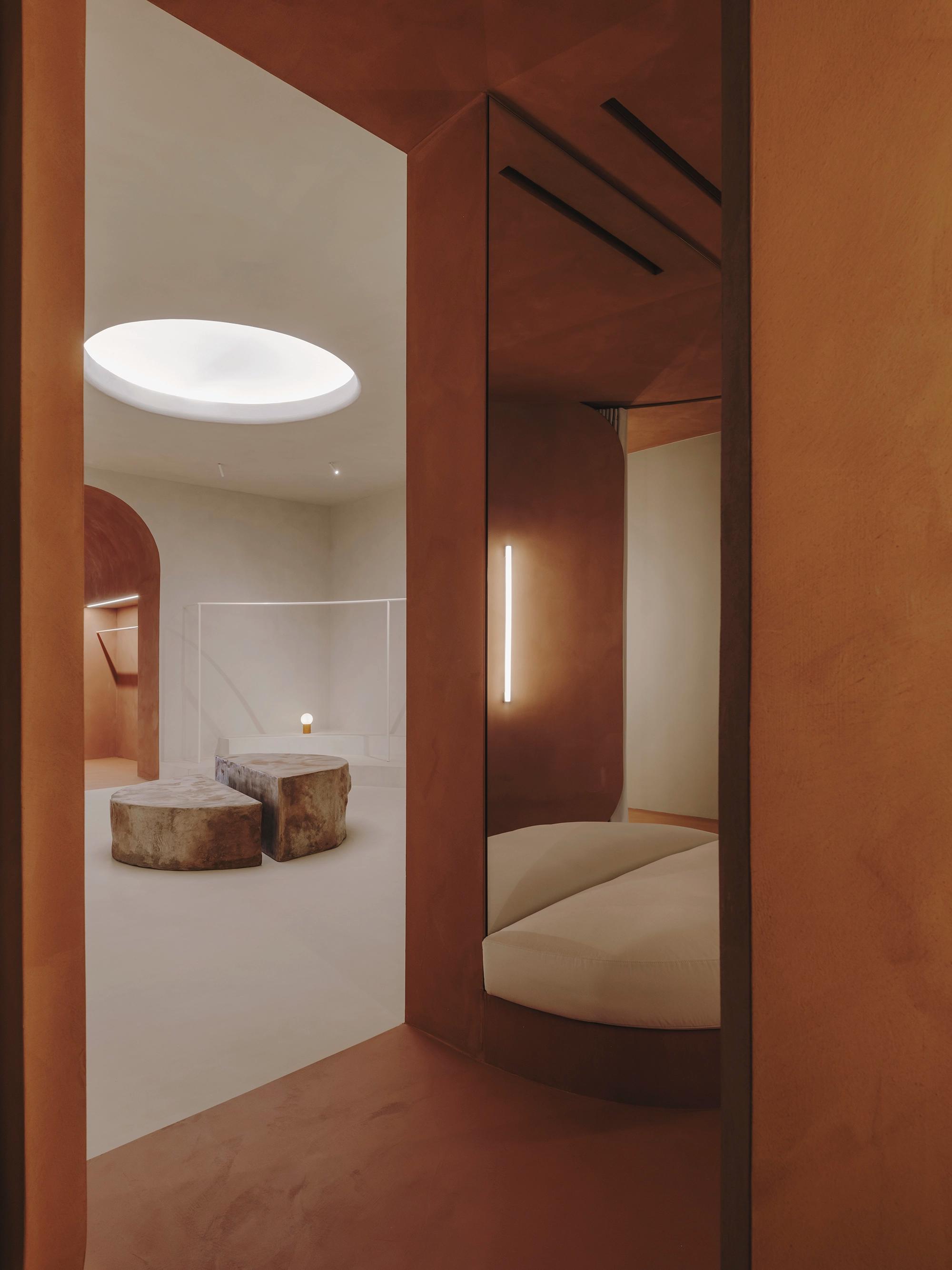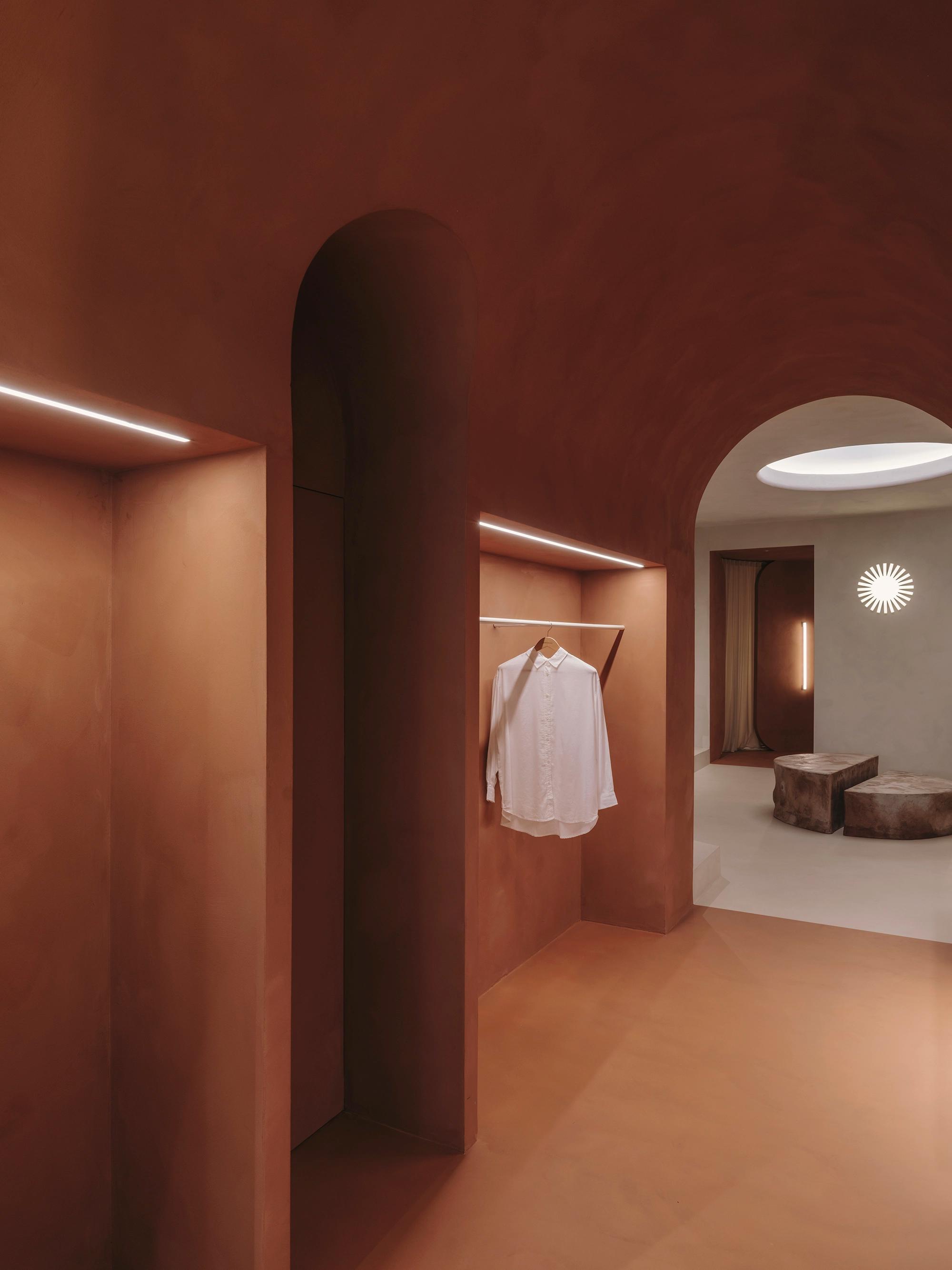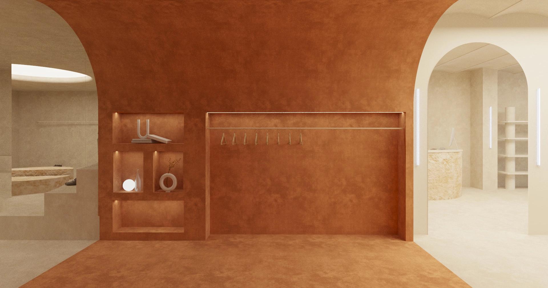 As you move towards the main area of the store, you can see custom-designed display elements. Like the products sold by the brand, all the furniture in the store is conceived as a work of art, elements that not only serve a practical function but are also sculptural pieces. As you pass through the main area of the store, you can see an enveloping tunnel that transitions to the next space. This tunnel stands out for its terracotta finish, a color that will be repeated in various elements of the space to generate continuity.