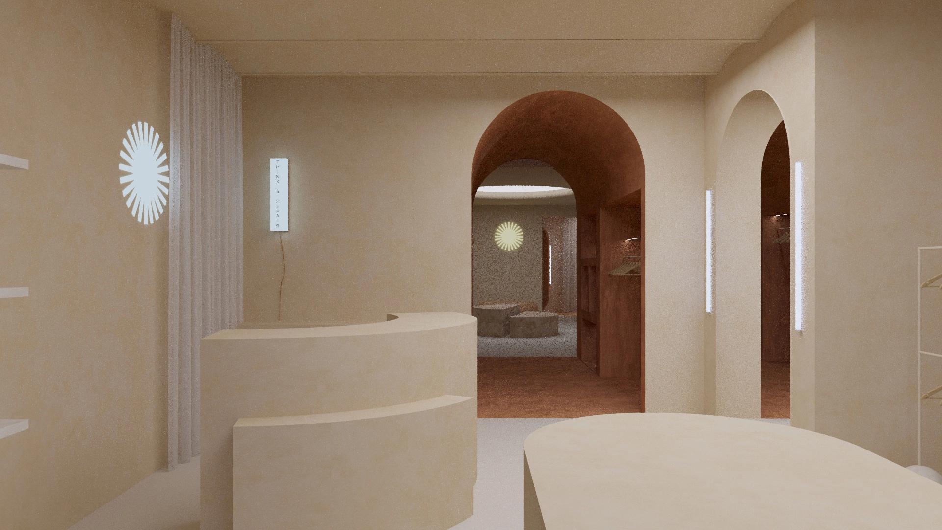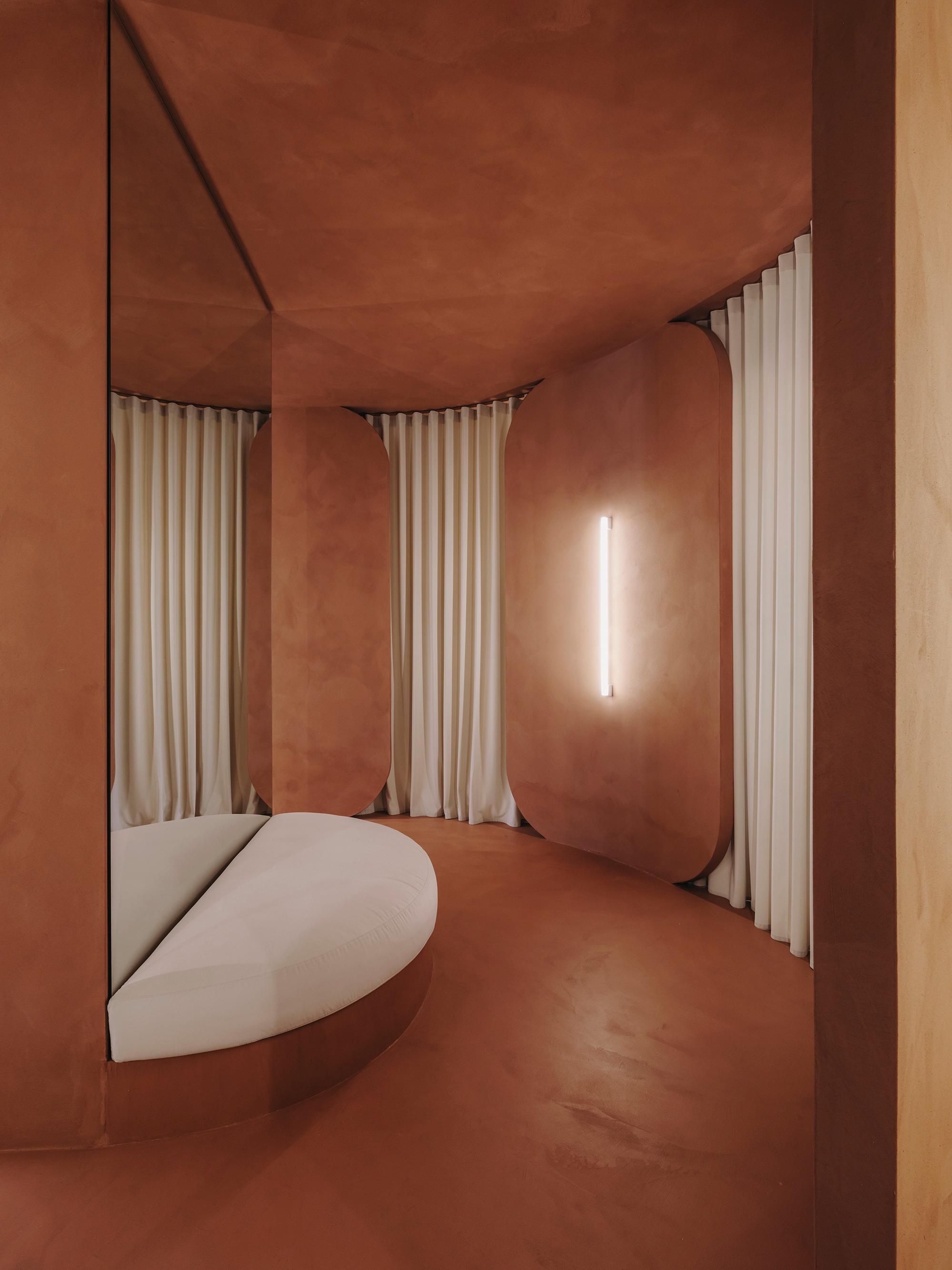 In this case, the terracotta finish is achieved using a clay mortar paint, it is a sustainable product with much less environmental impact than conventional paint. From the other side of the tunnel, you can see a mirror that seems to replicate the tunnel through its reflection, thus bringing infinity to the space. It is the combination of colour along with the dreamlike shape that the tunnel offers us the details that manage to make the space not only serve to display a product but also generate a sensory experience for those who visit it. A space that allows exploration, the play of perception and imagination.