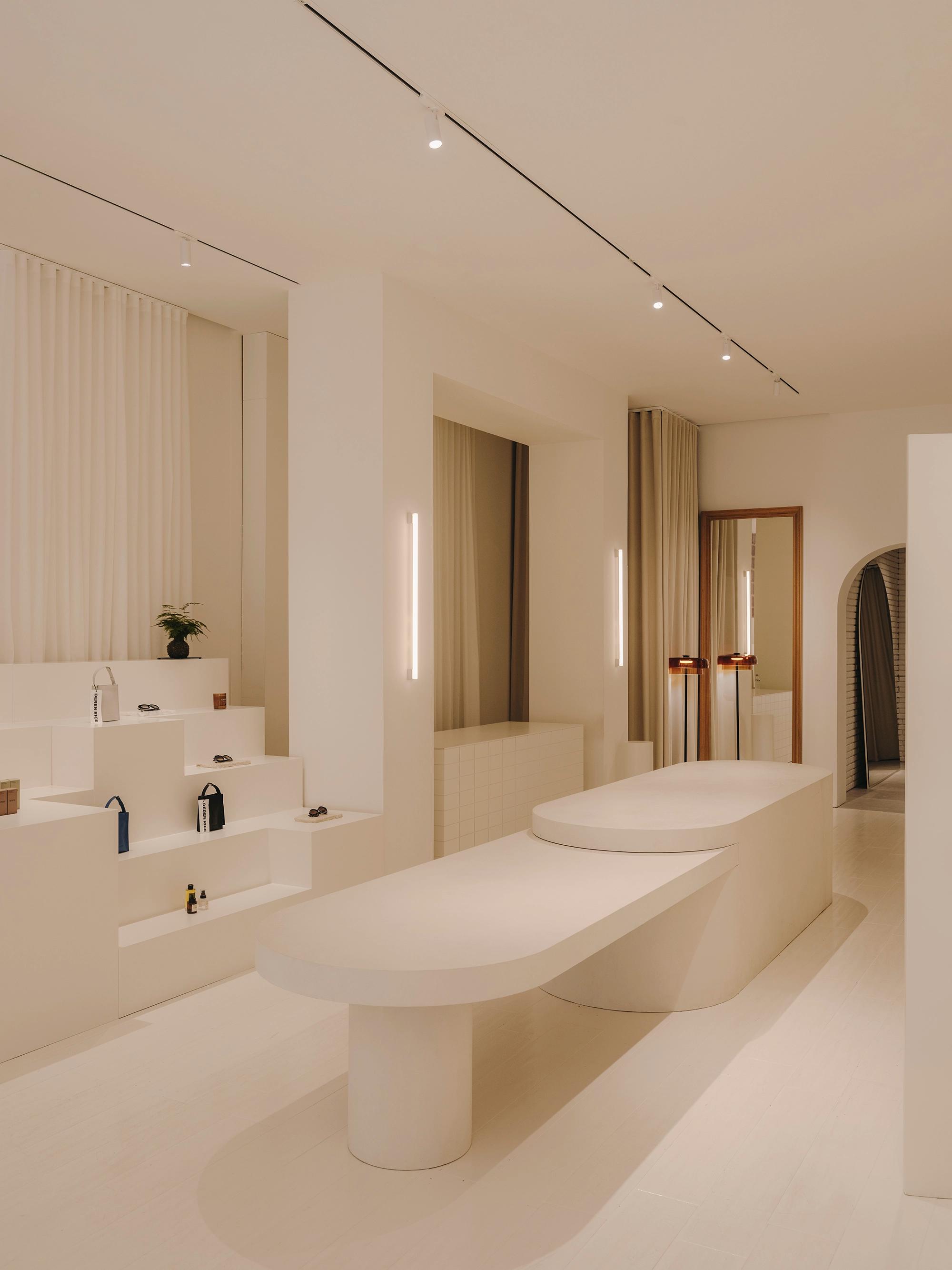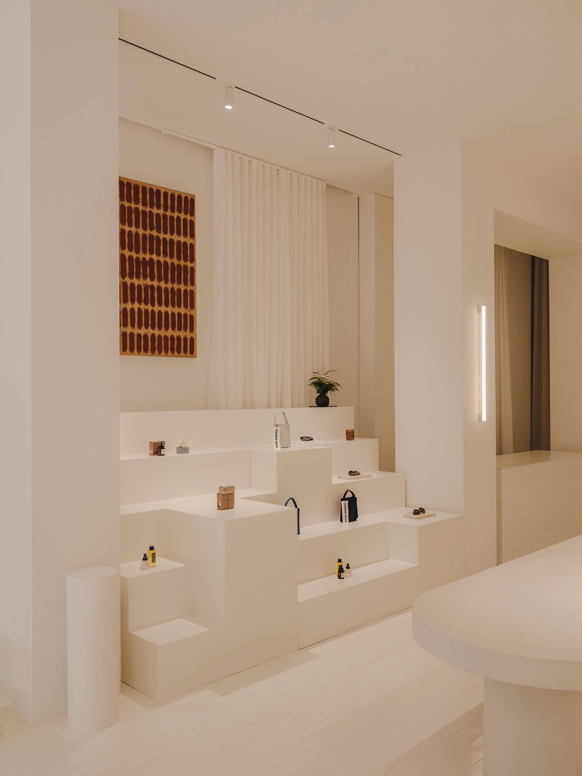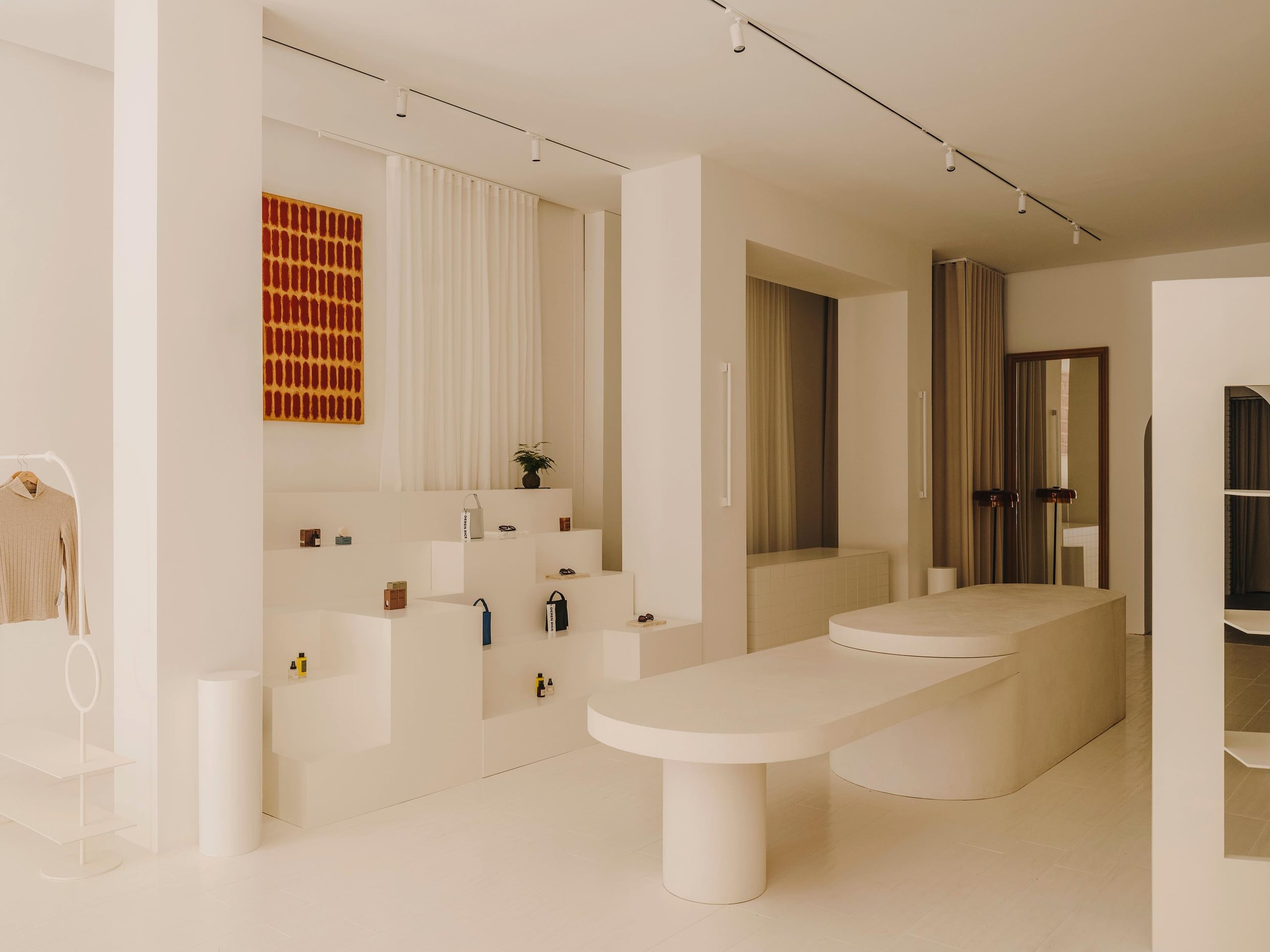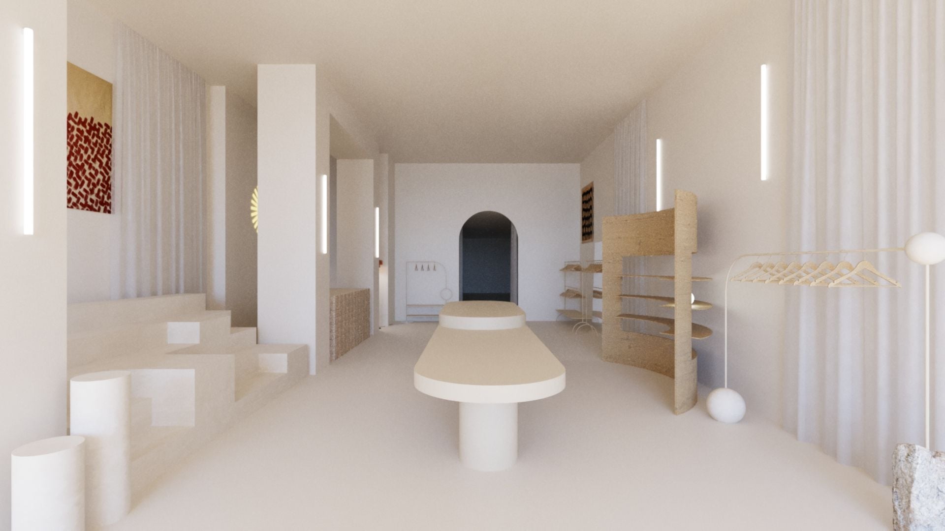 The actual collection"For the love of art", wants to show that as a brand they invest time and effort in things they love without expecting anything in return. And the concept of the space aims to portray this message through its design. A space that conveys this mission by treating each piece as a work of art, a sculpture made by local artisans. A collaboration between the design, manufacture and use of each item. Reaffirming the message through collaborations with other brands and artists who have this same passion as Rowse Beauty, GIGIStudios, Olend, Deren Rice, Omote Sando, Alejo Palacios with his paintings that can be found in Alzueta Gallery.