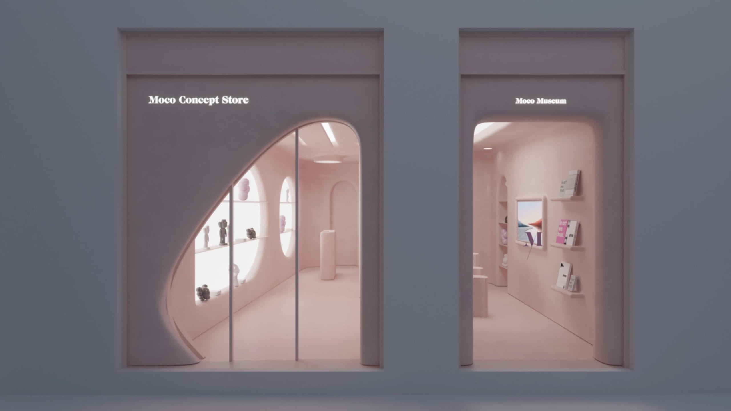 Al ingresar en la tienda, los visitantes se sumergen en un espacio con un perímetro dinámico, que delimita los espacios y donde la envolvente (paredes, techo y pavimento) genera huecos, nichos y bases para la exposición e integrar la iluminación. Una materialidad característica e innovadora, su interior es monocromático, acabado en microcemento rosa, el color característico Moco Museum. Uno de los mayores atractivos es este interior dinámico, pero revestido con un mismo material y un mismo color (suelos, paredes, mobiliario...) Al tener una textura y un color uniforme nos permite entender el espacio como una forma única y destacar el producto expuesto.
