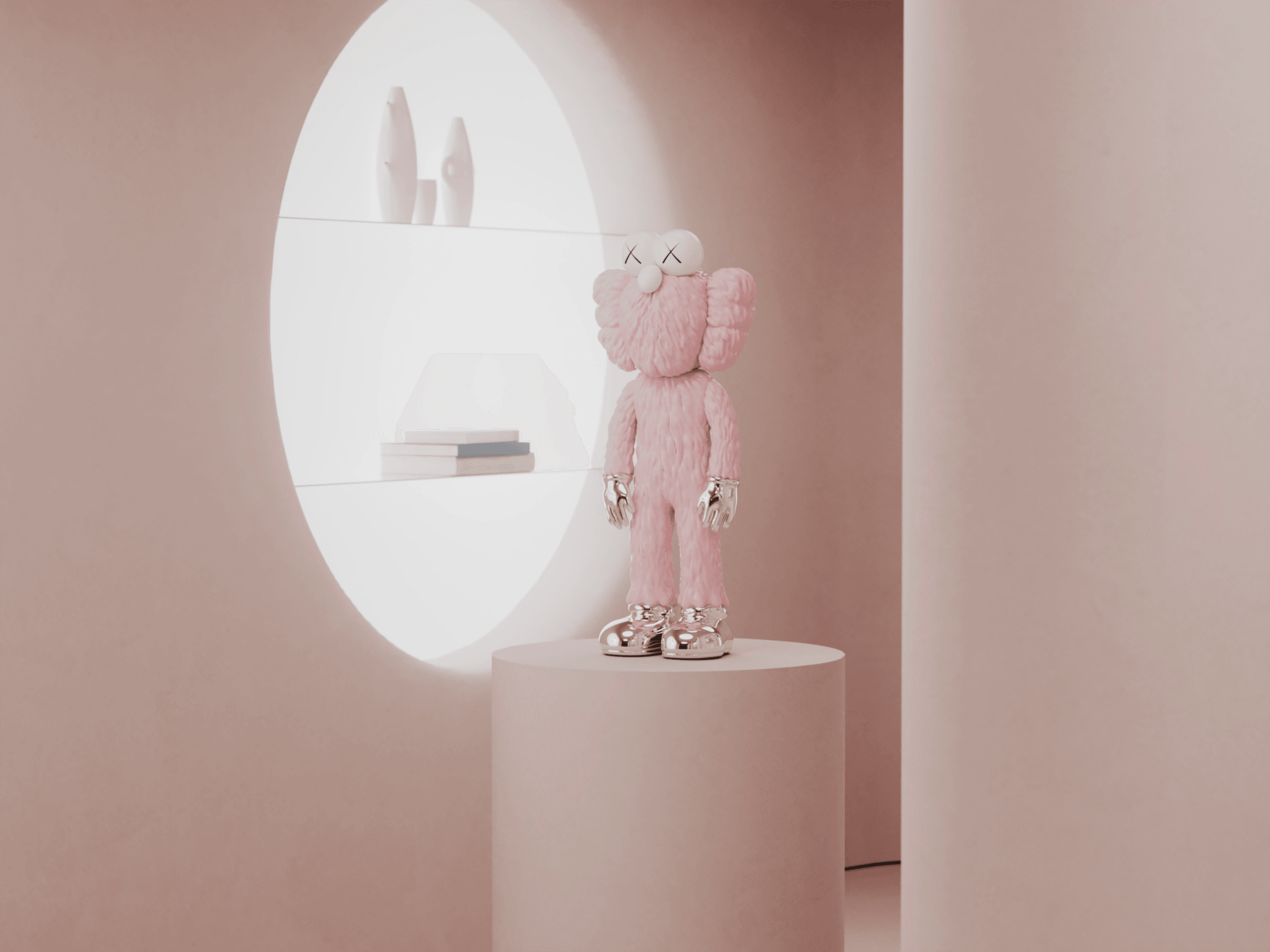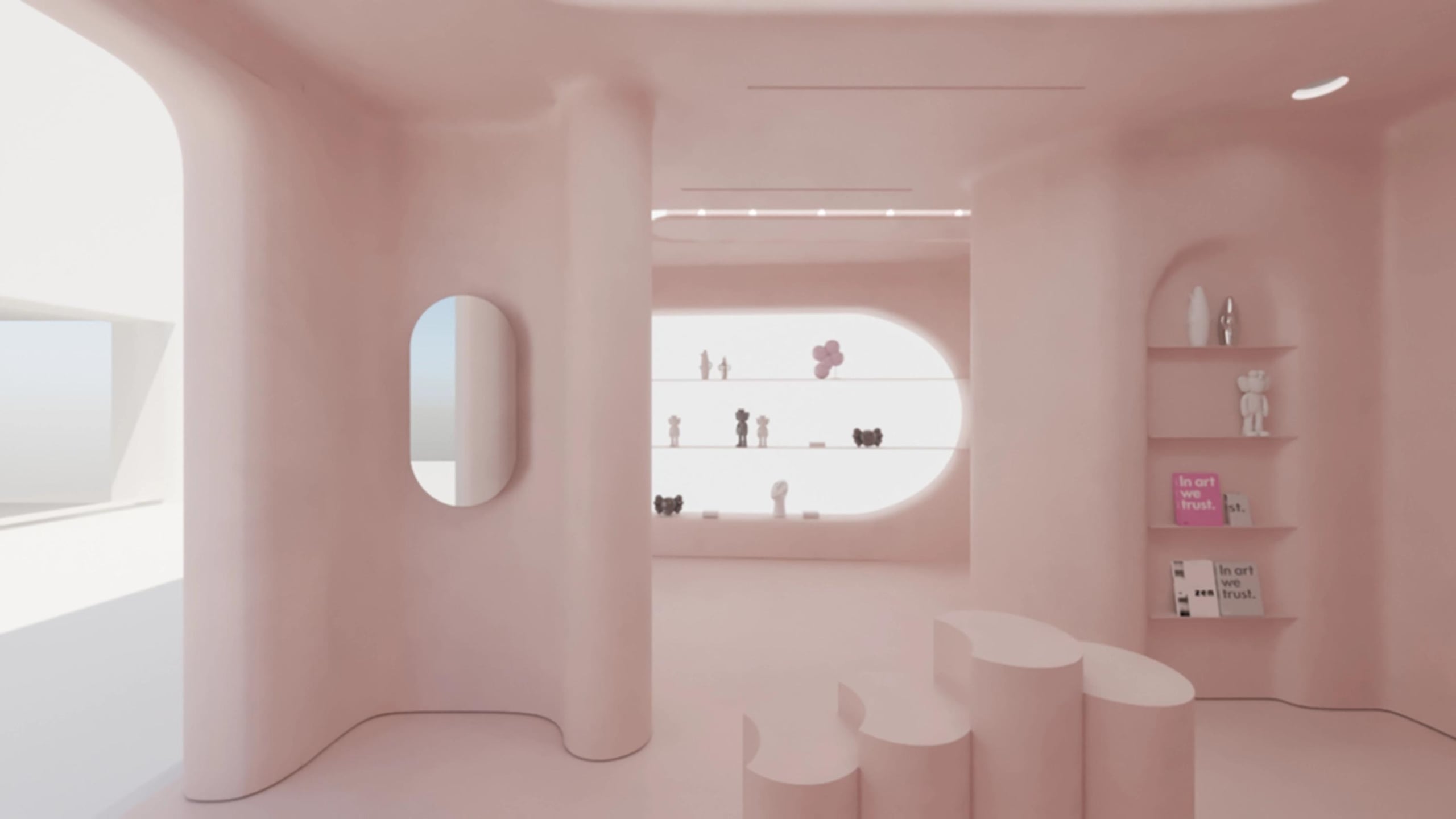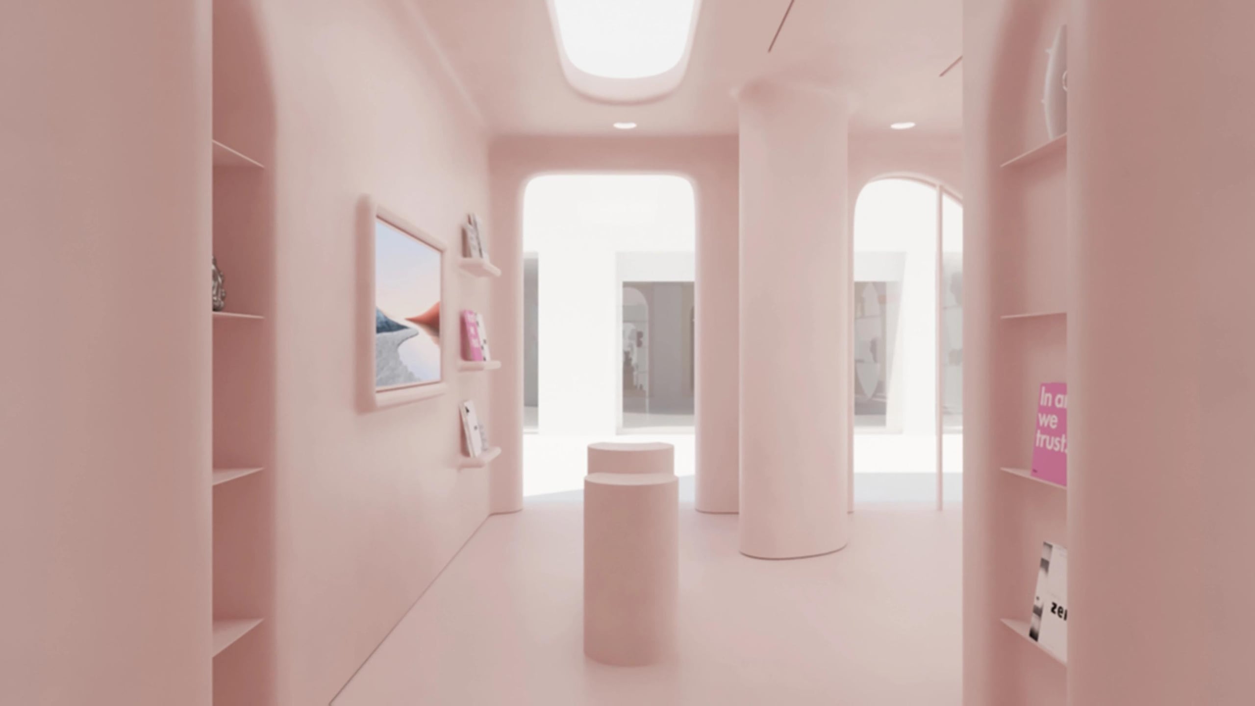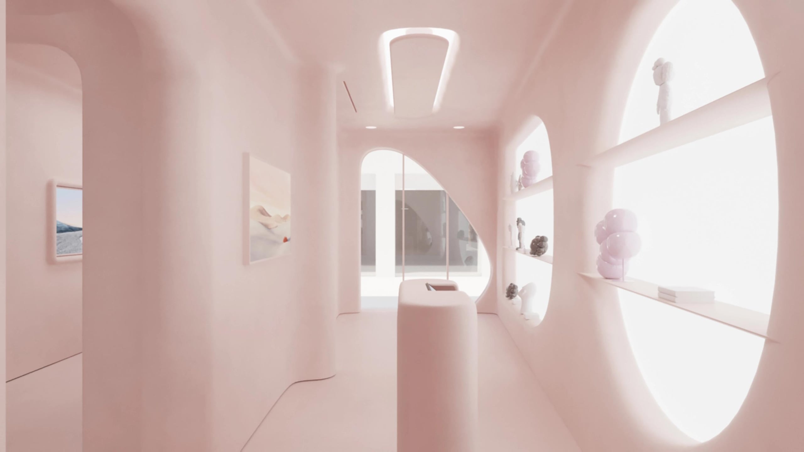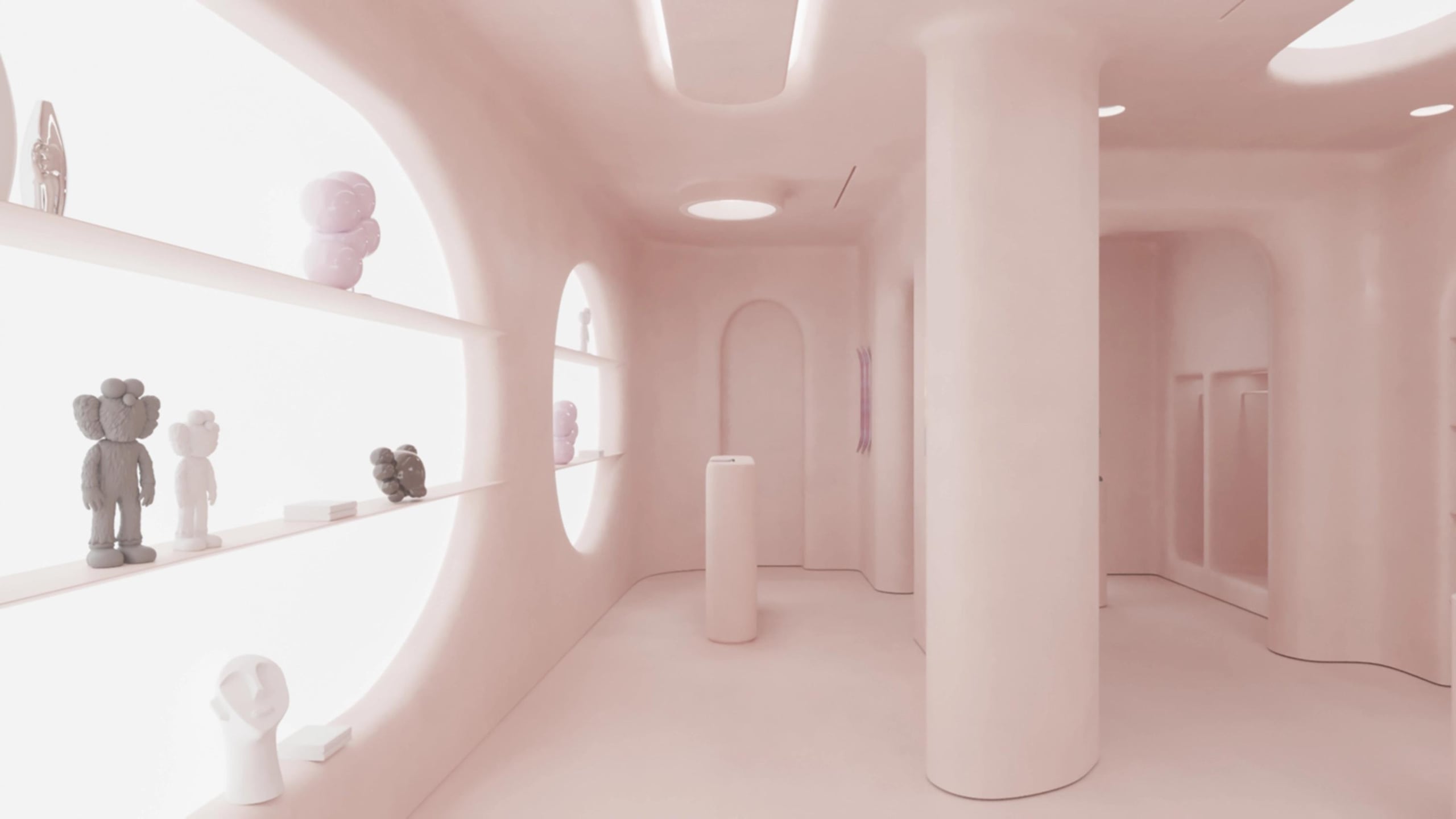 Al entrar a la tienda nos encontramos elementos característicos de la estética del metaverso y el lenguaje visual del estudio Six N. Five, formas orgánicas, curvas y arcos que conforman un espacio minimalista y surreal, fondo para los objetos de exposición y donde el arte es el protagonista. La fachada contrasta en su entorno. Un interior iluminado, rosa y orgánico llama la atención des de la calle Montcada, una típica calle estrecha del borne. Dos aperturas con contornos orgánicas invitan a recorrer este concept store, una más rectangular actúa como aparador ya que ofrece una visión más amplia de su interior y la otra funciona como entrada.