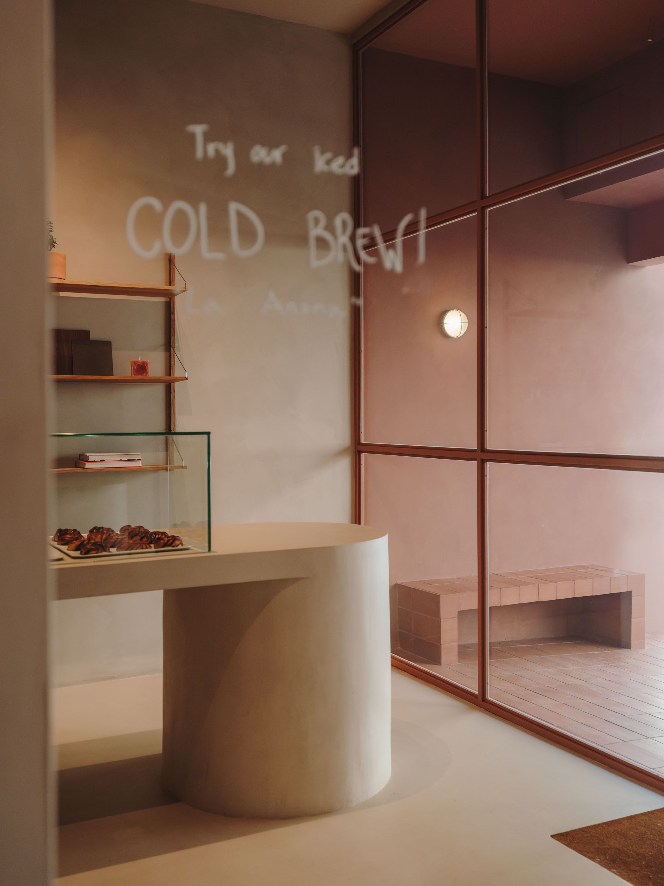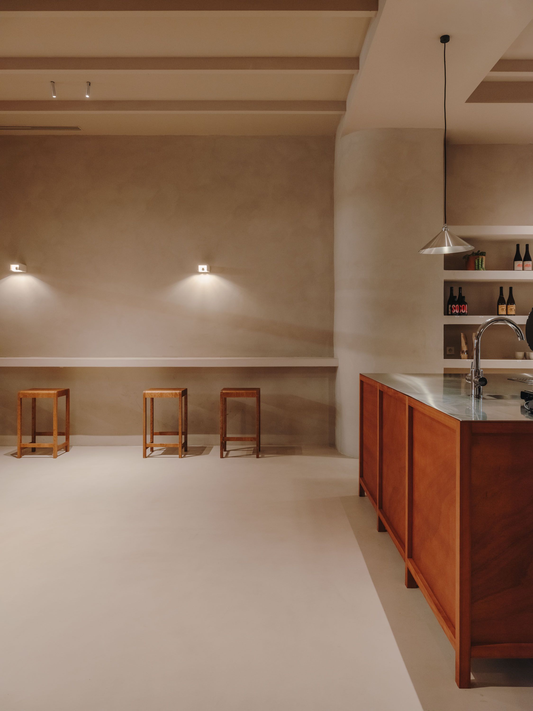 La capa arquitectónica monocolor en tonos tierra evoca el color del trigo, mientras que las paredes de ecoclay, aplicadas manualmente, añaden textura y matices únicos. Al final de la tienda se encuentra un ágorá donde los usuarios pueden probar los productos. Ya sea en una barra alta de obra microcementada con taburetes de Frama o en una amplia grada de obra con ventanales que permiten observar a los panaderos en acción, creando una experiencia inmersiva. Esta zona esta iluminada con apliques de Serax, una luminaria de hormigon con una forma muy geometrica.