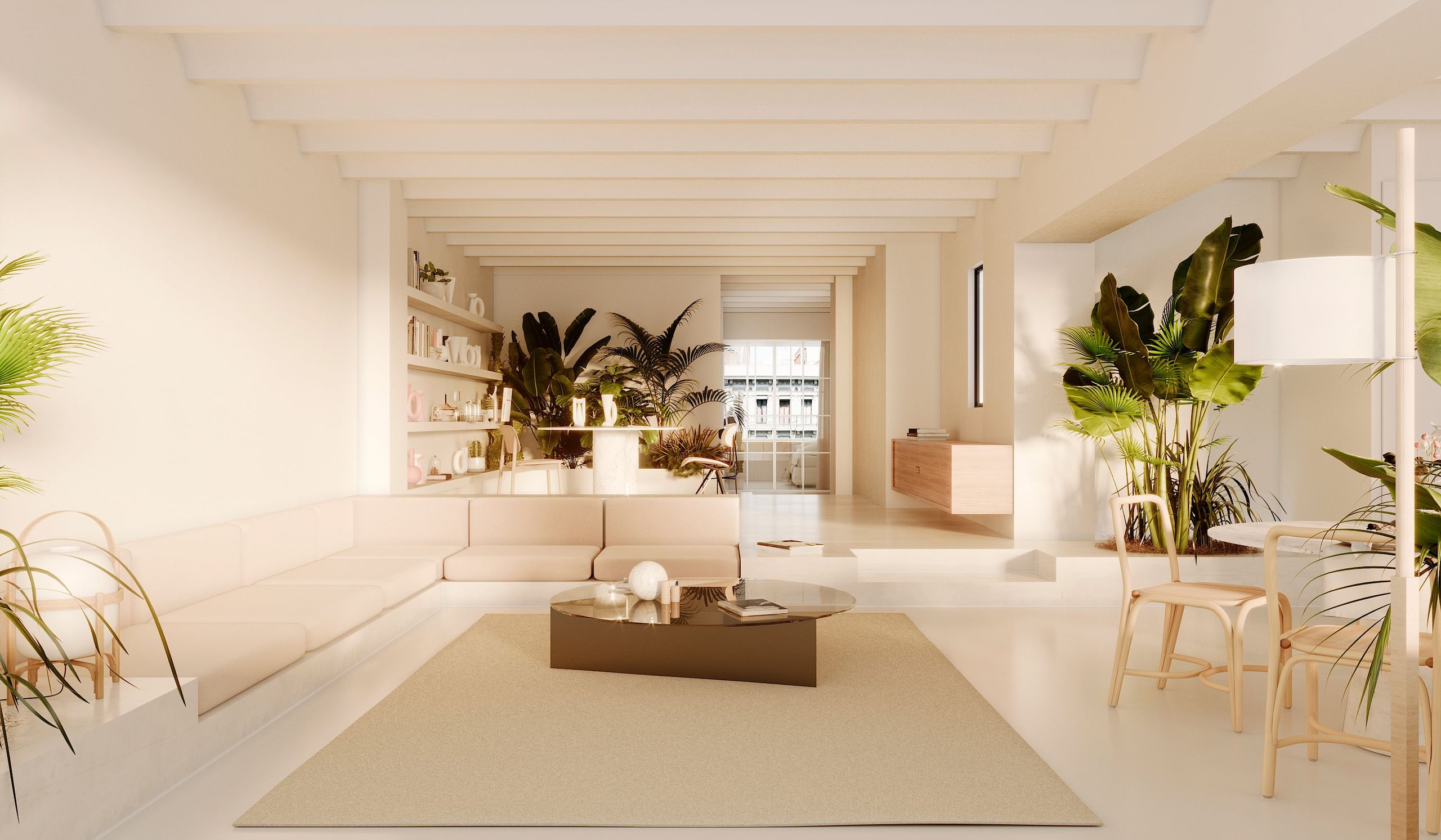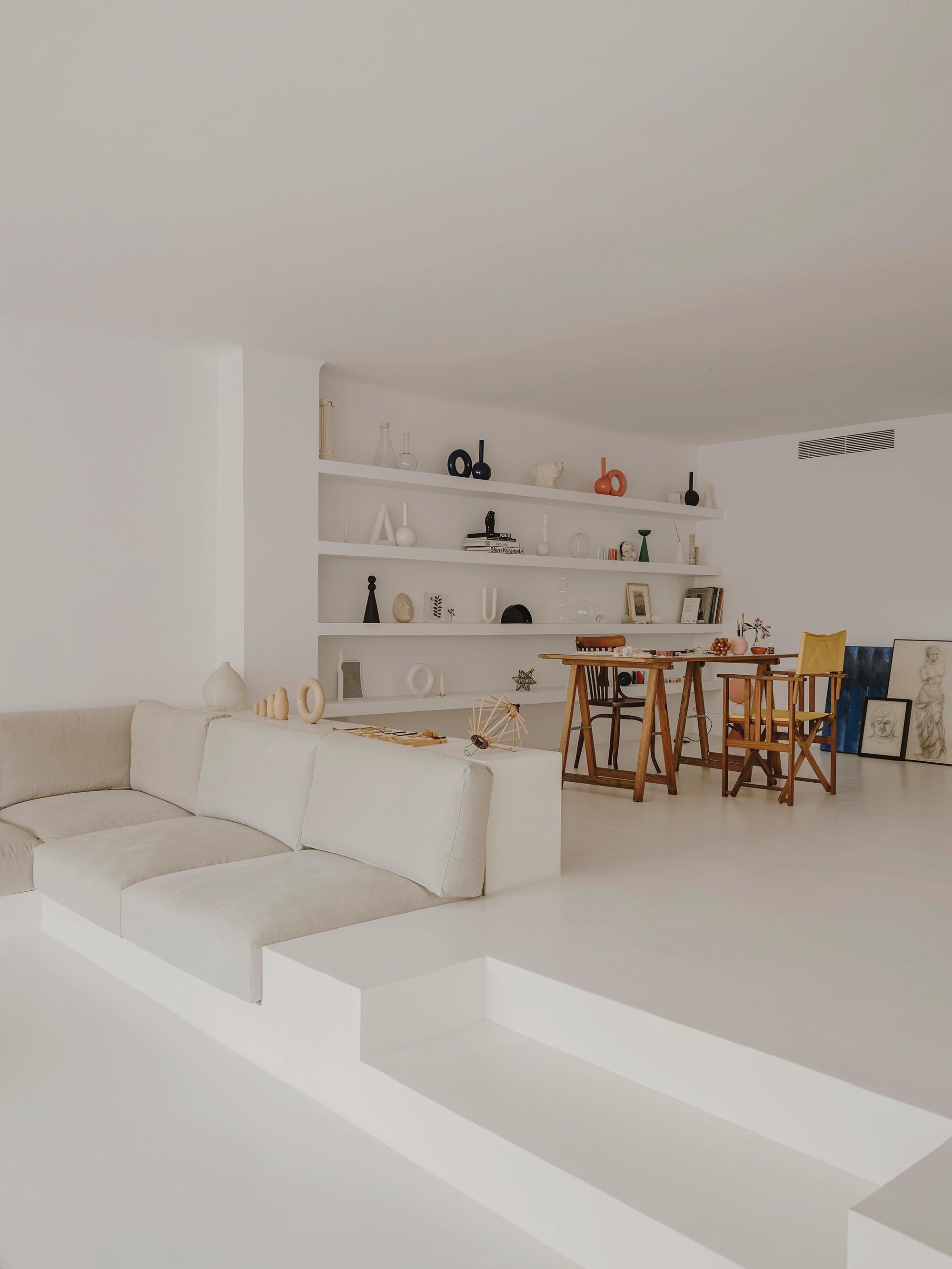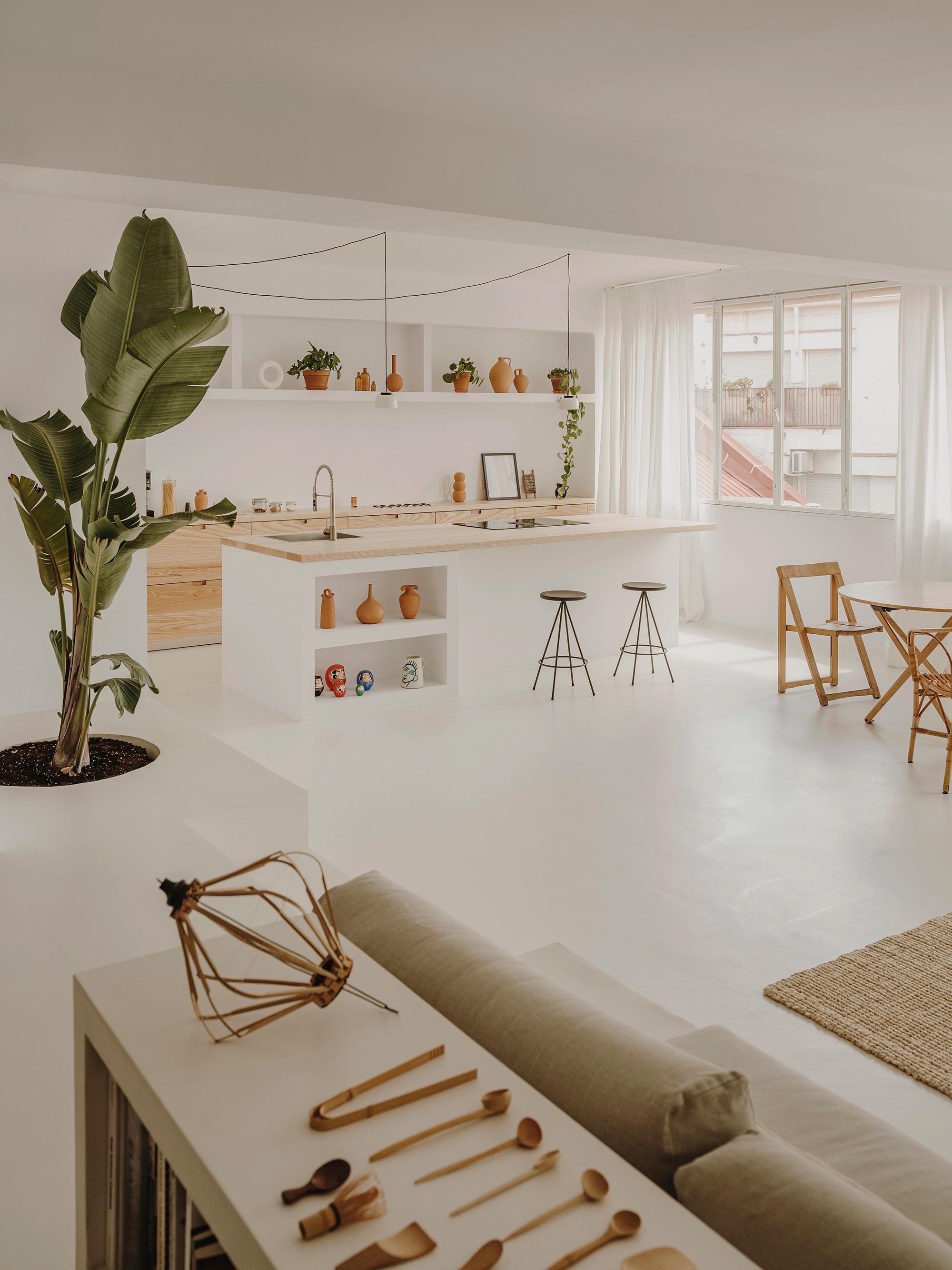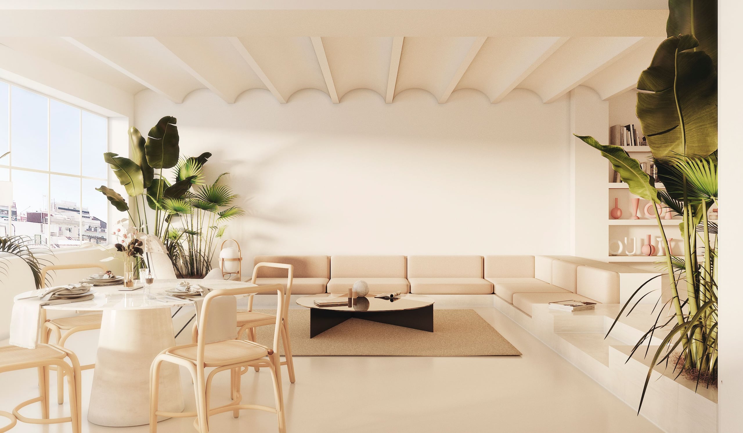 A very architectural project is suggested where the change of elevation of the central space is turned into a sofa with custom-made cushions and at the same time into circular planters with large plants. The floor finish is in microcement in an off-white color that unifies all areas of the house. We wanted something very neutral and warm at the same time, that would work as an endless space for Valeria's photos.
