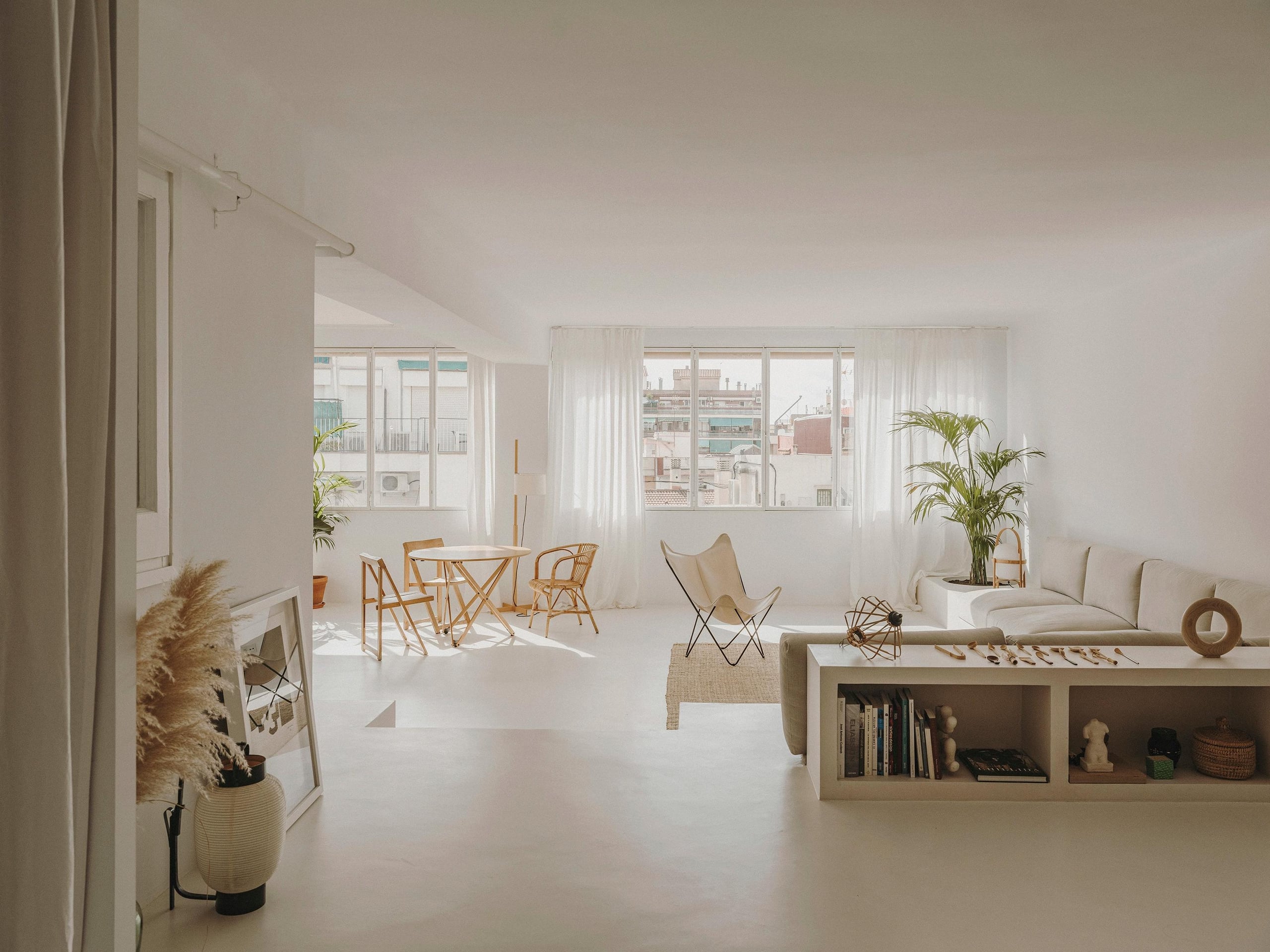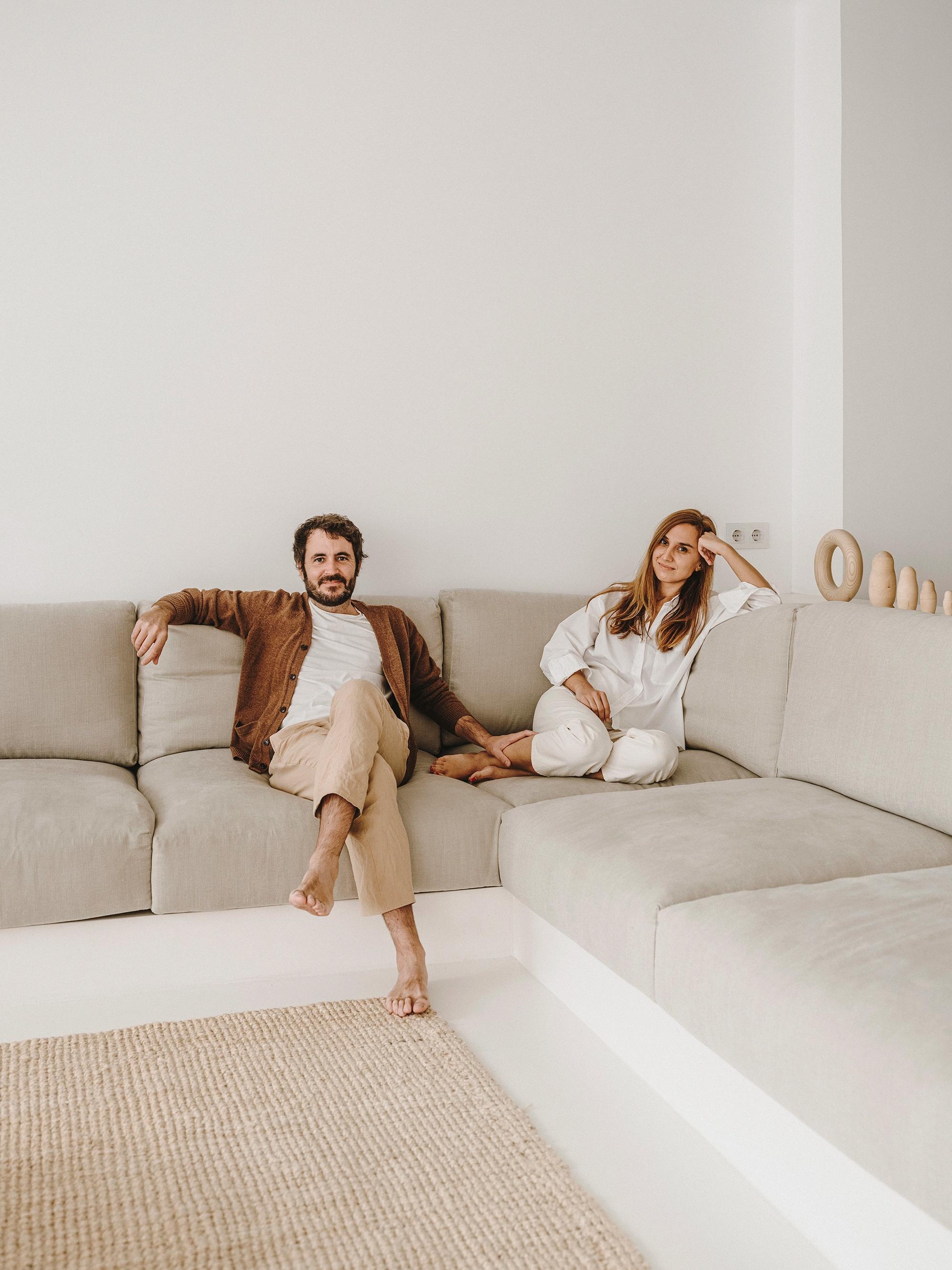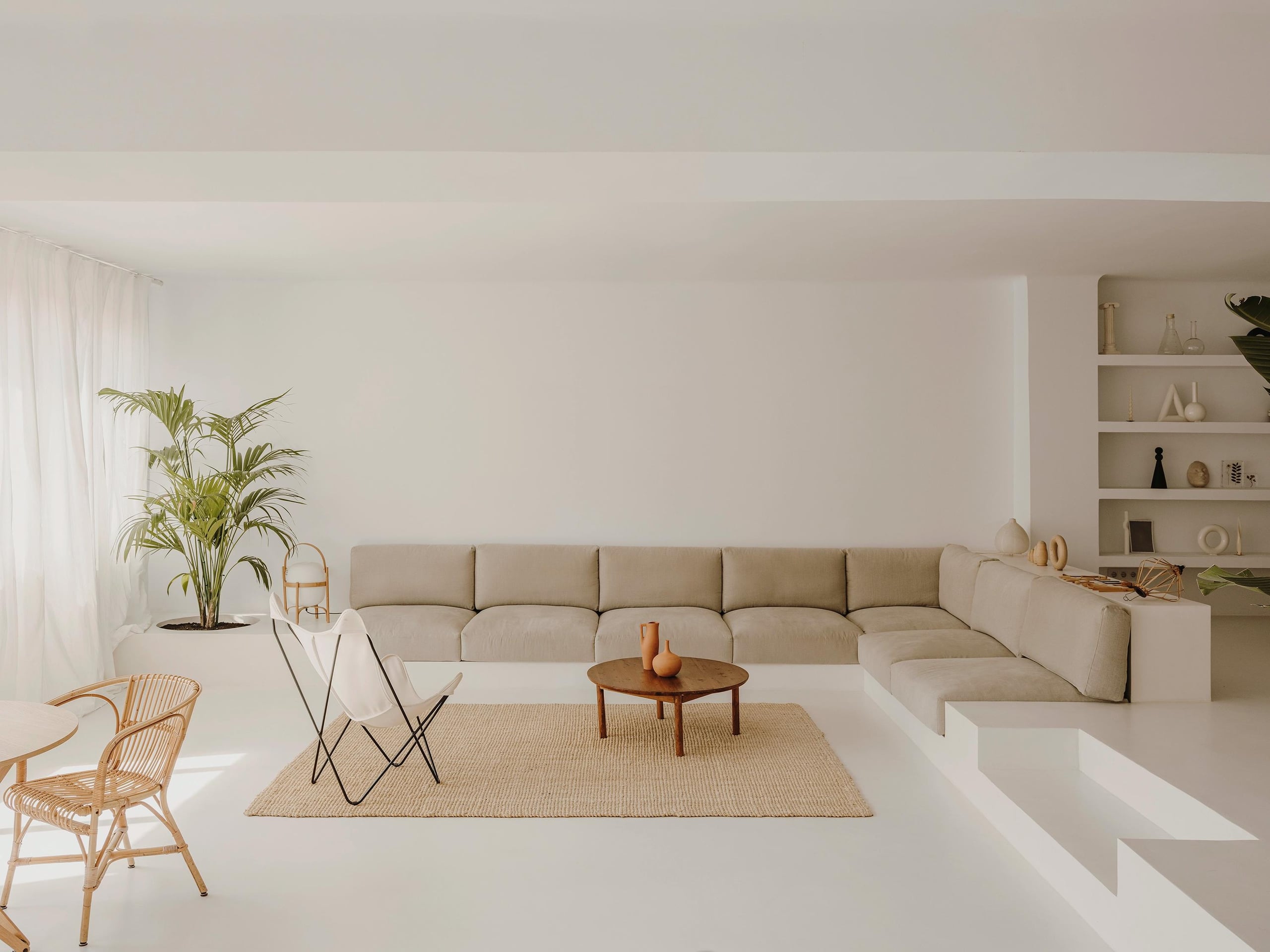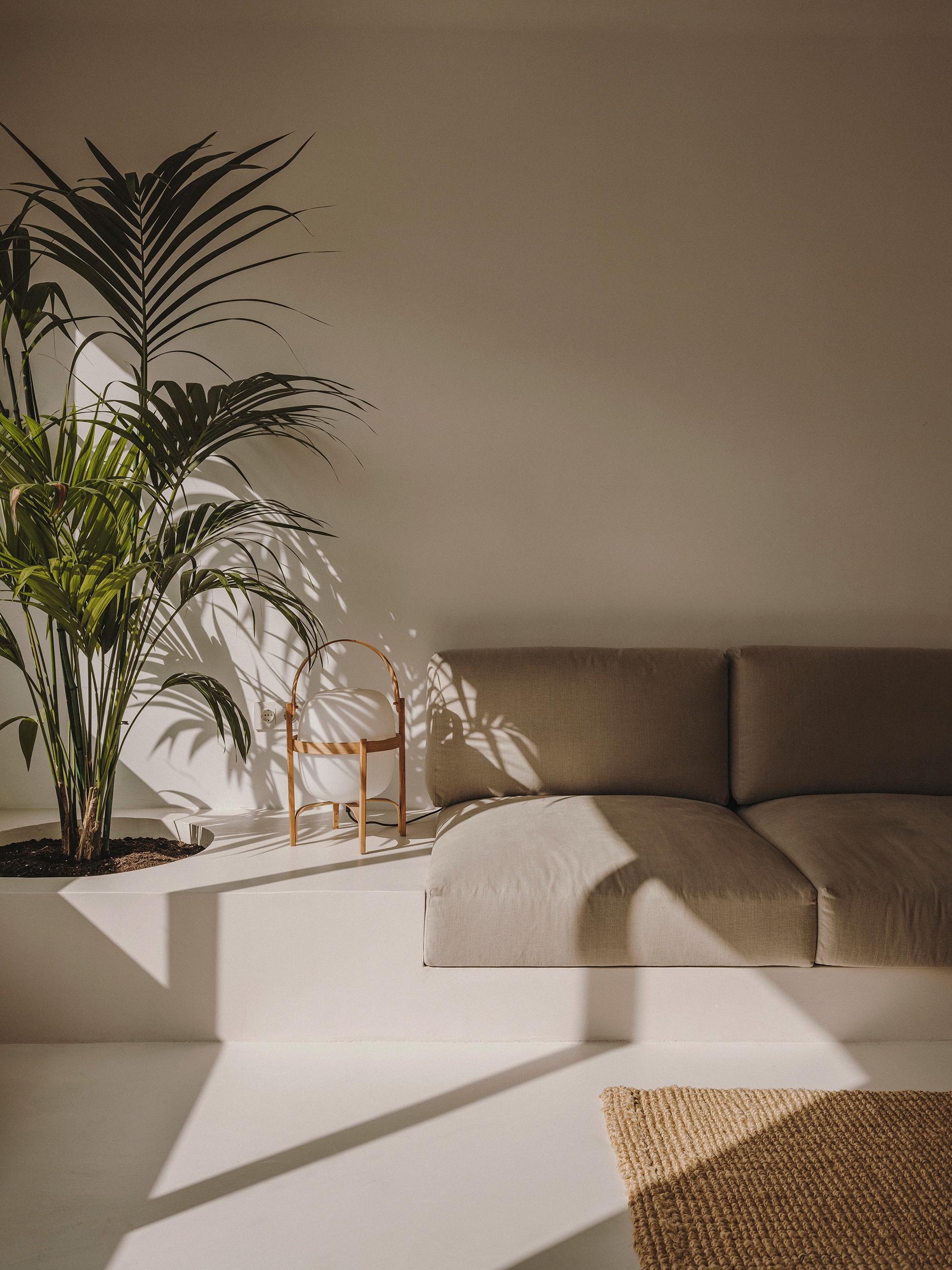 A very architectural project is suggested where the change of elevation of the central space is turned into a sofa with custom-made cushions and at the same time into circular planters with large plants. The floor finish is in microcement in an off-white color that unifies all areas of the house. We wanted something very neutral and warm at the same time, that would work as an endless space for Valeria's photos.