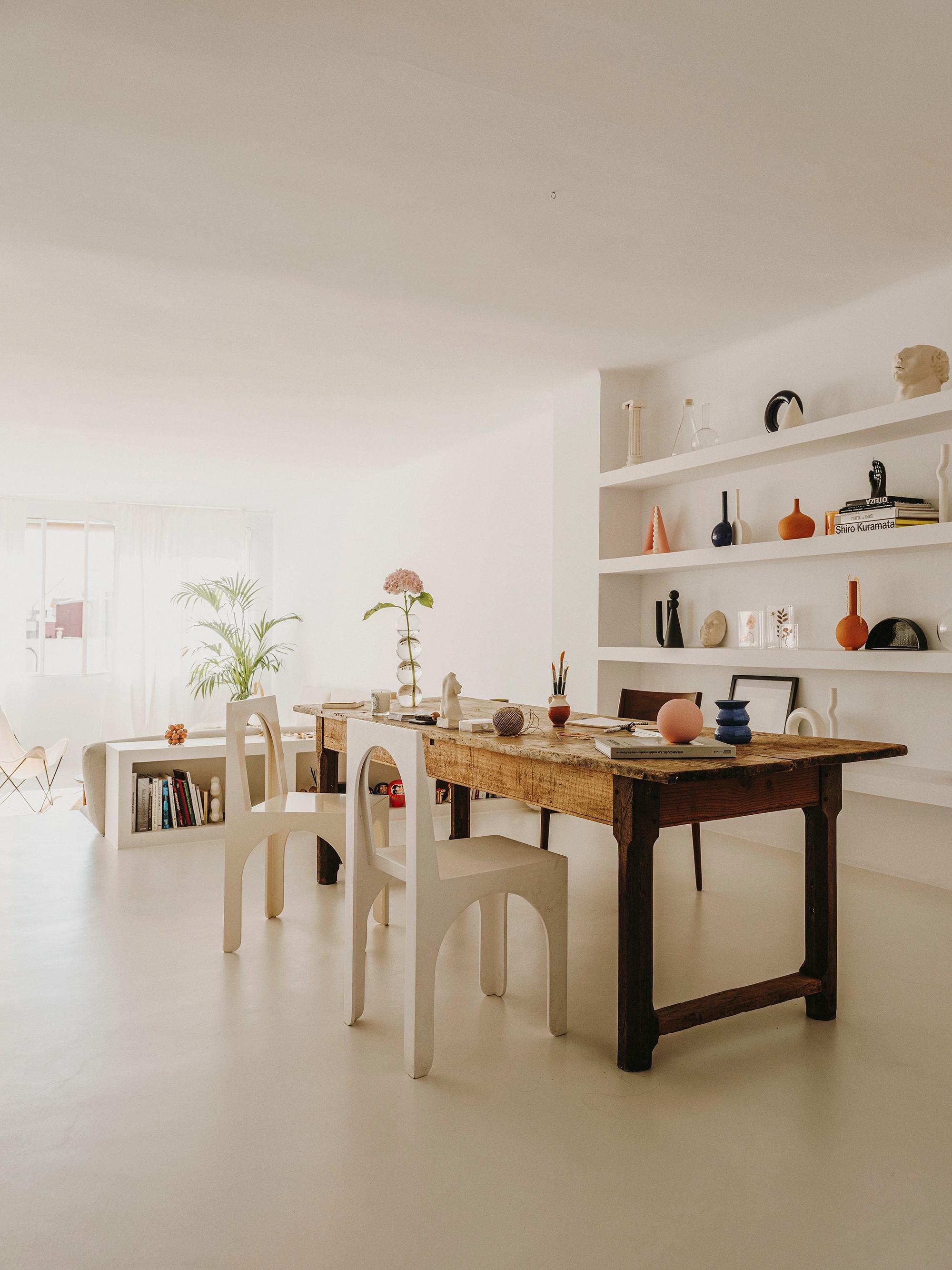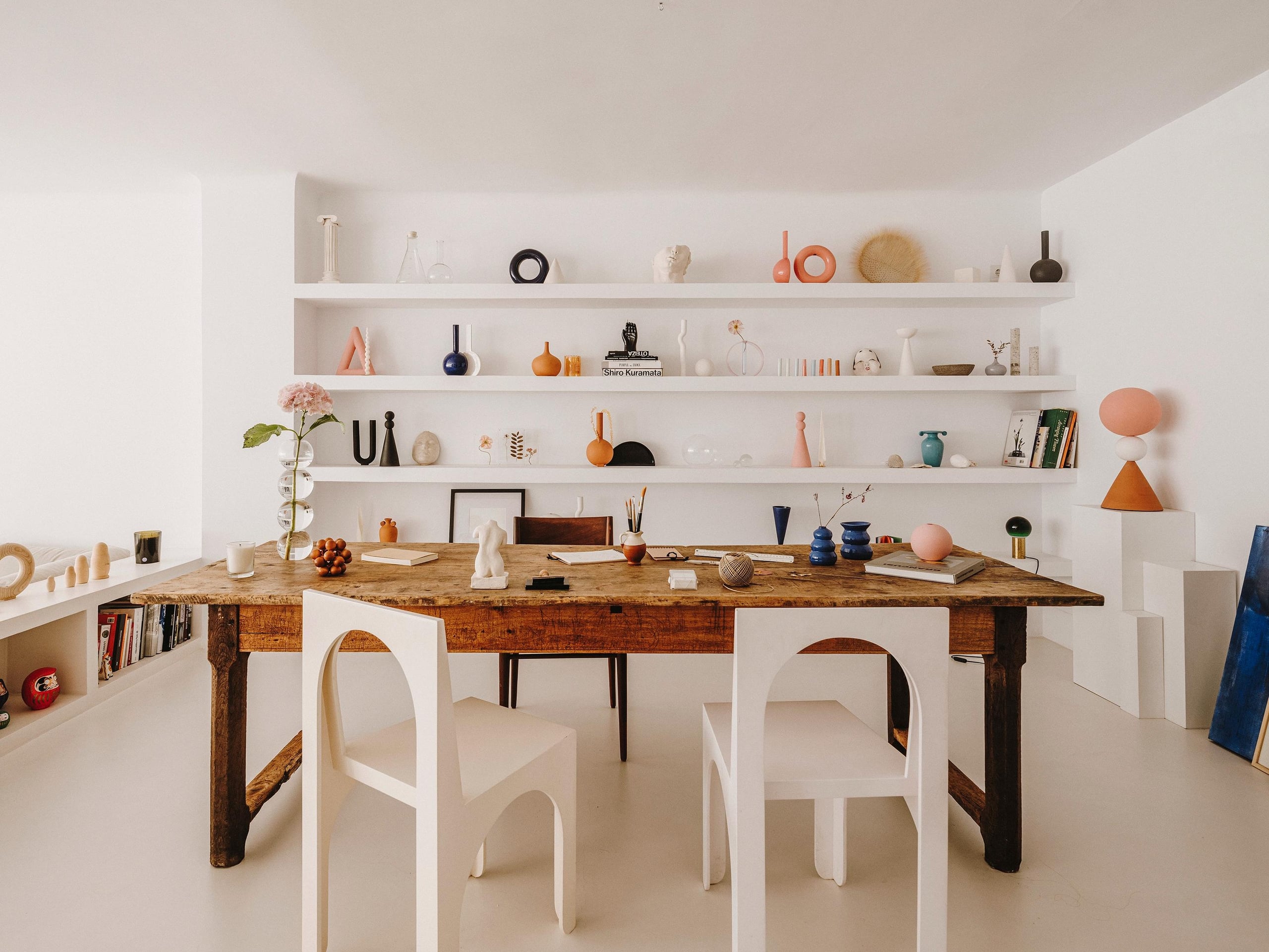 A day area is considered consisting of an open kitchen, dining room and living room, a bathroom and two bedrooms that have to coexist with Valeria Vasi's studio-workshop, where a storage area, a large shelf to display their products and a work table are needed. The first decision was to put the kitchen and living room facing the inner courtyard since it is the quietest area and has sun from nine in the morning until two o'clock in the afternoon. We always enjoyed the idea of having breakfast in the sun.